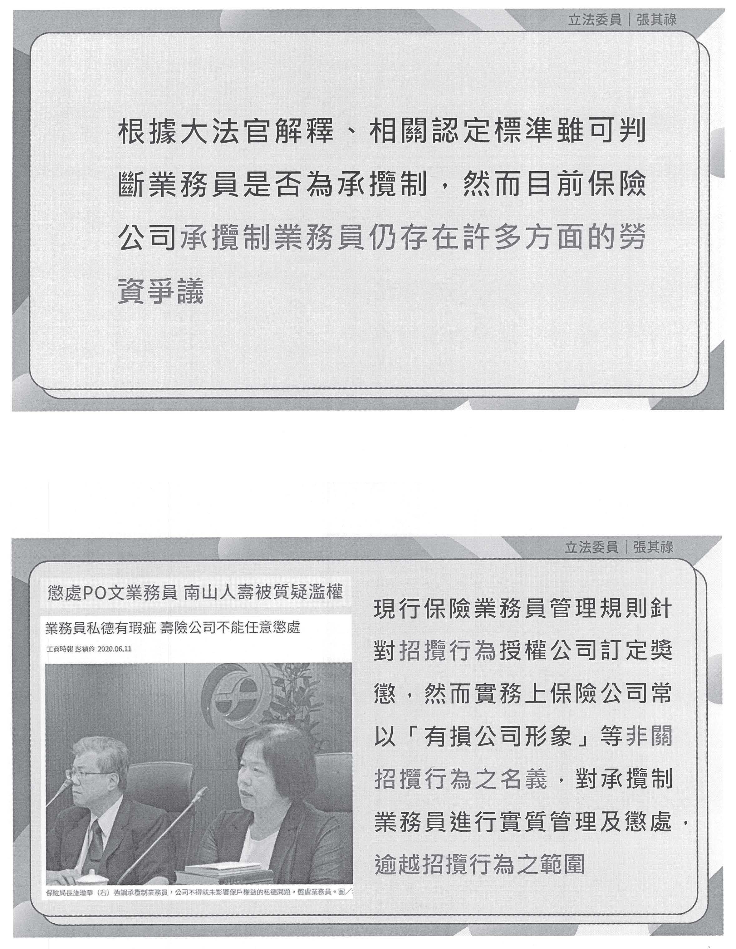當然我們非常支持修法,因為這件事情已經拖了很久,不管是因為不當懲處或是傭金給付,對於用承攬方式員工的不公,我們都會關注到。民眾黨的修法版本已經提交到委員會,同時已經經過一讀,如果有機會的話,也希望召委能夠排審,以期儘速完善法制,確保所有保險從業人員的勞動權益,以上。