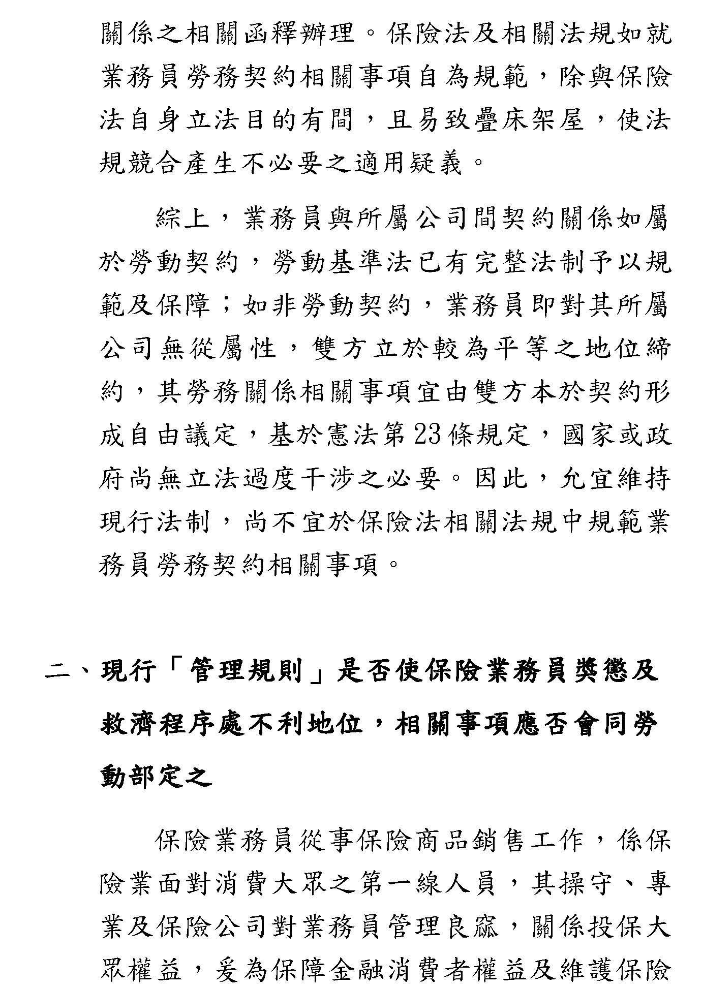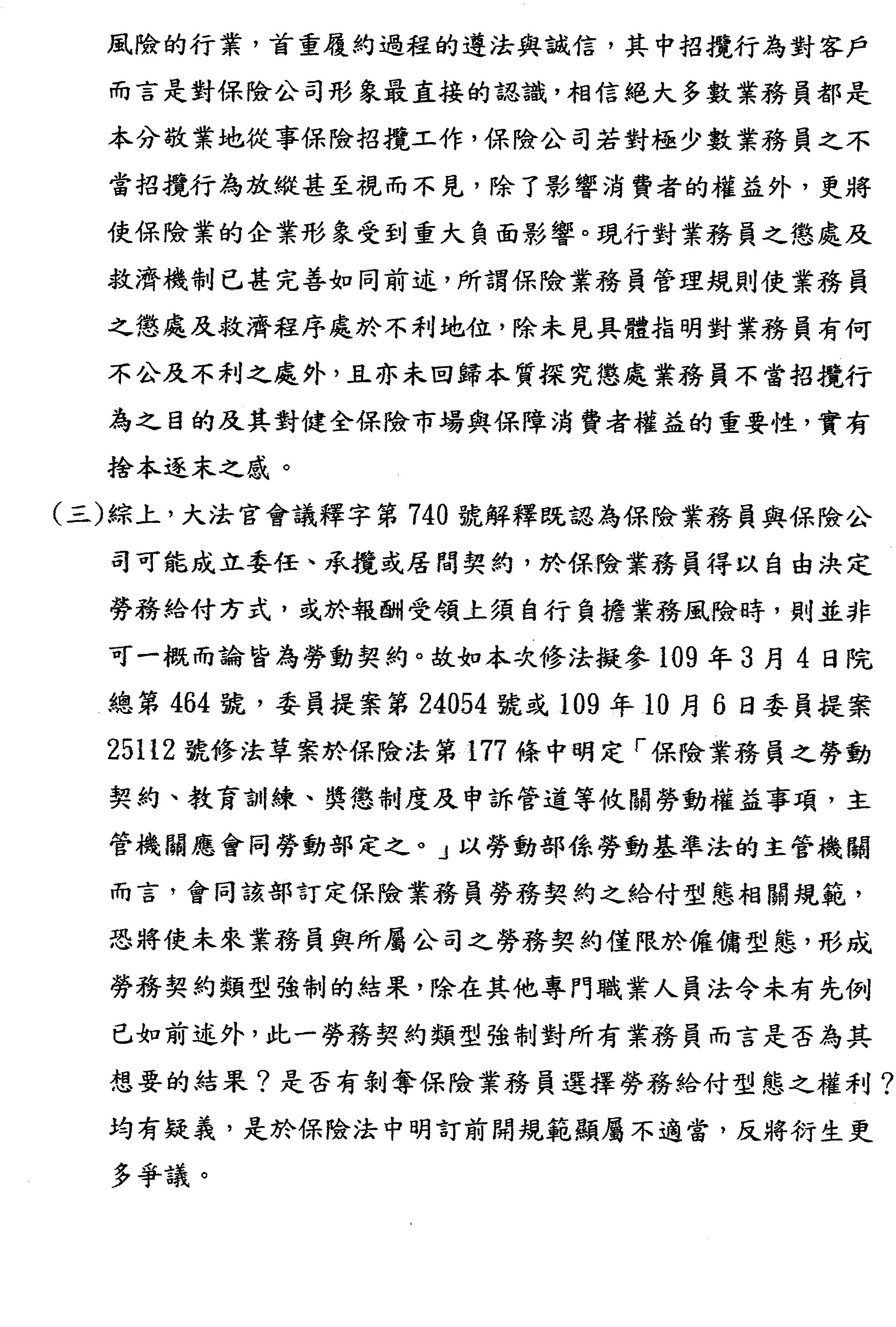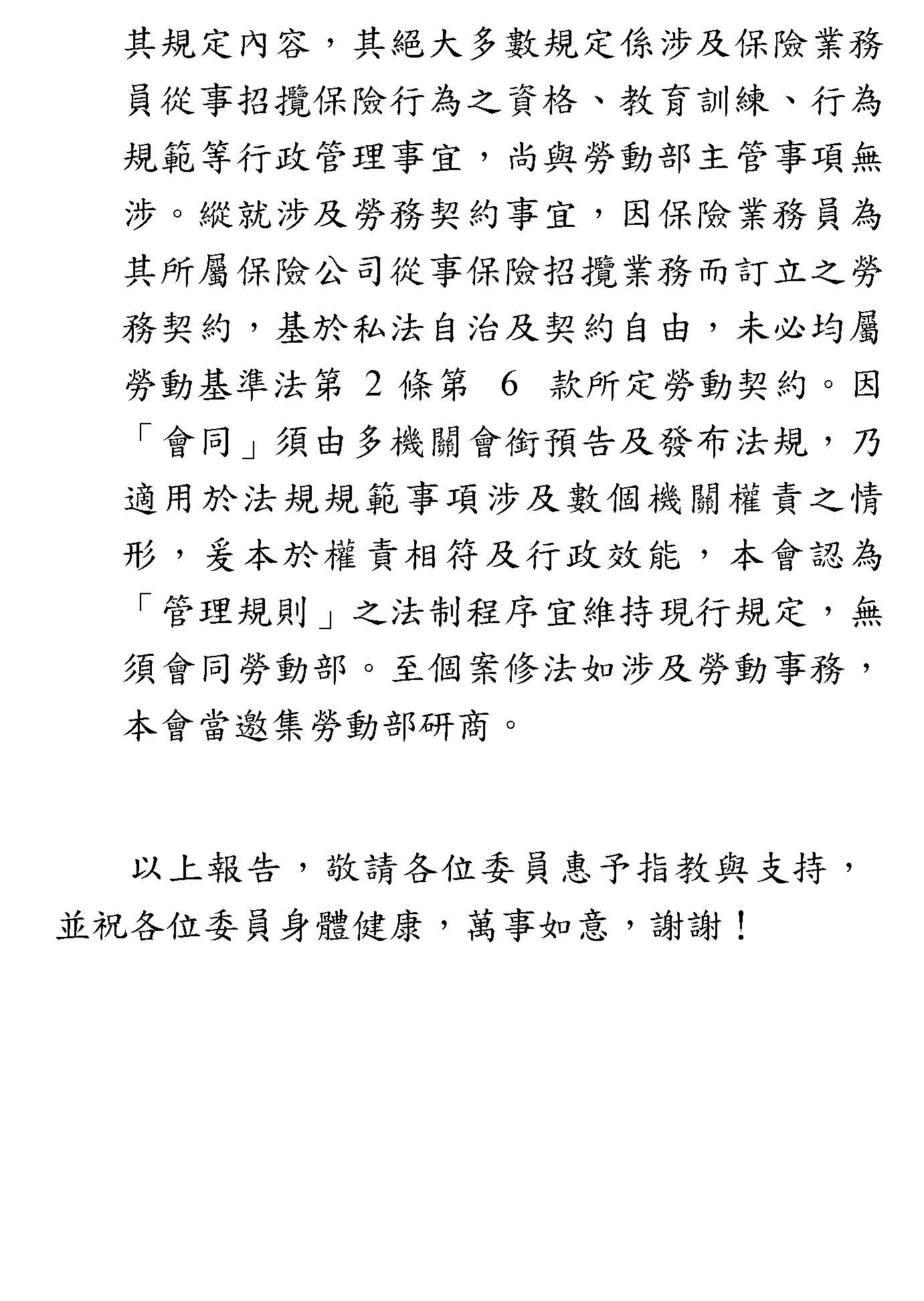 最後一項其實涉及之前的爭議,也就是傭金給付方式,所以我們針對第一百七十七條最後一項進行修法,亦即「保險業務員之勞務契約、教育訓練及其他攸關勞動權益之事項,由主管機關會同勞動部定之。」說實話,這也是重要的勞工權益,所以我們希望行政機關在處理這件事的時候,也要由勞動部來保障所有員工的權益。