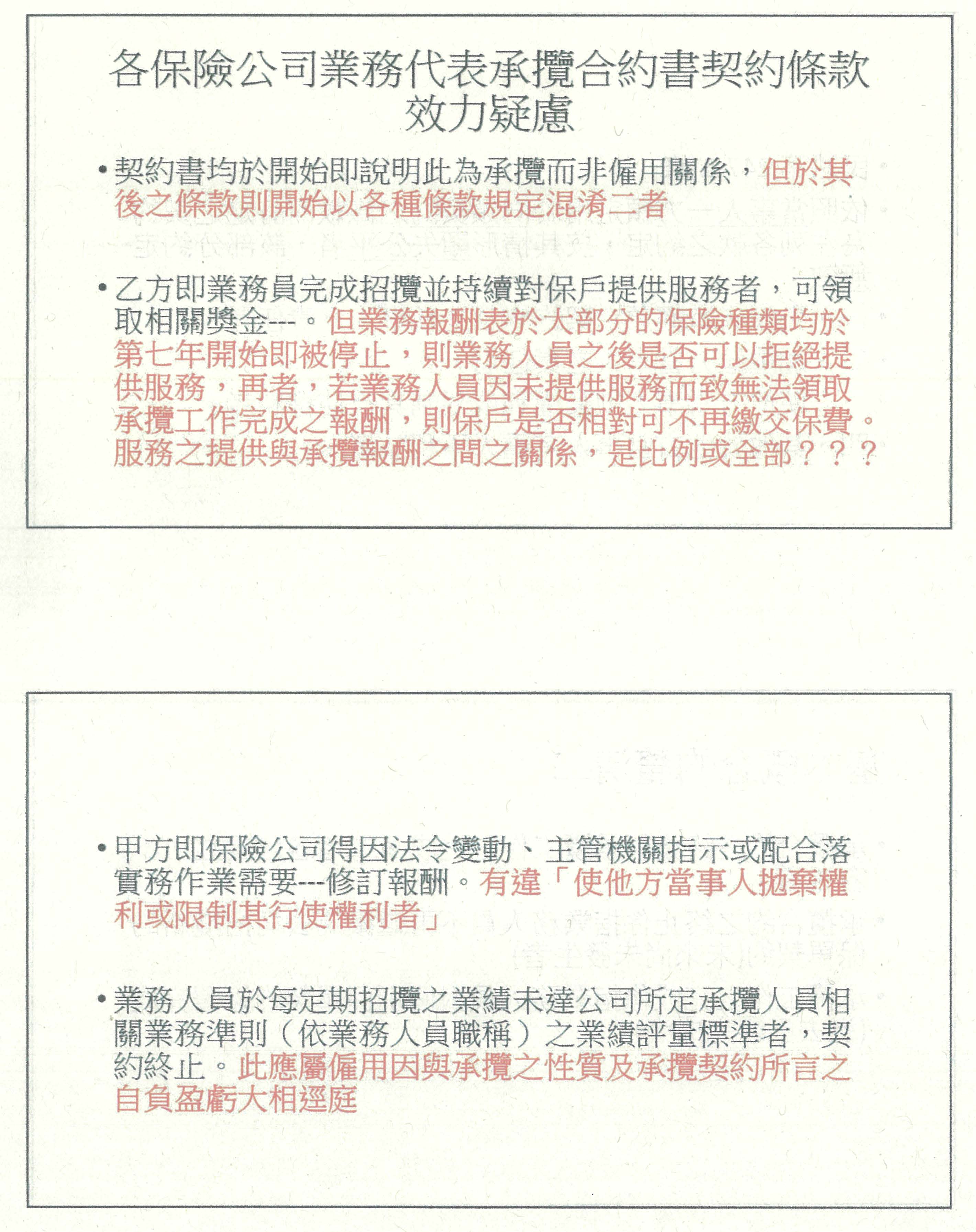本所過去有透過保險業務員工會以及一些從事保險業的同仁、朋友,取得多家保險公司與保險業務員簽署的勞務契約,我們認為其中關於承攬契約的諸多約定,好像與法規範及業務員的勞工權益是有所爭議的,以下整理幾點說明。第一點,我們在研究過程中發現,很多保險公司會與承攬契約的業務員約定,業務員必須達成一定業績,否則公司可以終止承攬契約,這樣的約定我們認為顯然與承攬契約著重在工作的完成有所不同。因為承攬契約是定作人將工作交付給承攬人,承攬人完成工作後,定作人給付報酬,我們卻在保險業務員的承攬契約中看到這樣必須達成業績標準的約定。這顯然與承攬契約的性質不同,也有保險公司將僱傭契約下的指揮監督關係包裝成承攬契約的質疑。