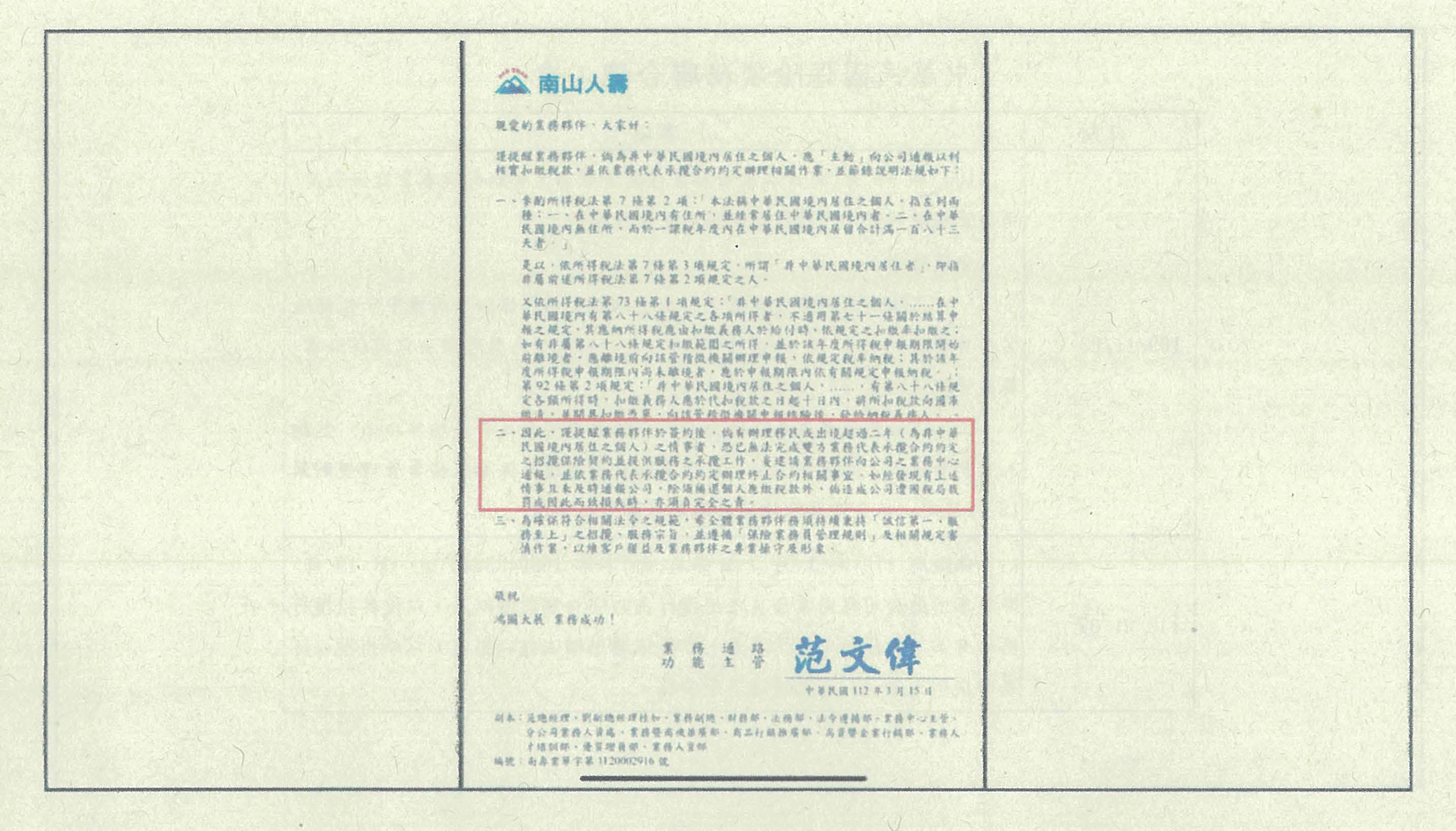 再來,南山人壽在法庭上的說法是,只要保戶繳保費,承攬業務員就可以獲得工作報酬,續年度以此類推。但是在法庭,公司不會說,終止契約之後,續年度報酬就被剝奪了,這是公司不說的話。再來,20年前因為有保戶反映,業務員的佣金拿一年之後就走了,沒有人服務,所以在那個時候開始,業務員的佣金被分期給付了。但是變成承攬契約之後,因為承攬契約說「終止合約,承攬報酬也隨之終止」,所以這就是業務員面臨的困境,明明740號解釋文說沒有一定業績要求,他做了業績要求,達不到業績就被終止合約;終止合約,續年度報酬就會沒有。這是一連串讓保險業務員工作權喪失,他的工作利益完全被剝奪之很嚴重的現象,希望各位長官能夠體恤保險業務員的辛苦,謝謝。