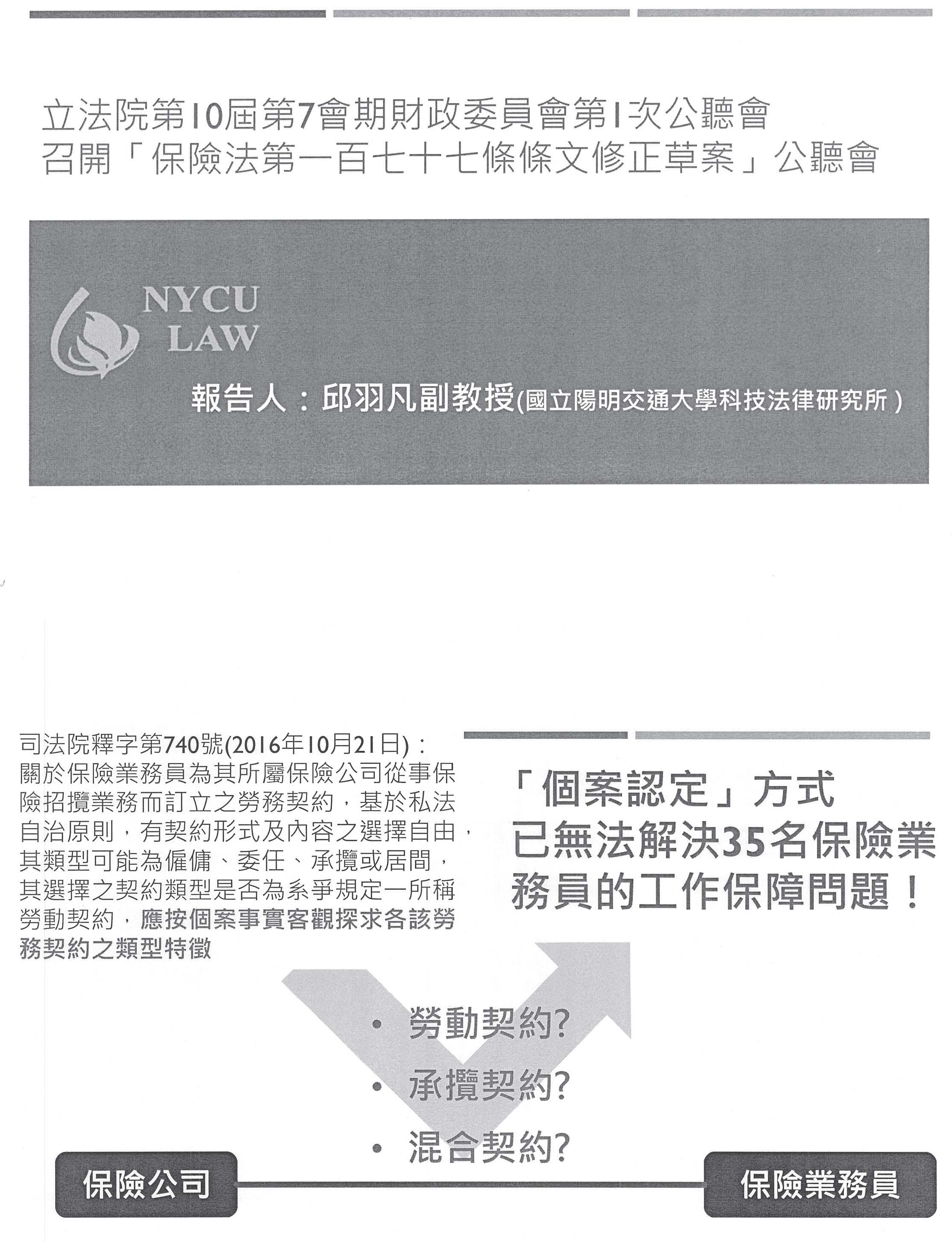 邱羽凡副教授:主席、各位委員、在座與會專家學者、機關代表,大家好。今天非常高興可以參加這場公聽會,這絕對不是一句客套話,因為關於保險業務員的問題在這邊開公聽會,我已經不曉得來參加第幾次了。