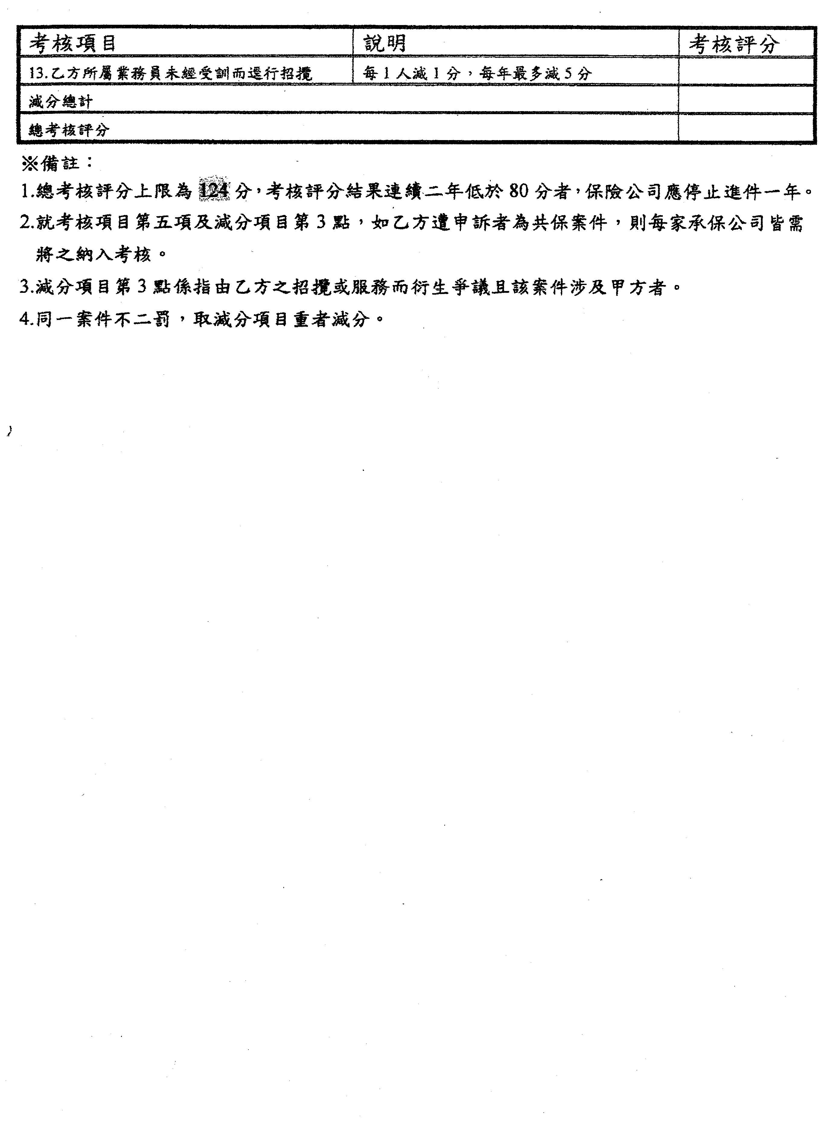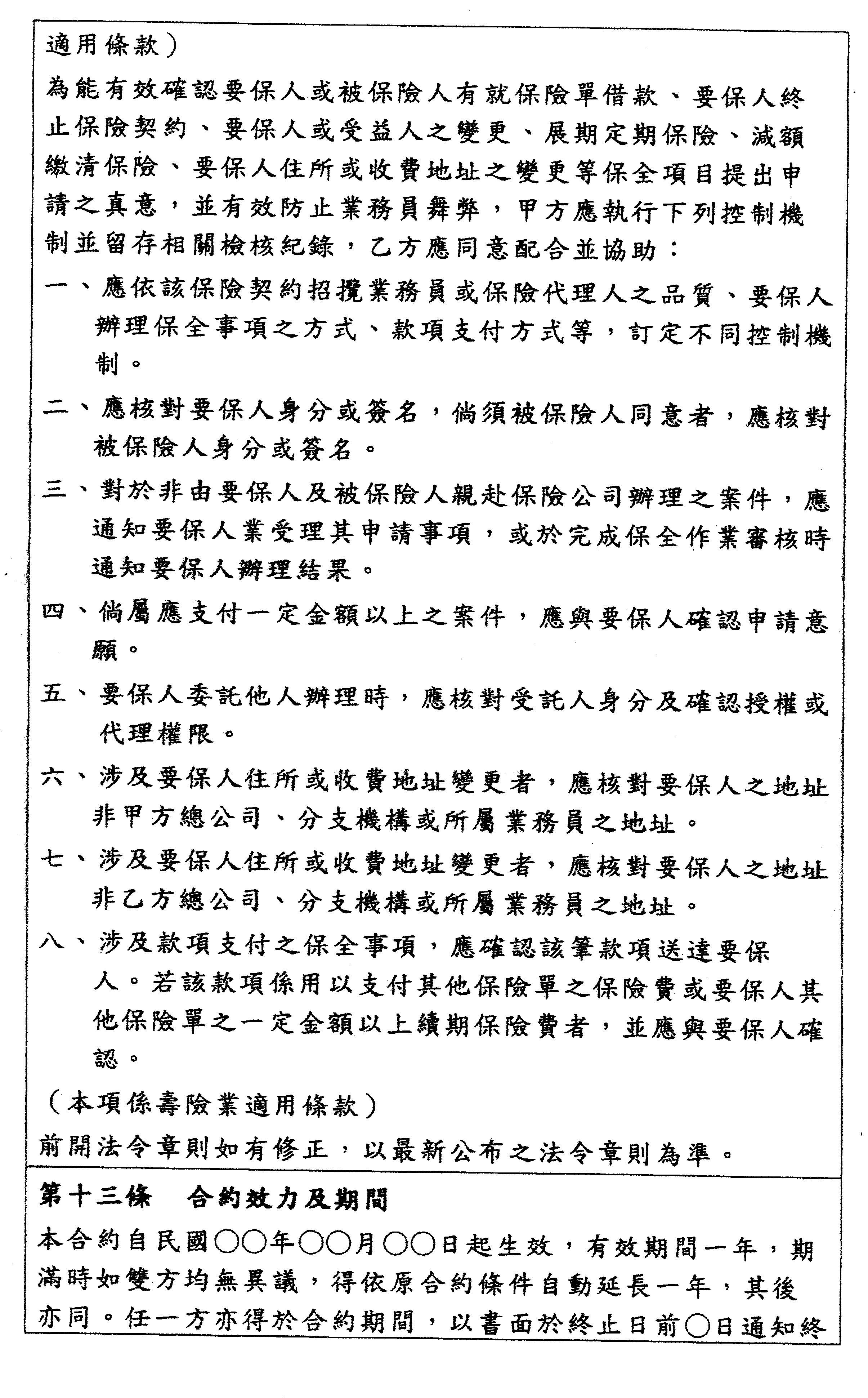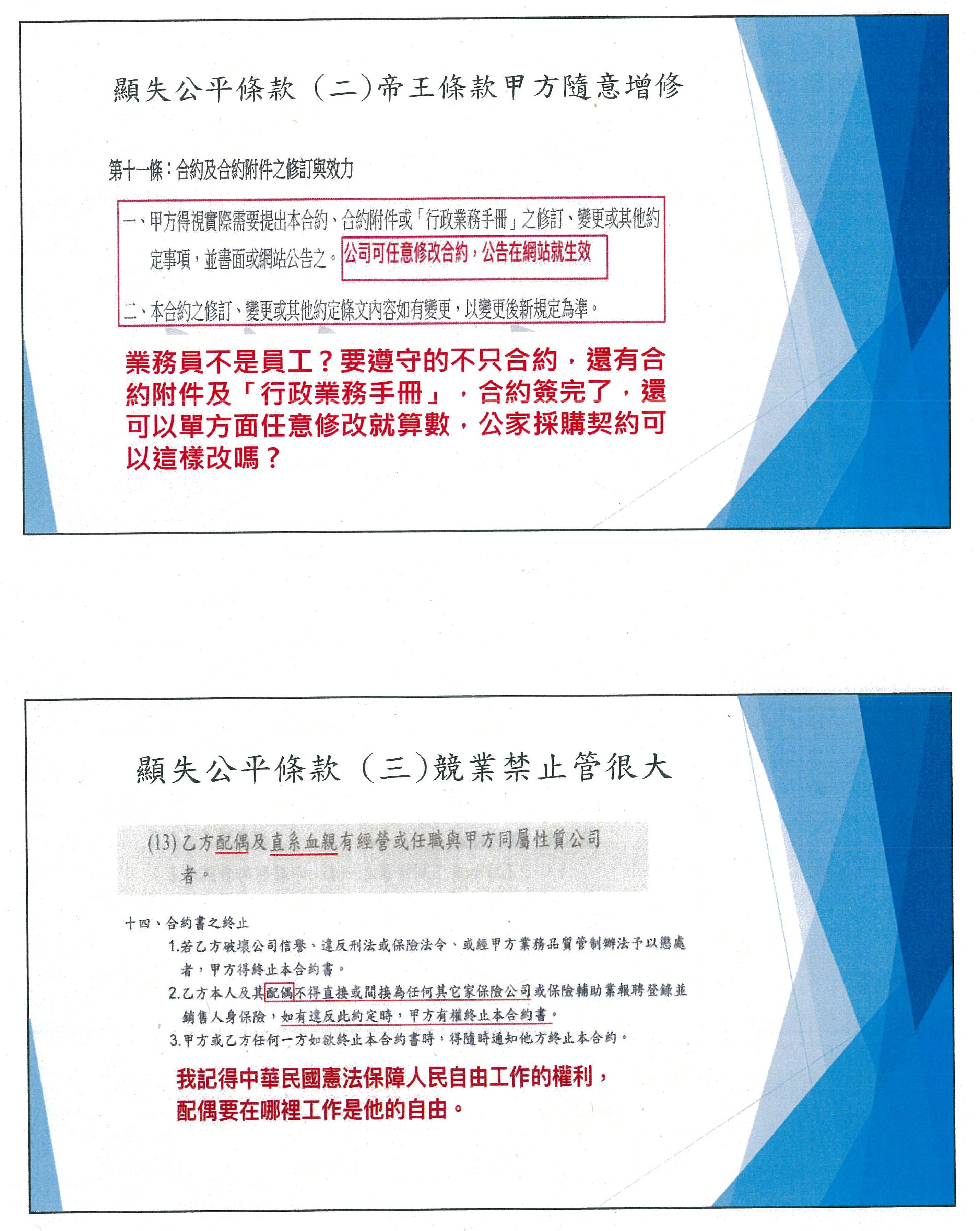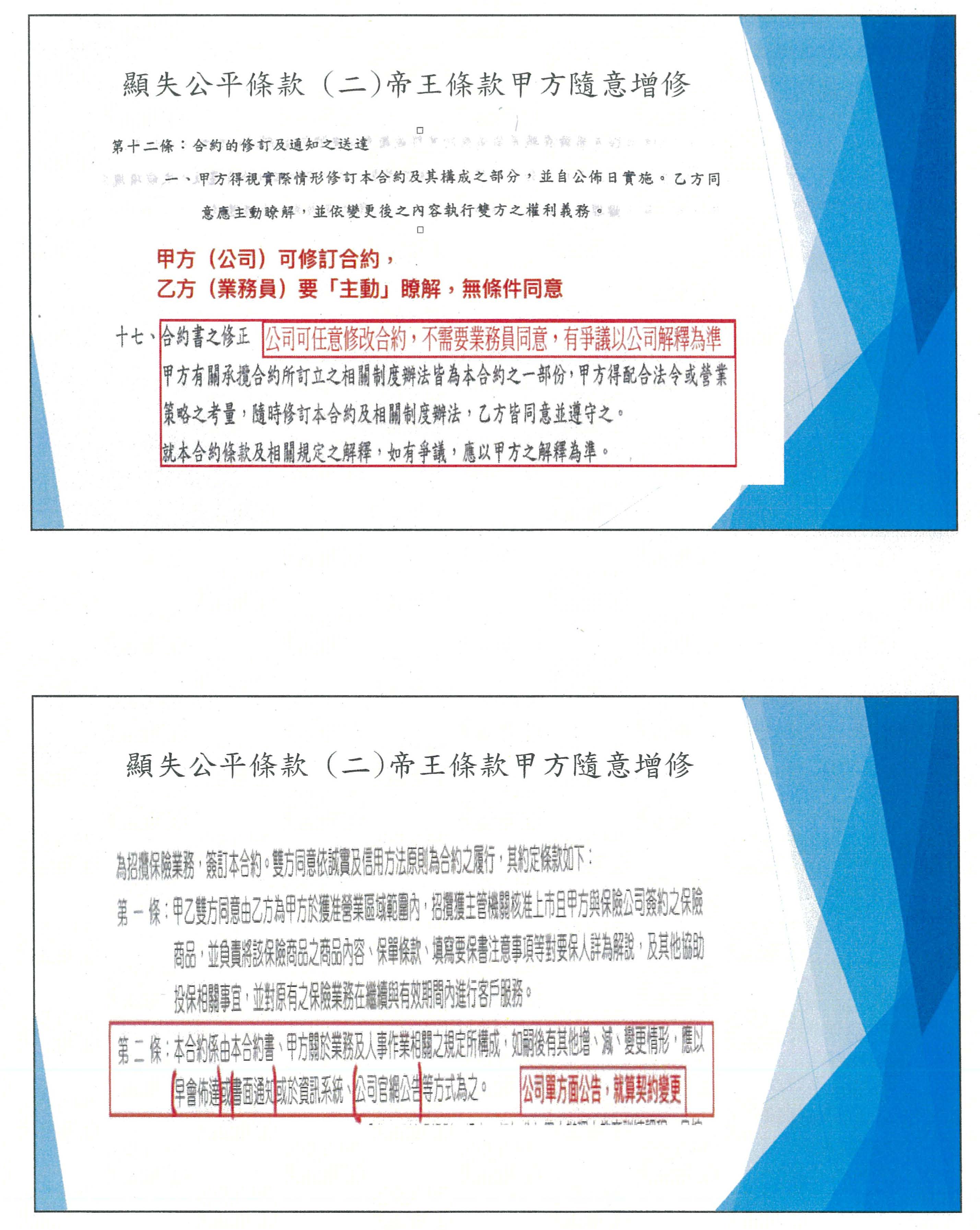 如果今天遇到一些業務人員必須要做一些賠償責任的部分,不是招攬業務人員要賠而已,他的主管也要賠,主管犯了什麼錯?不是說都是承攬,業務人員的主管跟業務人員之間又沒有從屬性,為什麼是主管要幫忙賠?有關契約的修改,各位看一下是隨時都可以修改,只需要公告完之後就算數了。剛才蔡坤穎理事長講到了,說什麼張淑晶條款,當時張淑晶是怎麼用這樣一個租賃契約去訛詐那些租客?一開始先簽一個版本,只有提到租金一個月可能1萬元好了,結果簽了之後,他開始在後面寫,譬如一臺冷氣機壞掉,要加收1萬元、磁扣不見要加收5,000元等等,就是這樣子啊!契約後面任他改嘛!請問各位,你們到外面去跟人家簽契約會簽這種無限擴張條款嗎?他可以隨便增改內容並且改了就算數,這樣的合約各位敢簽嗎?你會跟我講業務人員可以不要簽啊!但是所有的保險公司都是這樣的條款,我去到哪一家都是一樣的結果,你跟我講不然就不要做保險,難道所有保險業務人員都要受到這樣一個帝王條款的壓榨嗎?你看他不只可以改合約而已,連他的行政作業手冊,合約簽了之後,他還是一樣單方說改就可以算數了。公家機關在跟人家簽採購合約,可以說誰單方面要改就改嗎?改了就算數嗎?公家機關簽約可以這樣子嗎?不行嘛!