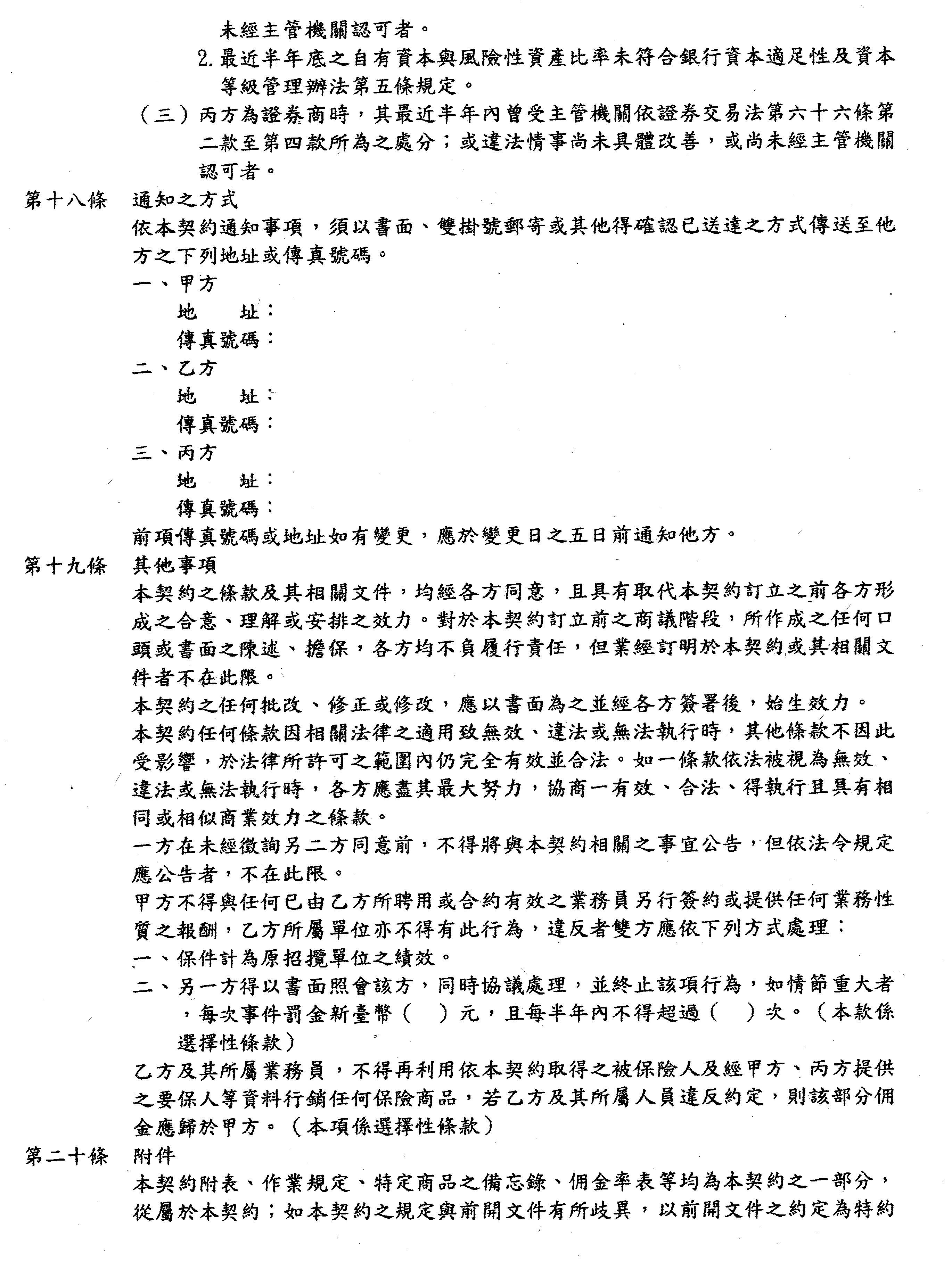 我最後要講一個東西,現行的銀行業跟保險代理人有一個示範合約,這是金管會可以介入保險公司的私契約,銀行這部分也都有放,他們這些東西統統都要送主管機關去備查、審核,這裡都有文號,我有做這樣的附件提供給各位,所以其實主管機關是可以去訂定這樣的一個示範合約來保障業務人員的工作權,謝謝。