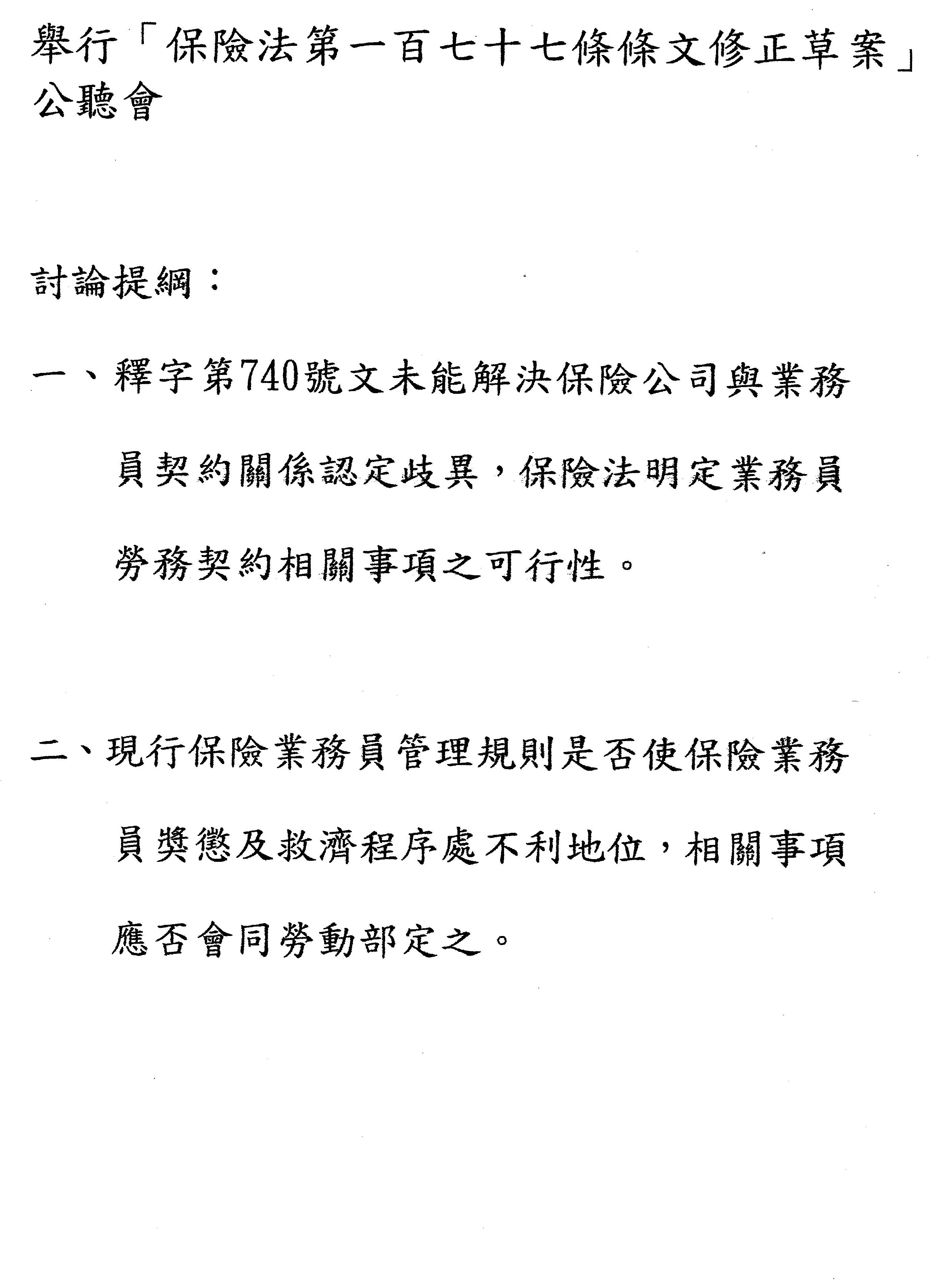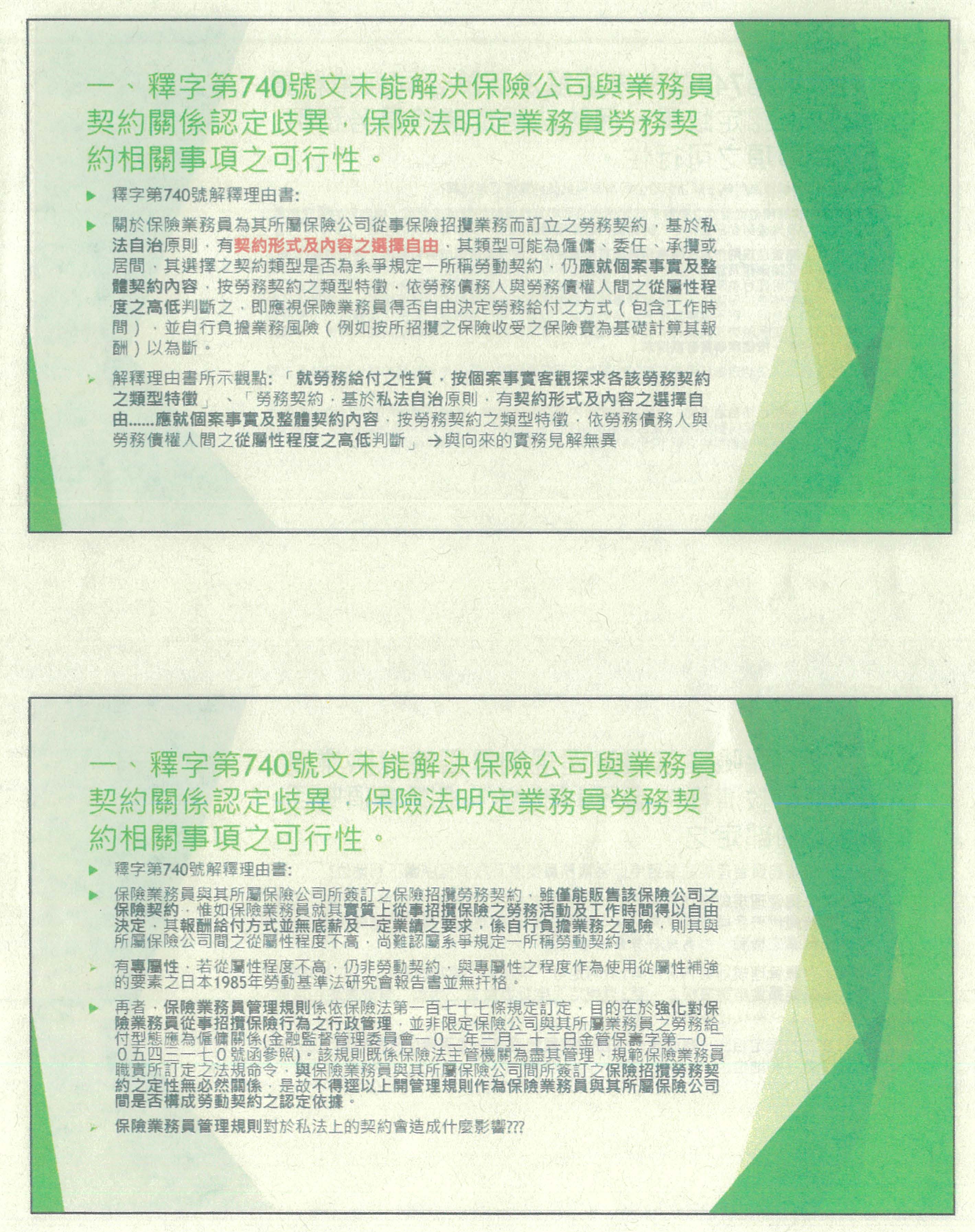 至於今天所討論的提綱裡面,我想大家著重的是一個通案性的問題,大院這邊列了兩個討論提綱,第一個,關於釋字第740號解釋沒有解決保險公司與業務員之間的契約關係,以及是不是有需要在保險法裡面規定勞務契約相關類型的可行性。我個人對這一點是持比較保留的態度。