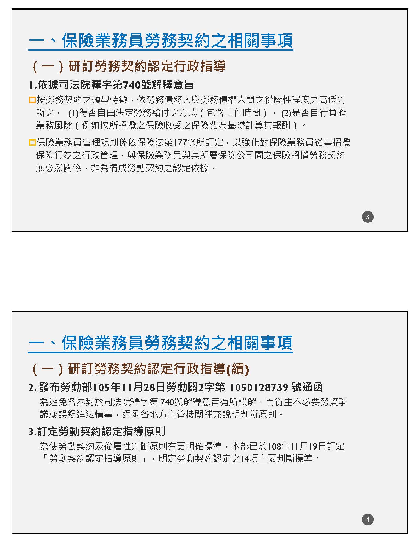 另外,剛剛也聽到各位提出的很多意見,過去對於勞動契約從屬性的訂定,其實勞動部在109年4月有訂定勞動契約認定指導原則以及勞動契約從屬性判斷檢核表,這個部分,我們在6月的時候已經轉請我們的所有公會要轉知會員公司,各公司應該要依照勞動部檢核表去判斷其從屬性,請各公司應該要予以遵守,這個是我們在109年的時候有處理的事項。至於各位剛剛有提到個別公司的一些勞務契約的爭議,我們後續或許可以來瞭解到底業務員在跟公司之間的關係遇到了什麼問題,我們再針對個案來看看有沒有什麼需要給予協助的部分。