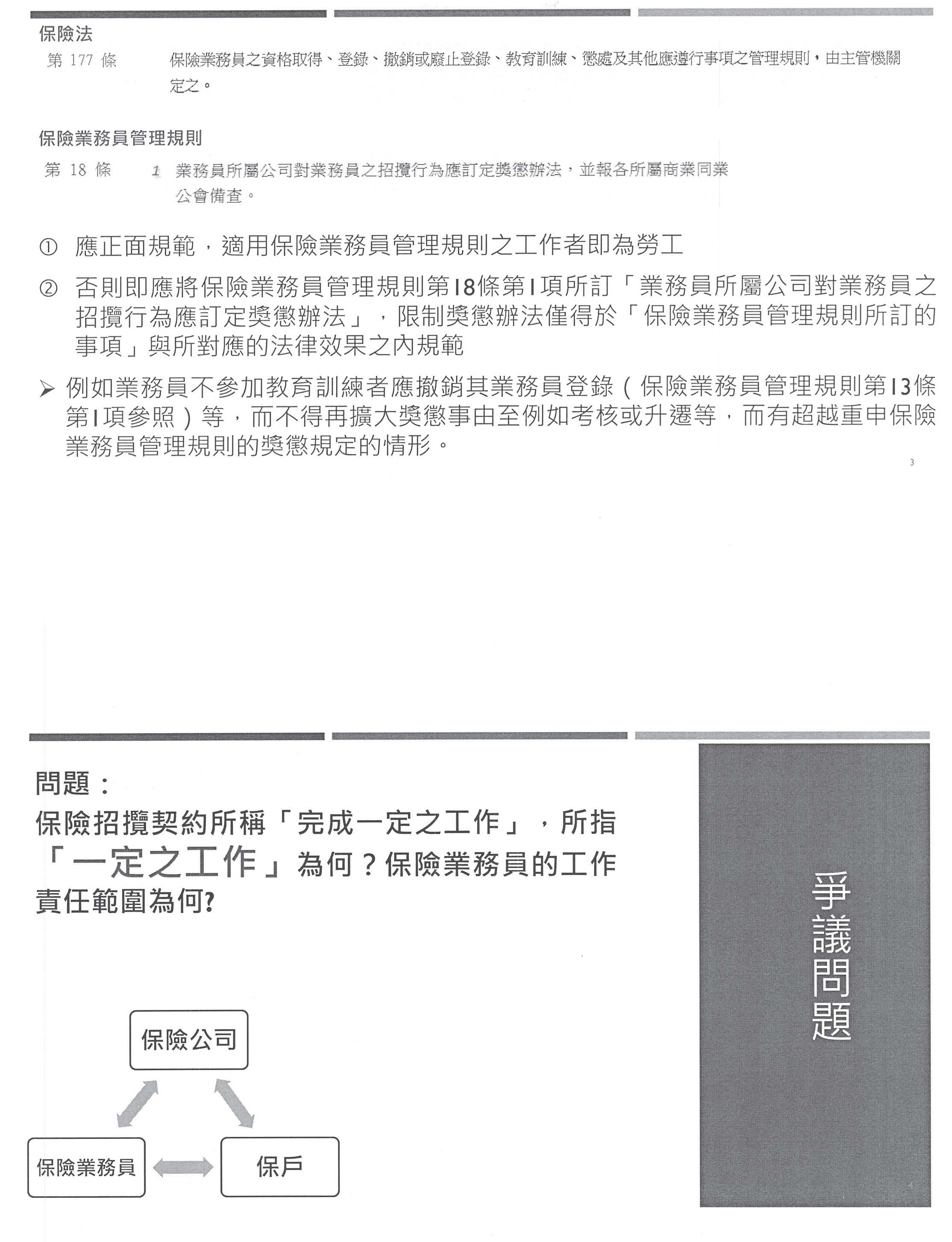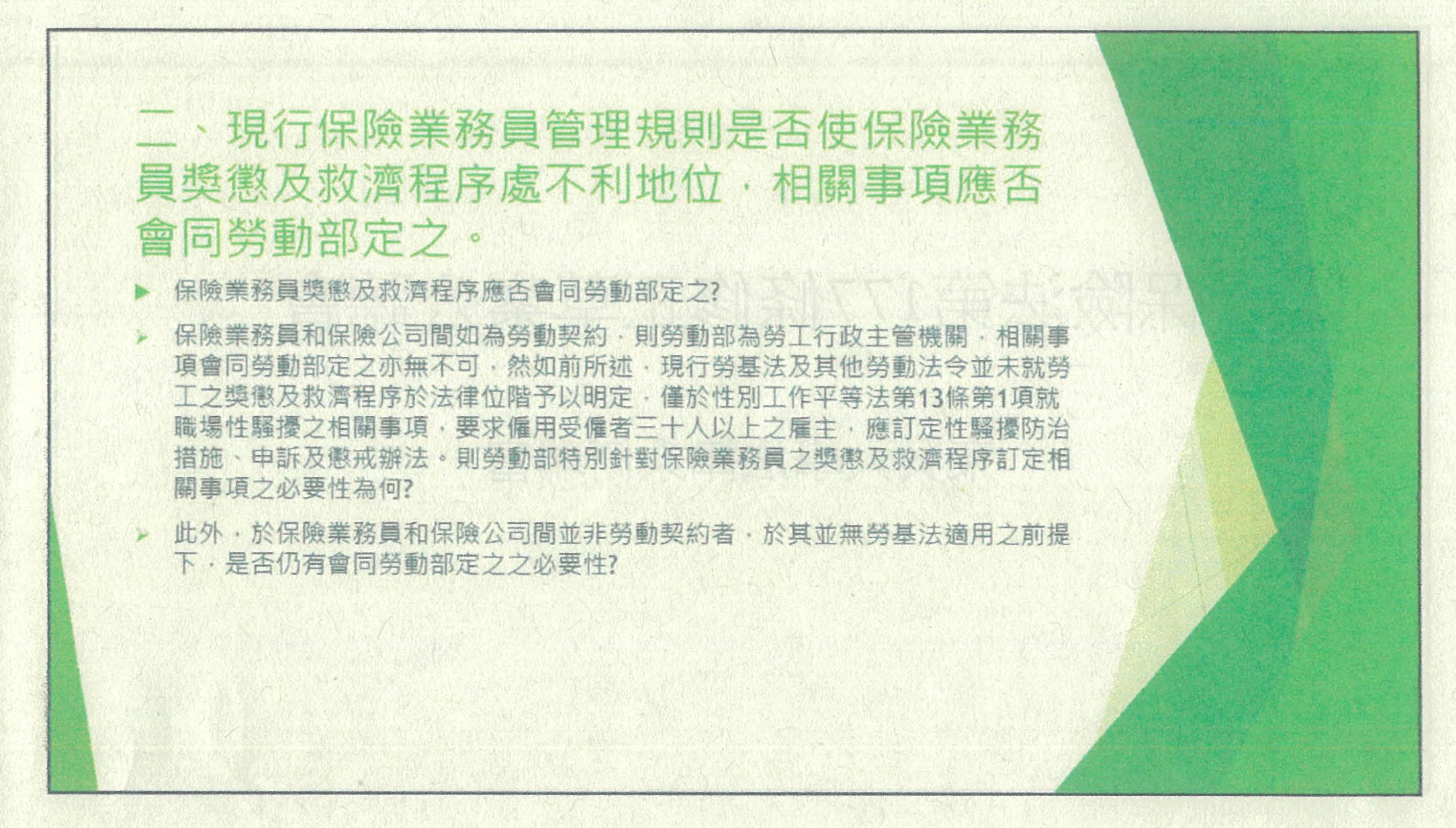 第二個問題,關於現行的保險業務員管理規則,有沒有讓業務員的懲處跟救濟處於不利地位呢?是不是要會同勞動部訂定這個規範?我們還是要回到保險業務員,不管他跟公司之間是選擇了僱傭類型還是承攬類型的,這兩種其實都是一個私法上的權利義務關係,一旦有任何糾紛,最終局的解決還是要透過民事法院的審判才能確定這個勞務契約裡面,不管是僱傭還是承攬的契約權利義務究竟是如何。