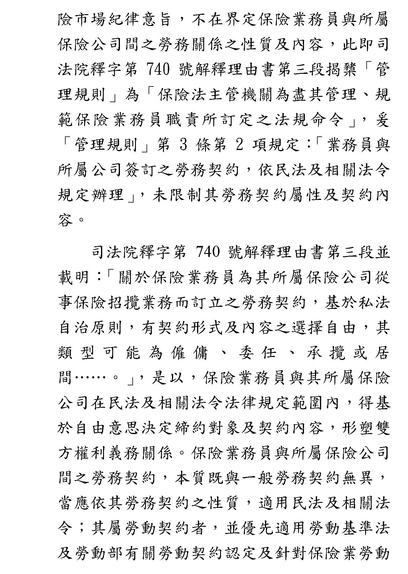司法院釋字第740號解釋理由書第三段並載明:「關於保險業務員為其所屬保險公司從事保險招攬業務而訂立之勞務契約,基於私法自治原則,有契約形式及內容之選擇自由,其類型可能為僱傭、委任、承攬或居間……。」,是以,保險業務員與其所屬保險公司在民法及相關法令法律規定範圍內,得基於自由意思決定締約對象及契約內容,形塑雙方權利義務關係。保險業務員與所屬保險公司間之勞務契約,本質既與一般勞務契約無異,當應依其勞務契約之性質,適用民法及相關法令;其屬勞動契約者,並優先適用勞動基準法及勞動部有關勞動契約認定及針對保險業勞動關係之相關函釋辦理。保險法及相關法規如就業務員勞務契約相關事項自為規範,除與保險法自身立法目的有間,且易致疊床架屋,使法規競合產生不必要之適用疑義。