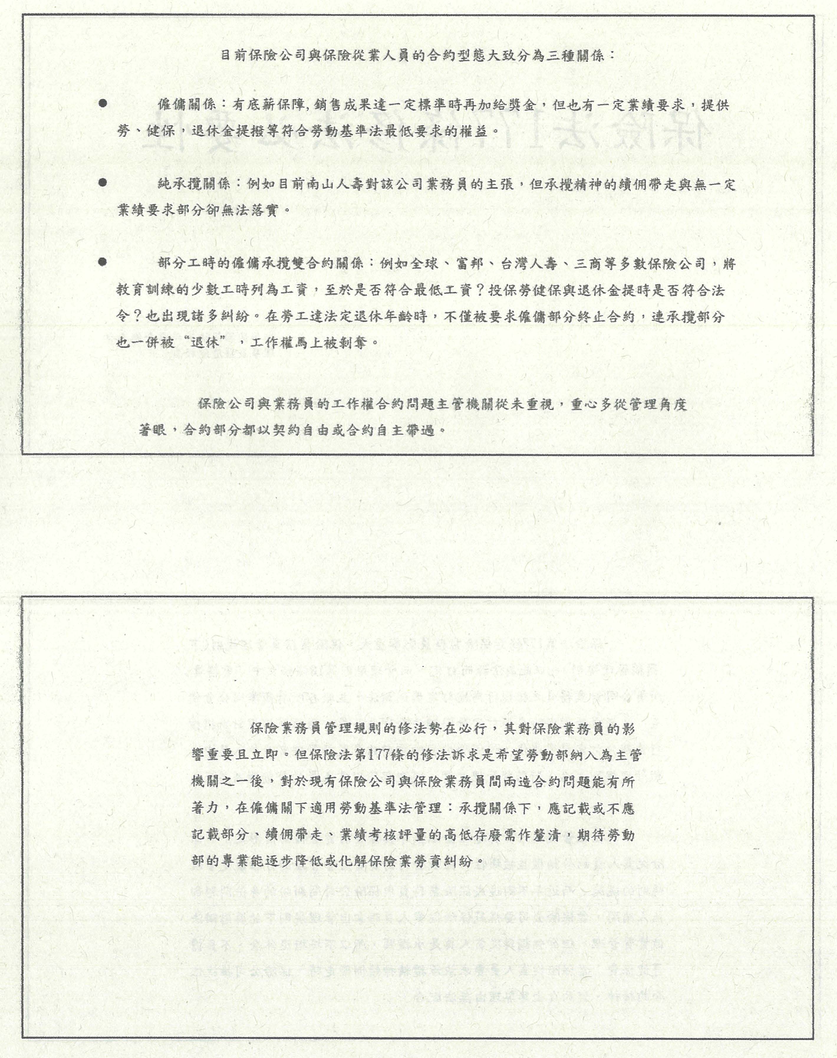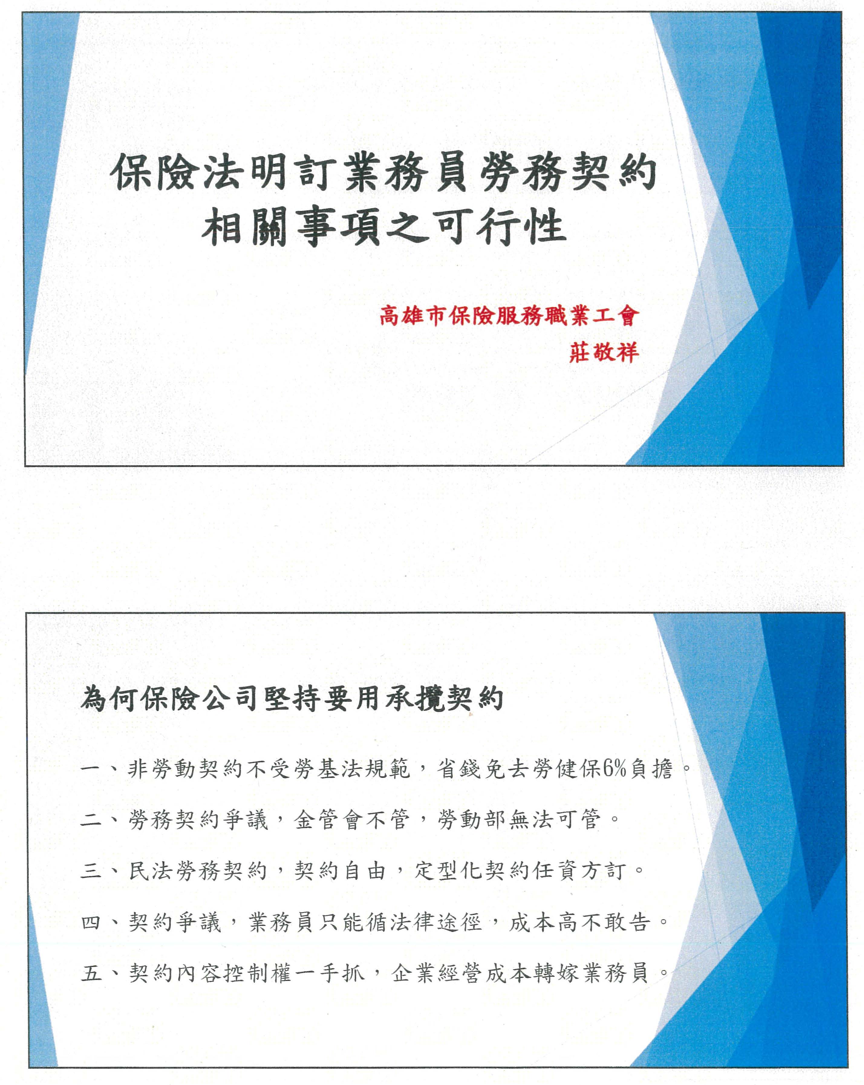 可以看到保險公司有三大形態,基本上現在最大的問題大概就是混合制,在混合制中就有著部分工時和承攬合約,我們現在遇到的問題是,當結束僱佣的時候,承攬合約要不要繼續?當然要繼續,因為我需要工作,我一定還要繼續工作,所以僱佣應該不能被終止,但現在保險公司大部分都是採終止契約的方式辦理,然而終止契約之後業務員就必須上法院去訴訟,所以現在案子對業務員來講,就是一個很大的經濟壓力,這是我們在此要向主席報告的。