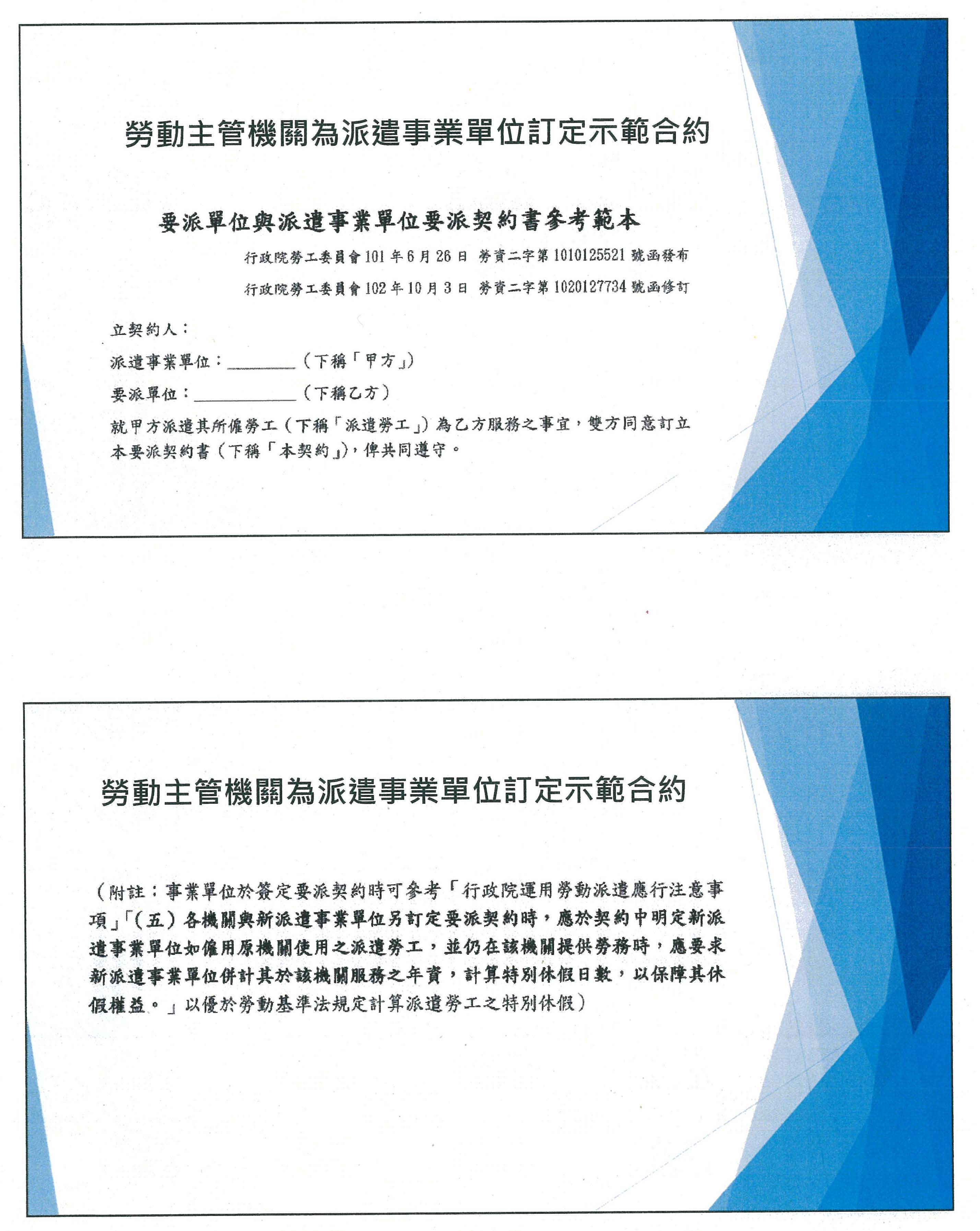 其次,有關於今天大家所談到的,是不是目的事業主管機關可以訂定相關的一些指導原則等等,確實現在有的部會針對某些工作者比較特別,他不一定是僱傭,也可能是委任或承攬,可是他們也訂了一些勞務契約的規範,像交通部觀光局為了保障導遊和領隊的工作權益,在旅行業管理規則裡面有明定:「旅行業指派或僱用導遊人員、領隊人員執行接待或引導觀光旅客旅遊業務,應簽訂書面契約;其契約內容不得違反交通部觀光局公告之契約不得記載事項。」