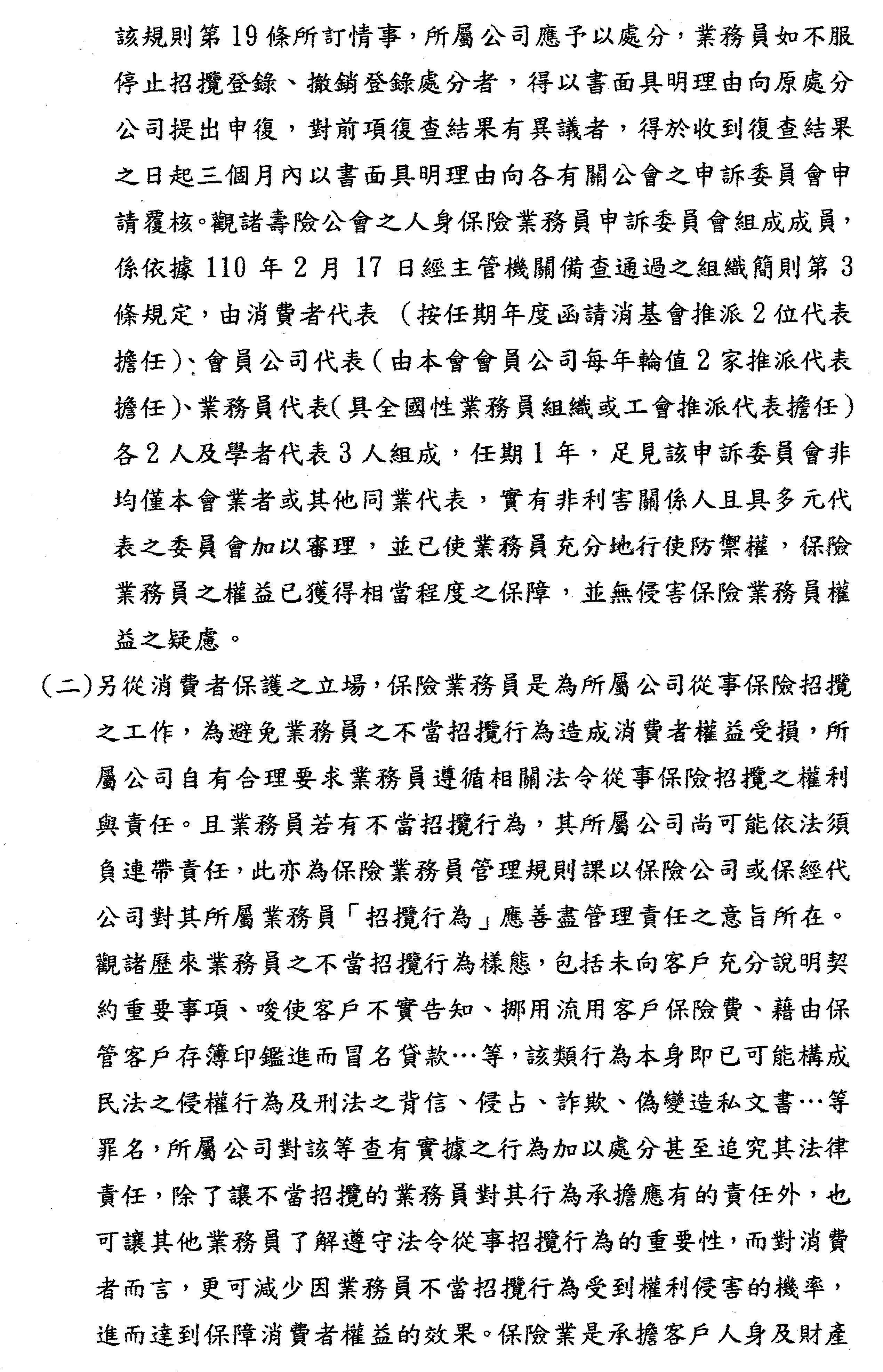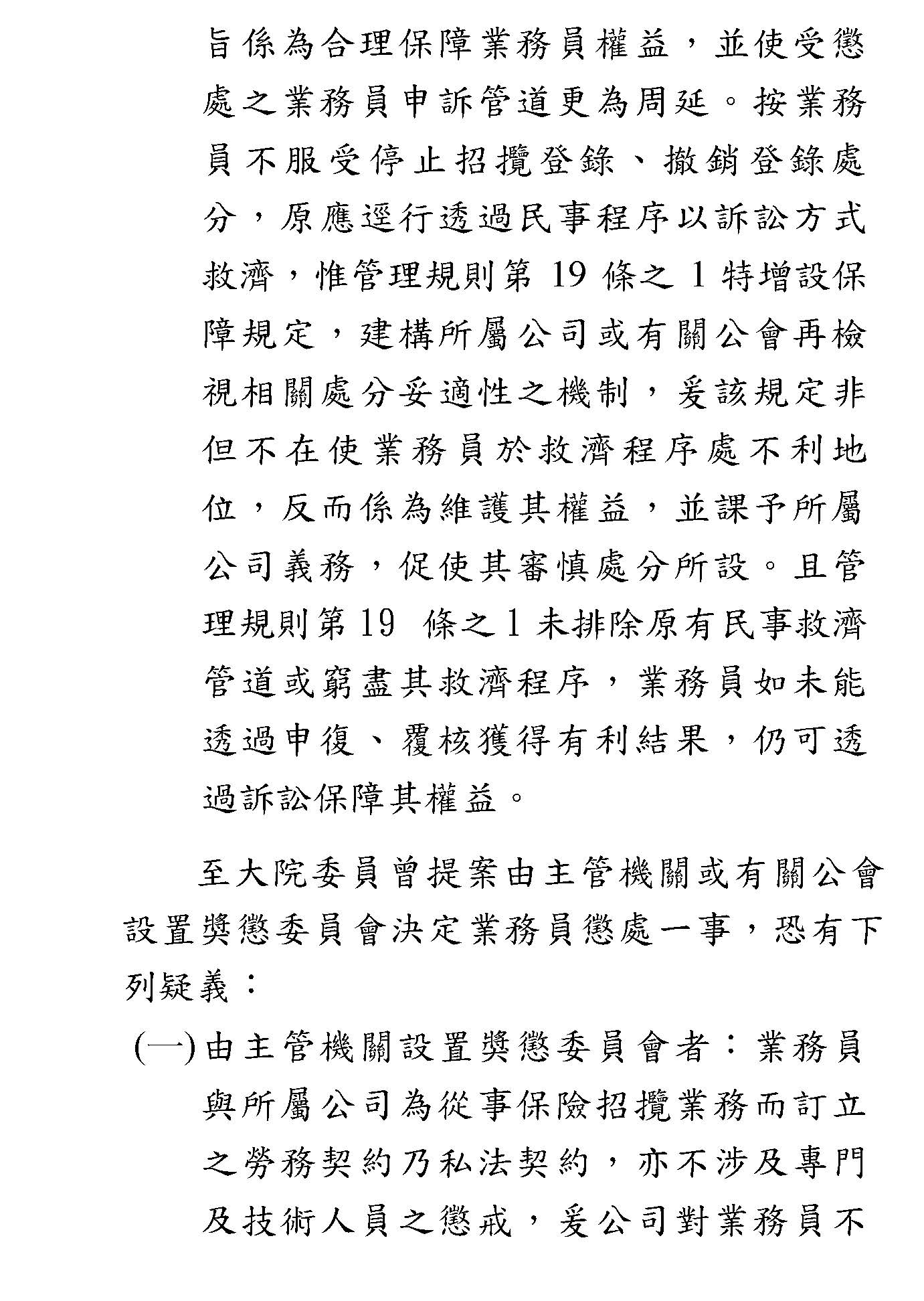 (三)管理規則第19條之1就停止招攬登錄、撤銷登錄處分設有救濟制度,其立法意旨係為合理保障業務員權益,並使受懲處之業務員申訴管道更為周延。按業務員不服受停止招攬登錄、撤銷登錄處分,原應逕行透過民事程序以訴訟方式救濟,惟管理規則第19條之1特增設保障規定,建構所屬公司或有關公會再檢視相關處分妥適性之機制,爰該規定非但不在使業務員於救濟程序處於不利地位,反而係為維護其權益,並課予所屬公司義務,促使其審慎處分所設。且管理規則第19條之1未排除原有民事救濟管道或窮盡其救濟程序,業務員如未能透過申復、覆核獲得有利結果,仍可透過訴訟保障其權益。
