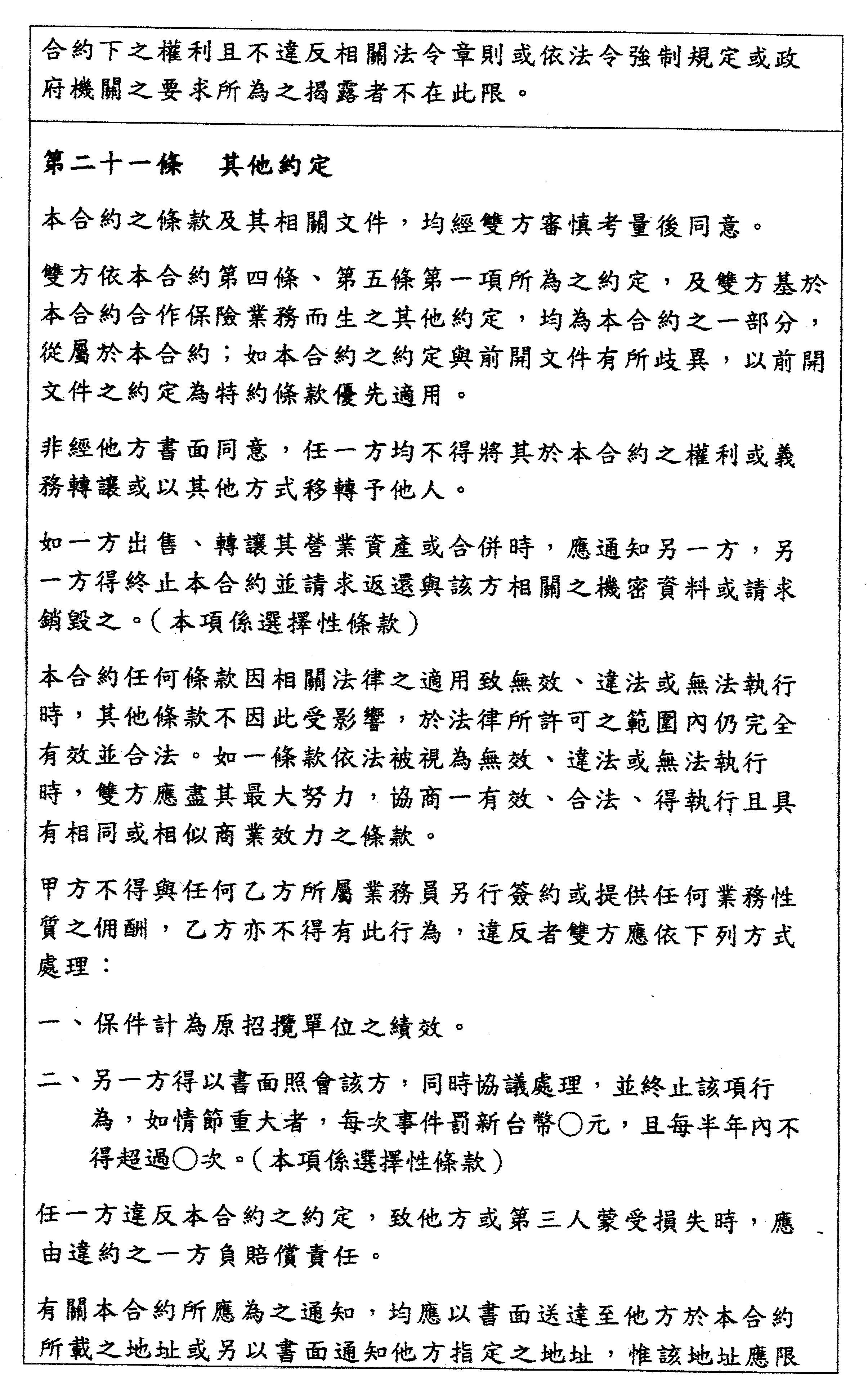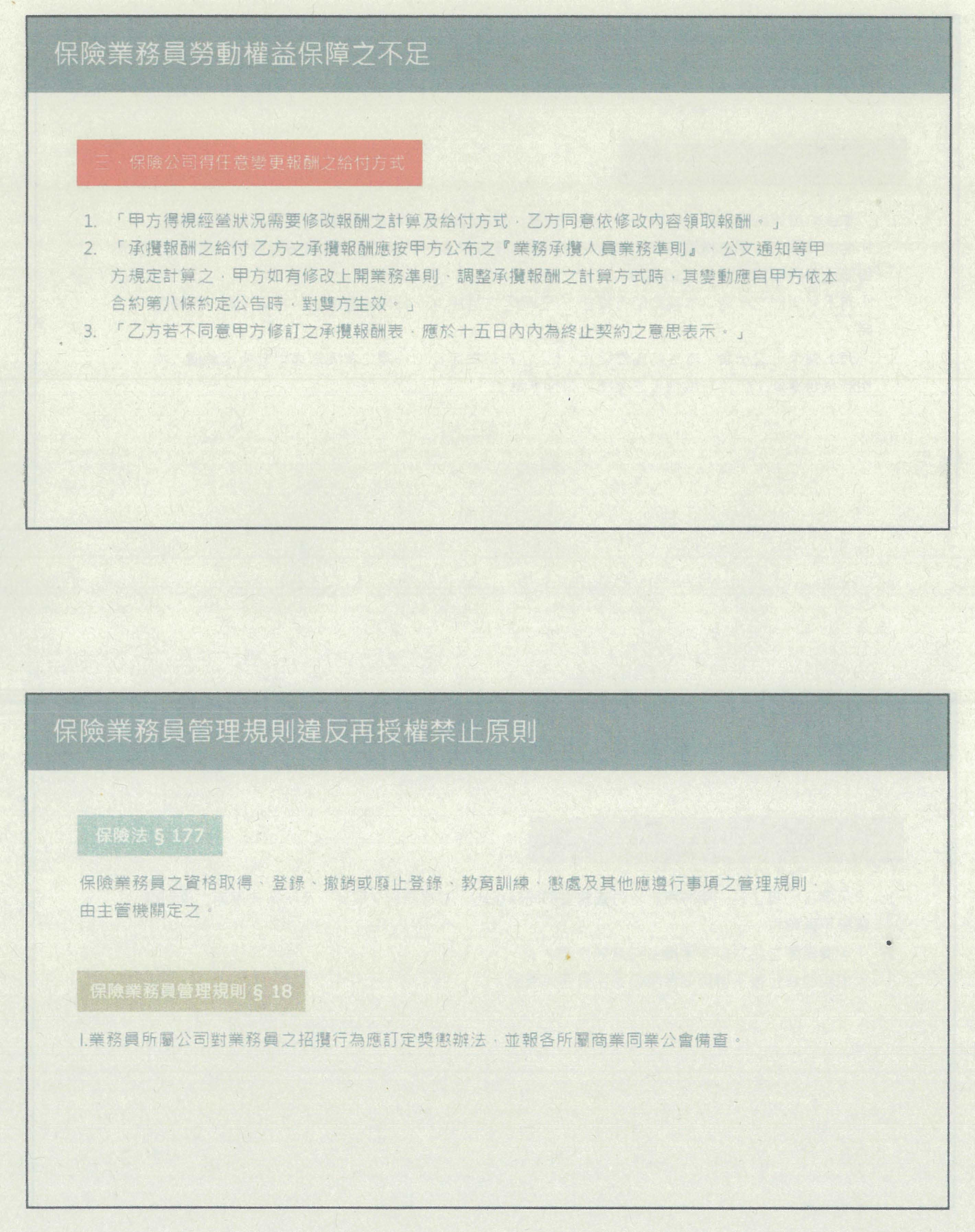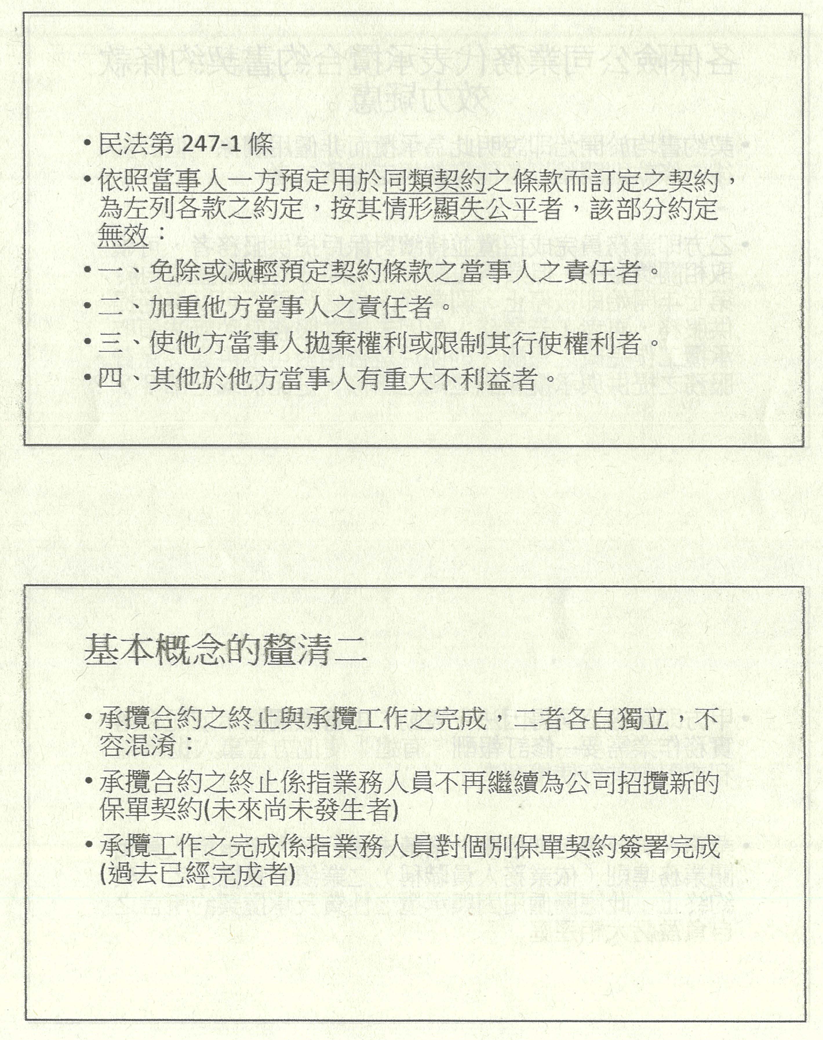 第二點,我們也有發現保險公司與業務員約定,承攬契約終止後,保險公司就不需再給付承攬報酬的情形。針對這樣的條文,我先說明一下,因為保險業務員的承攬報酬會約定一個較為特別的方式,即為續期佣金,也就是保險契約成立後,保險公司給付報酬的義務是每年保戶有繳交保費後,保險公司才給付業務員承攬報酬。但是這樣的承攬報酬給付義務,我們認為依照承攬契約的性質,在業務員完成招攬行為時,即保險契約成立時,保險公司就已經有給付承攬報酬的義務。然而保險公司卻在承攬契約中約定,倘承攬契約將來終止,所有承攬報酬的給付義務就視為永久取消,這樣的約定似乎已經與民法承攬篇中報酬給付義務的相關規定有所衝突。