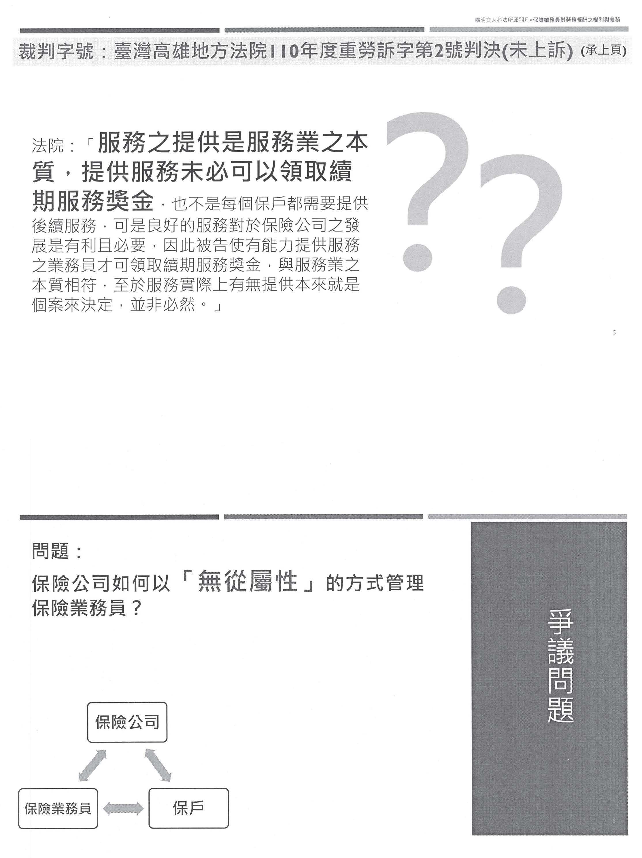 而保險法課予保險業有去管理業務員的義務,其實還是出於保護被保險人的目的而來,我們可以參考一下保險業務員管理規則第十九條所規定各種不構成懲處事由的項目,一共有17款,這裡面每一款都很明確是以保護被保險人的權益為目的,所以可以看到這邊其實只是要提高被保險人的保護,而不是要介入他的勞務契約類型。而且如果對處置不服,還是有一個申訴制度,可以到各公會申訴,申訴不成最後還是回到民事法院,所以這個部分可能還是要看個別案例是僱傭還是承攬,自己依照民法處理就可以了。以上發言,謝謝。