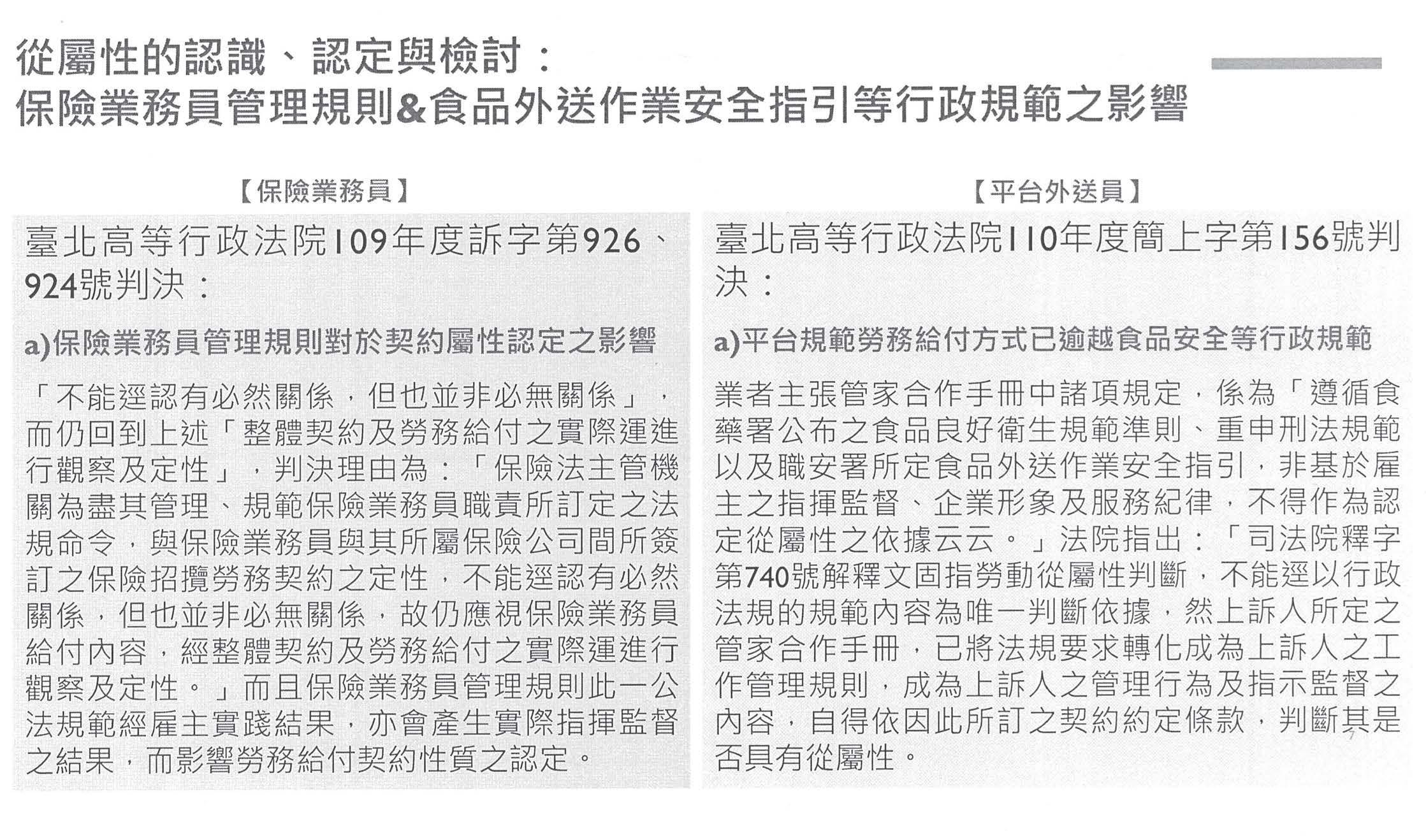 有關他到底是不是勞基法或是勞動法上的勞工,事實上,不是保險業務員才會有這樣的問題。像前一陣子有很多爭議─美食平臺外送員跟平臺業者之間是不是勞動關係?這種爭議不是現在才發生,而是勞動法上一直以來存在的古典問題。這個問題我們一直以來是怎麼處理呢?釋字740號解釋已經呼應了,或是說它的見解跟實務、學說向來的見解其實沒有什麼實質上的差異。釋字740號解釋說還是要依據提供勞務的情況,比如說,保險業務員是不是可以自由決定勞務給付的方式,而且自行負擔業務風險,藉此判斷是不是勞動關係,不可以逕以保險業務員管理規則作為認定標準。這樣的判斷標準,跟我們一直以來在勞動法領域,將有無從屬性作為認定標準是一樣的。釋字740號解釋理由書有強調,怎麼判斷要看到底在個案的事實裡面有沒有人的從屬性,比如說勞務給付的時間跟地點,還有專業的指揮監督關係,還有是不是要負擔業務風險。再來,關於業務員的特殊性,它有強調雖然業務員只可以販售該保險公司的保險契約,但是如果實質上他可以自由決定勞務給付方式並自行負擔業務風險的話,他的從屬性程度不高,那麼還是不能夠把它稱為勞動契約。換句話說,在有專屬性的情況下,如果從屬性的程度很低,一樣不能夠把它認定為勞動契約。這樣的判斷標準跟日本1985年以來,採用從屬性有無的判斷標準,其實還是一致的。