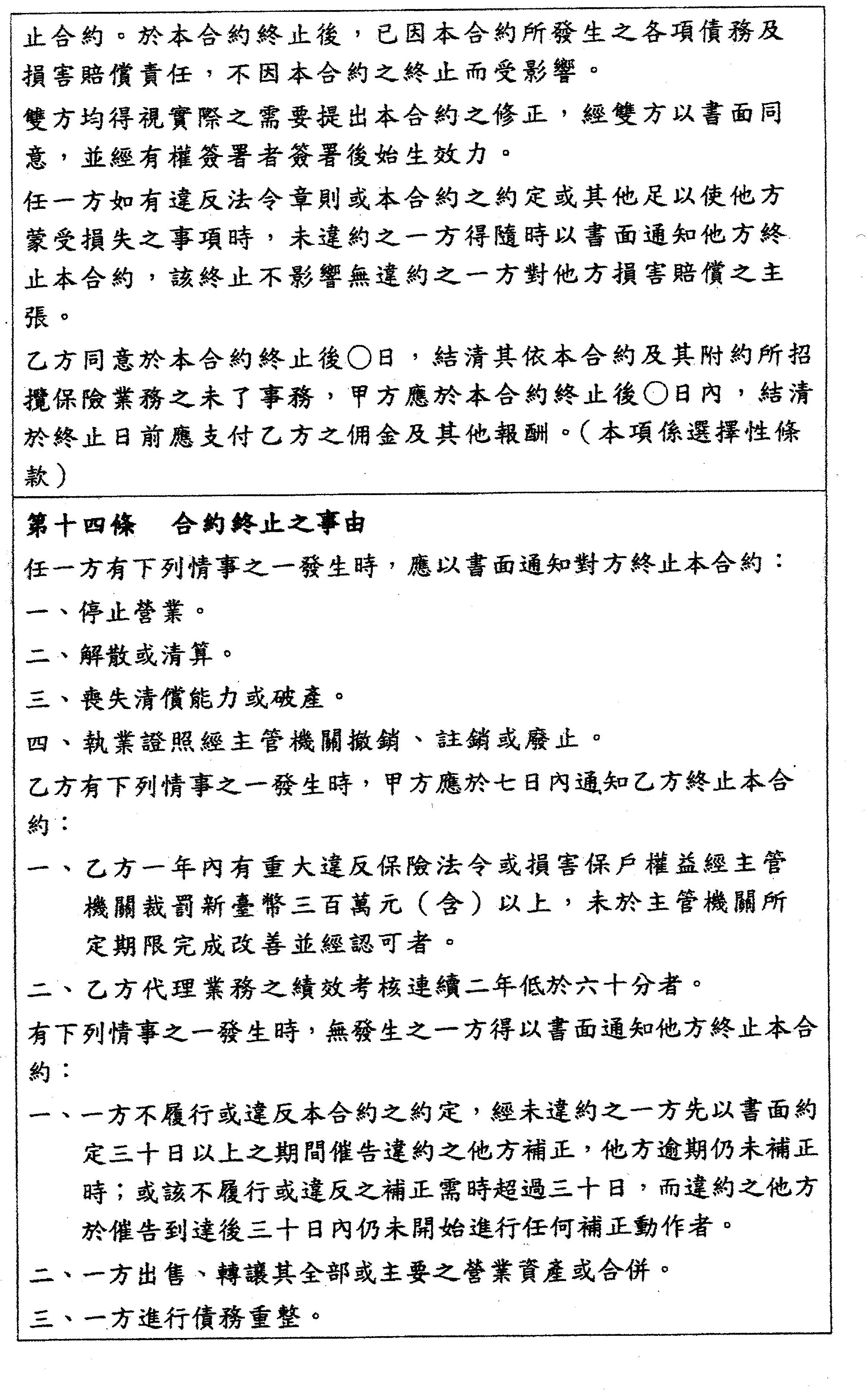第三點,我們發現有保險公司跟業務員約定,保險公司可以在契約關係存續期間任意變更保險報酬的給付方式,如果業務員不同意的話,就只能在15日內為終止契約的意思表示。這樣的約定顯然對於保險業務員有顯失公平的情形。