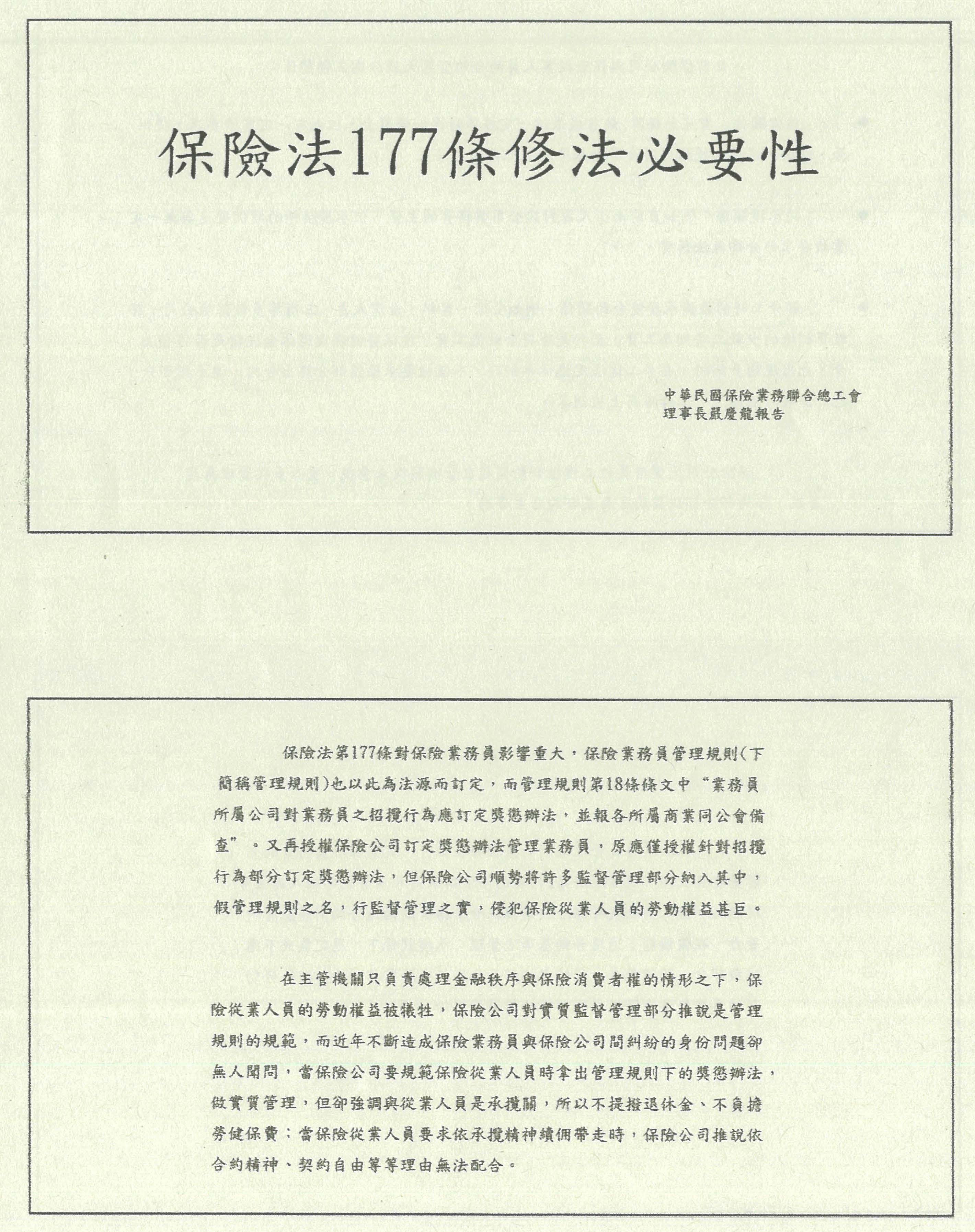 保險法第一百七十七條勢必要修改,希望勞動部介入之後對於保險公司和保險業務員兩造之間所有的僱佣關係都能適用勞基法,承攬關係應有應記載事項和不得記載事項、續期佣金在承攬合約裡面是不是可以繼續帶走,而考核評量也是我們這次討論的問題,期待勞動部可以進入第一百七十七條解決這些問題。