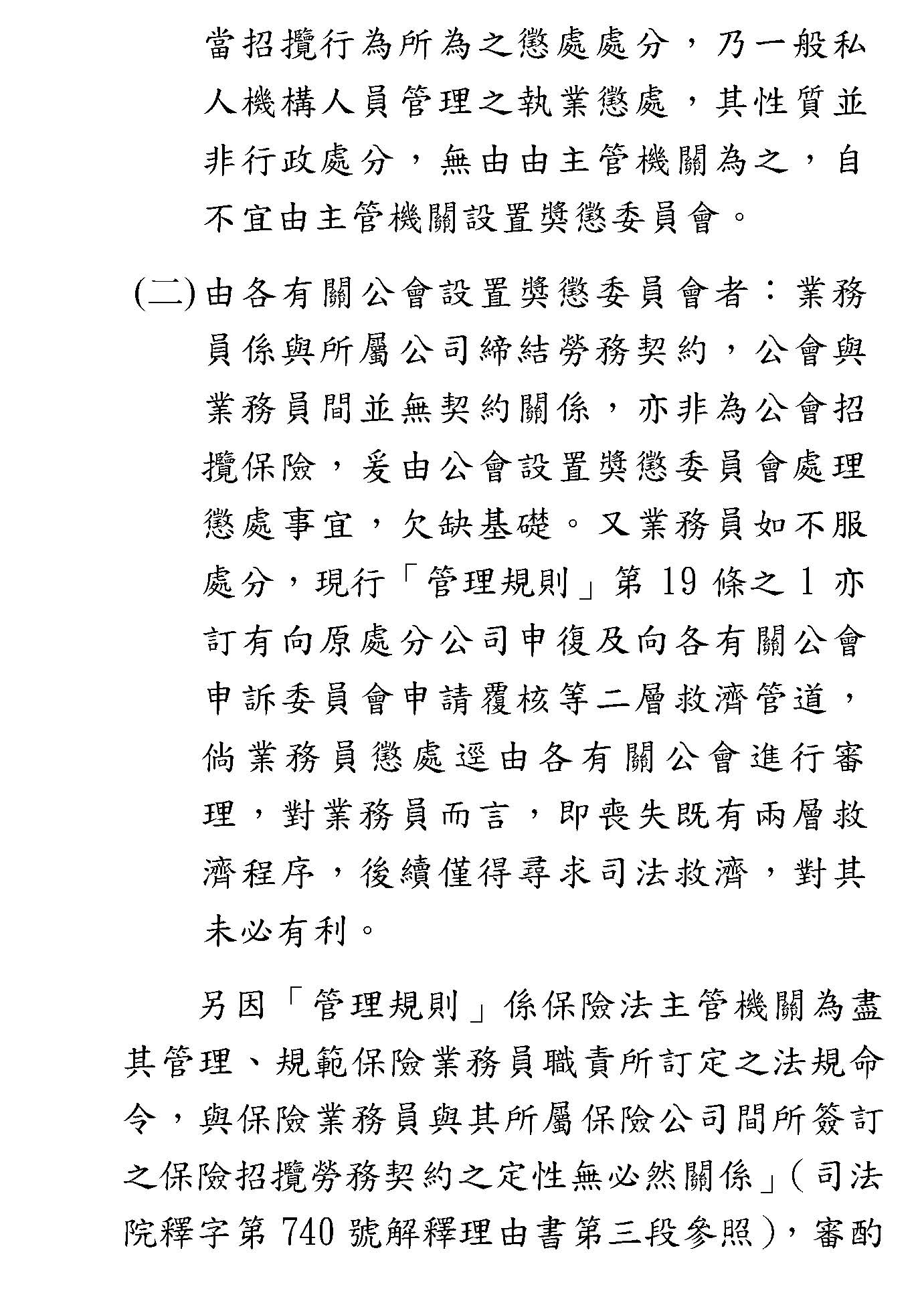 至於救濟的方式,不管是從審級制度,或是由公會做第一次審理,又或是與會代表之代表性,這部分我覺得也是立法形成的自由範圍,或許可以在這部分再做一定程度的強化,然後也可以產生保護勞工與業務員的一定效果。但是否要在保險法的母法裡直接把這些相關的主管機關,乃至於它預設的契約型態去做一定程度的規範,這部分我可能態度會有一點保留。