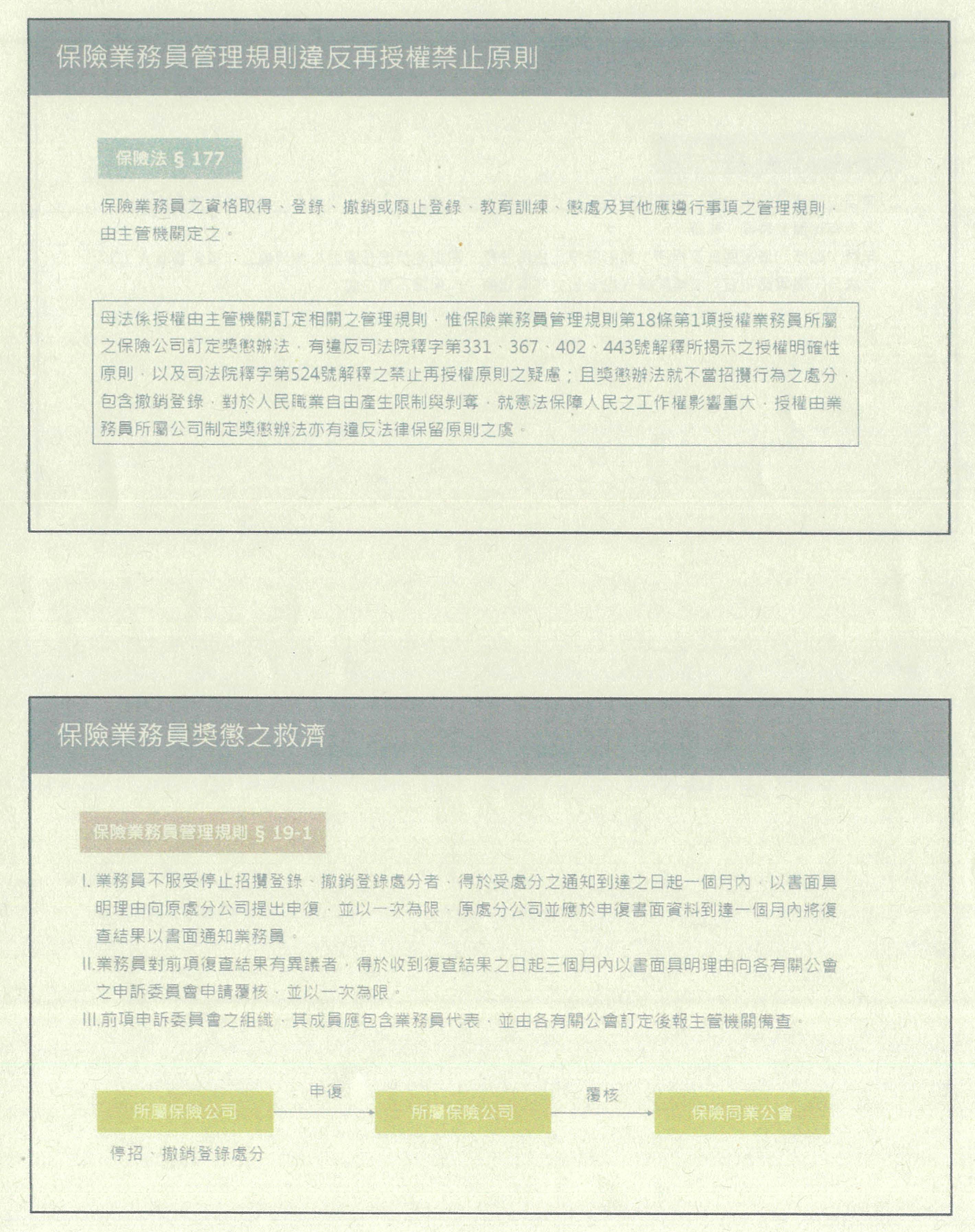 針對提綱二的部分,現行保險法第一百七十七條規範業務員的資格撤銷、登錄以及懲處等等由主管機關定之,但是主管機關所訂定出來的保險業務員管理規則,卻將招攬行為的獎懲辦法授權給各所屬公司訂定,我們認為這個部分應該有違反再授權禁止的原則。