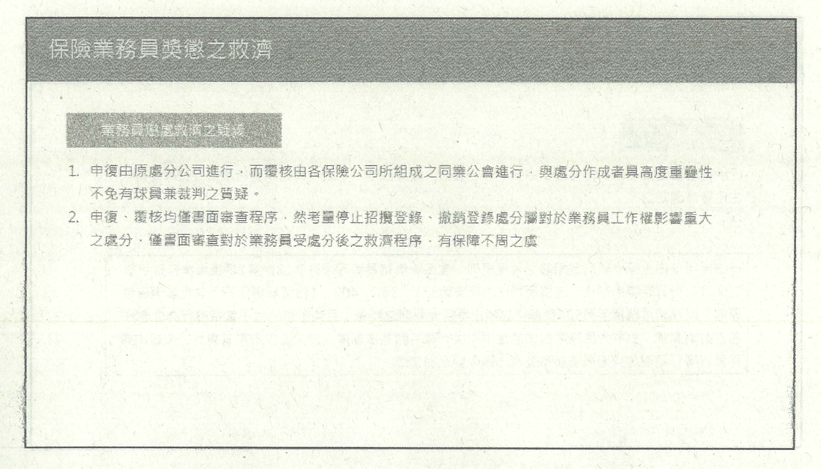 至於第二點,是有關現行保險業務員管理規則,對於業務員的獎懲跟救濟會不會使他們處於不利的地位?而需要修正保險法第一百七十七條,這可能是要由勞動部會同金管會來訂定相關的事項,我想因為目前業務員的懲處救濟也跟壽險公會有關,就像剛剛前面也有老師提到,目前依照保險業務員管理規則第十八條及第十九條之一,應該可以把它解釋成某種程度的二級二審制,也就是說業務員如果有違反保險業務員管理規則第十九條第一項相關規定時,會由他登錄的所屬公司查明事實以後,進行適當的懲處。管理規則第十八條規定,要求保險公司必須訂定這些獎懲辦法,而且在訂定跟修正的過程中必須要有業務員代表參與,我也跟我們的會員公司瞭解過,現在在保險公司中有關業務員懲處的組織,有的叫申訴委員會,有的叫評量委員會,裡面都會有業務員的代表。