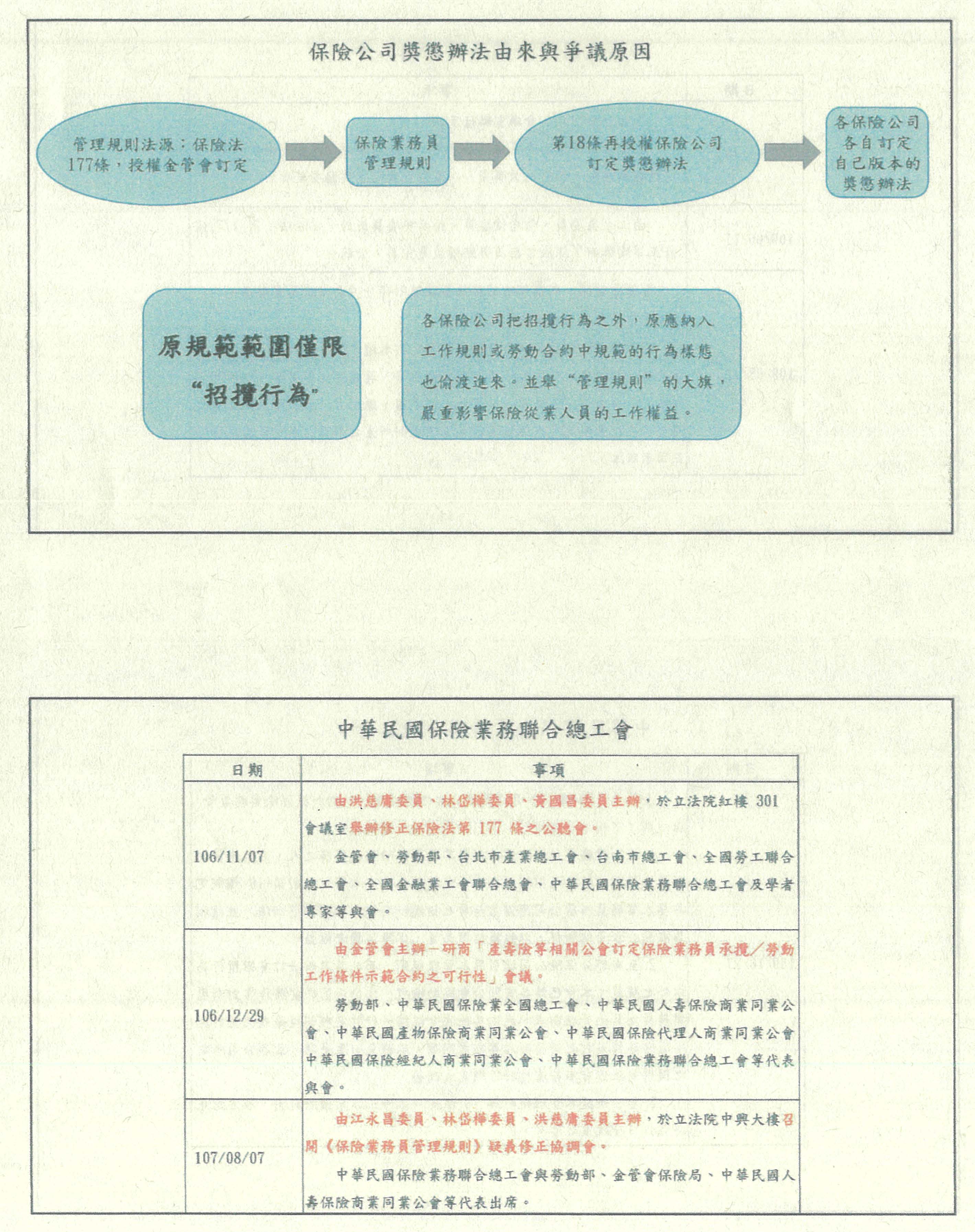 保險公司的權利是來自保險法的授權,上次我們提出取消保險法第十八條,可是經溝通和協議之後金管會還是不同意。各位可以看到我簡報上的表格,我們從106年開始就花了很多時間在推動第一百七十七條中加入勞動權利的修法,委員們也都很幫忙,也開了很多場公聽會。至於保險業務員管理規則第十八條,也可以看到金管會在110年認為第十八條不用刪除,這些都涵蓋在保險公司被授權的部分裡。