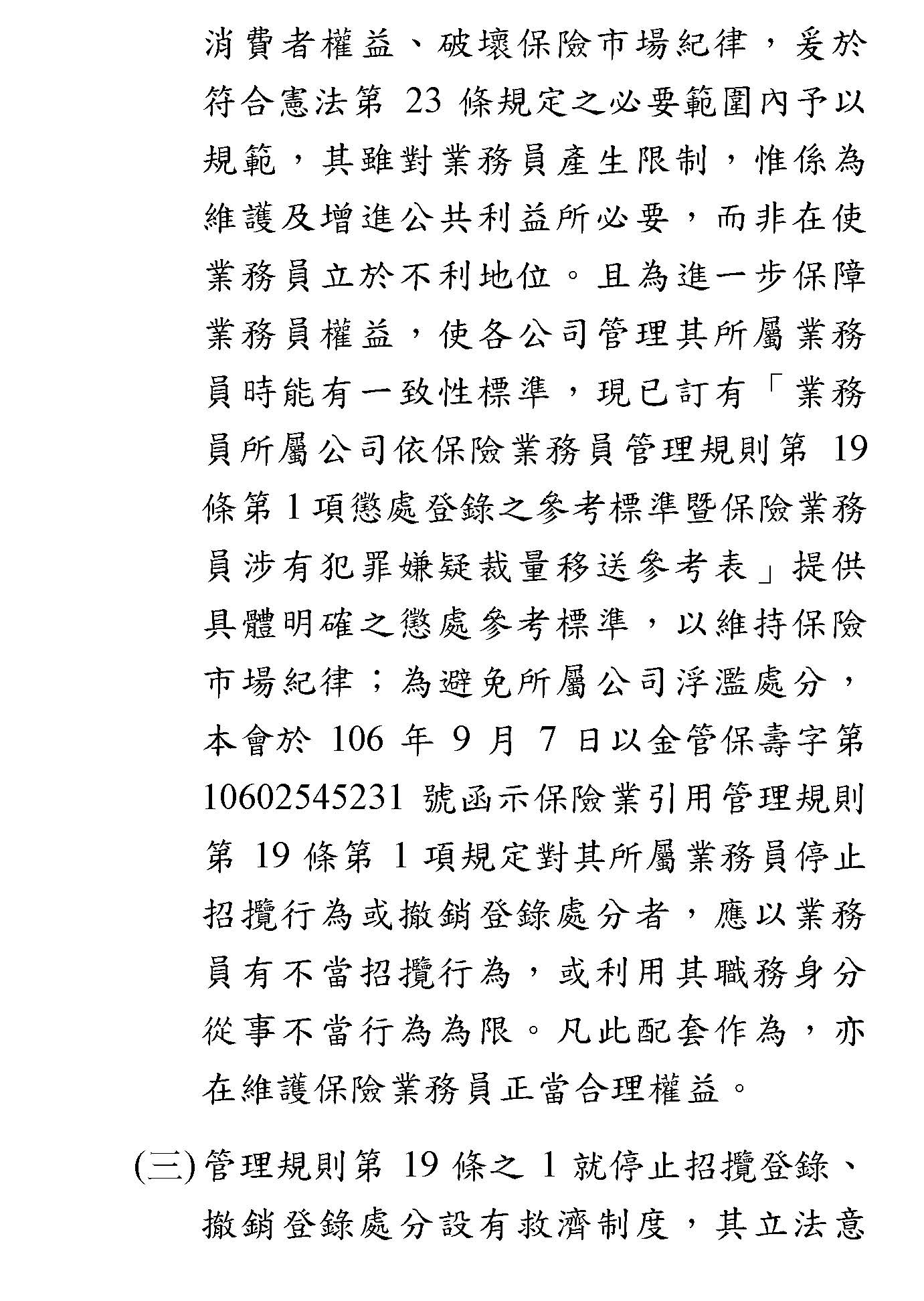 (二)管理規則第19條之停止招攬登錄、撤銷登錄處分,其該當事由均嚴重影響金融消費者權益、破壞保險市場紀律,爰於符合憲法第23條規定之必要範圍內予以規範,其雖對業務員產生限制,惟係為維護及增進公共利益所必要,而非在使業務員立於不利地位。且為進一步保障業務員權益,使各公司管理其所屬業務員時能有一致性標準,現已訂有「業務員所屬公司依保險業務員管理規則第19條第1項懲處登錄之參考標準暨保險業務員涉有犯罪嫌疑裁量移送參考表」提供具體明確之懲處參考標準,以維持保險市場紀律;為避免所屬公司浮濫處分,本會於106年9月7日以金管保壽字第10602545231號函示保險業引用管理規則第19條第1項規定對其所屬業務員停止招攬行為或撤銷登錄處分者,應以業務員有不當招攬行為,或利用其職務身分從事不當行為為限。凡此配套作為,亦在維護保險業務員正當合理權益。