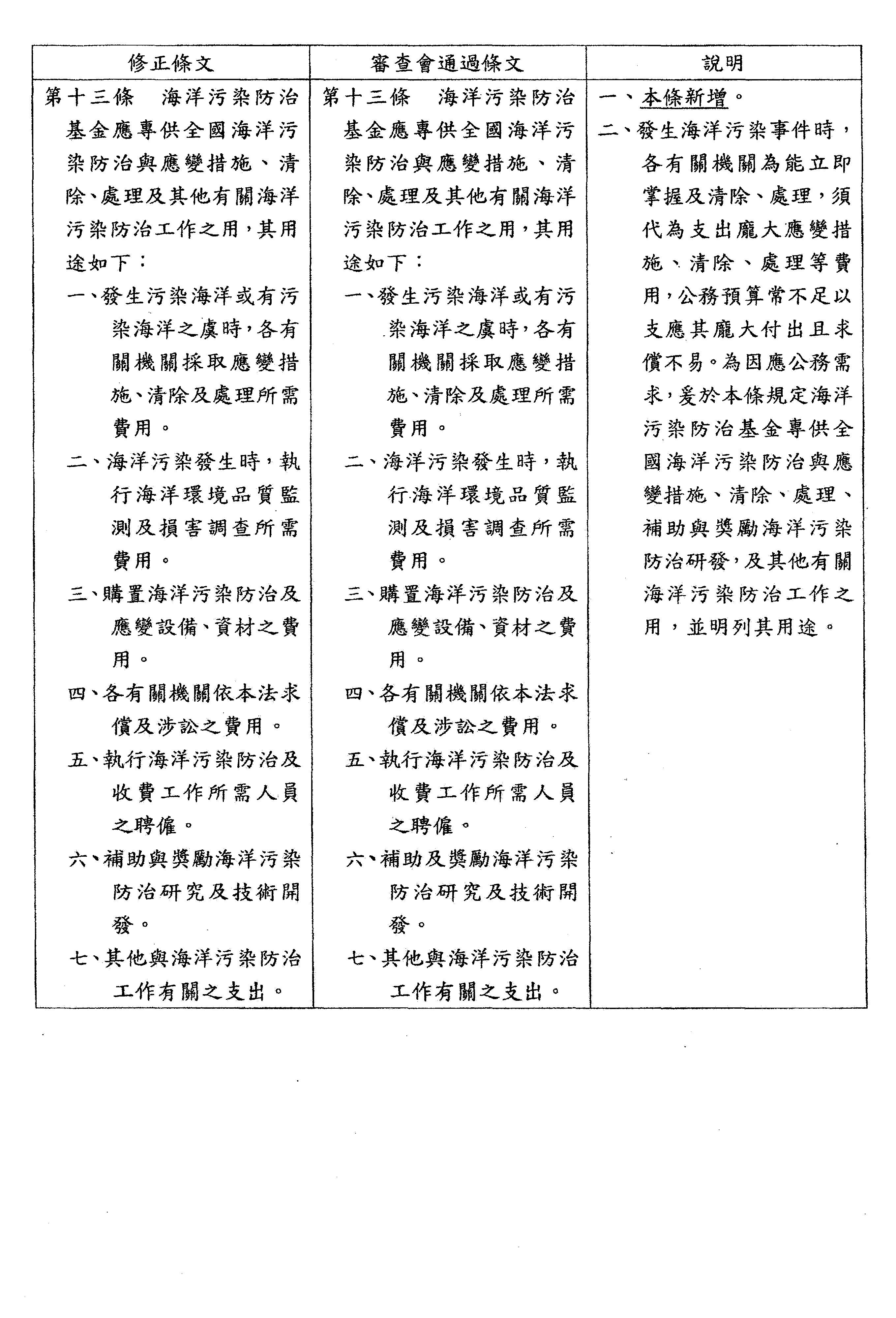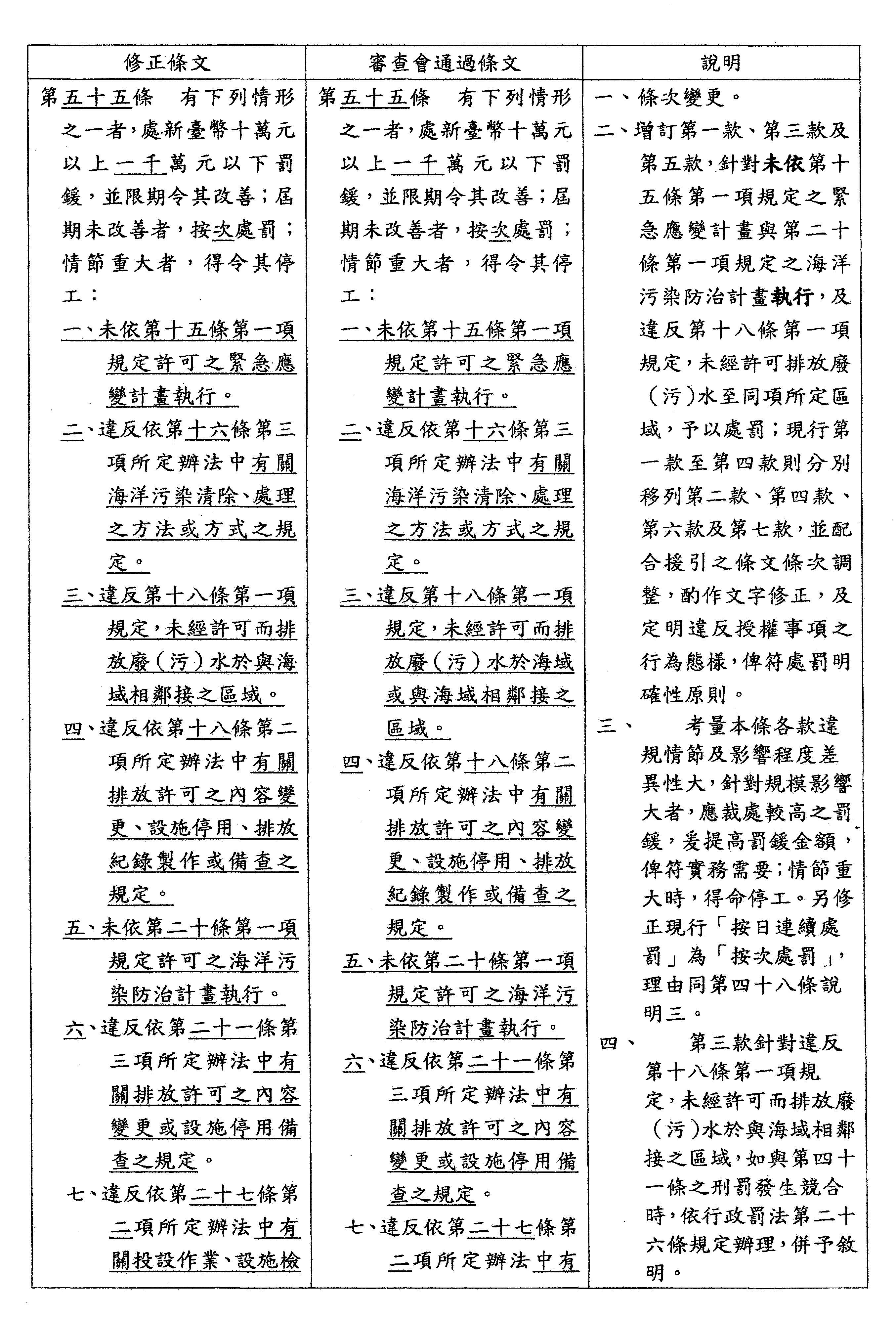 海洋污染防治法第十五條及第十六條條文修正草案對照表