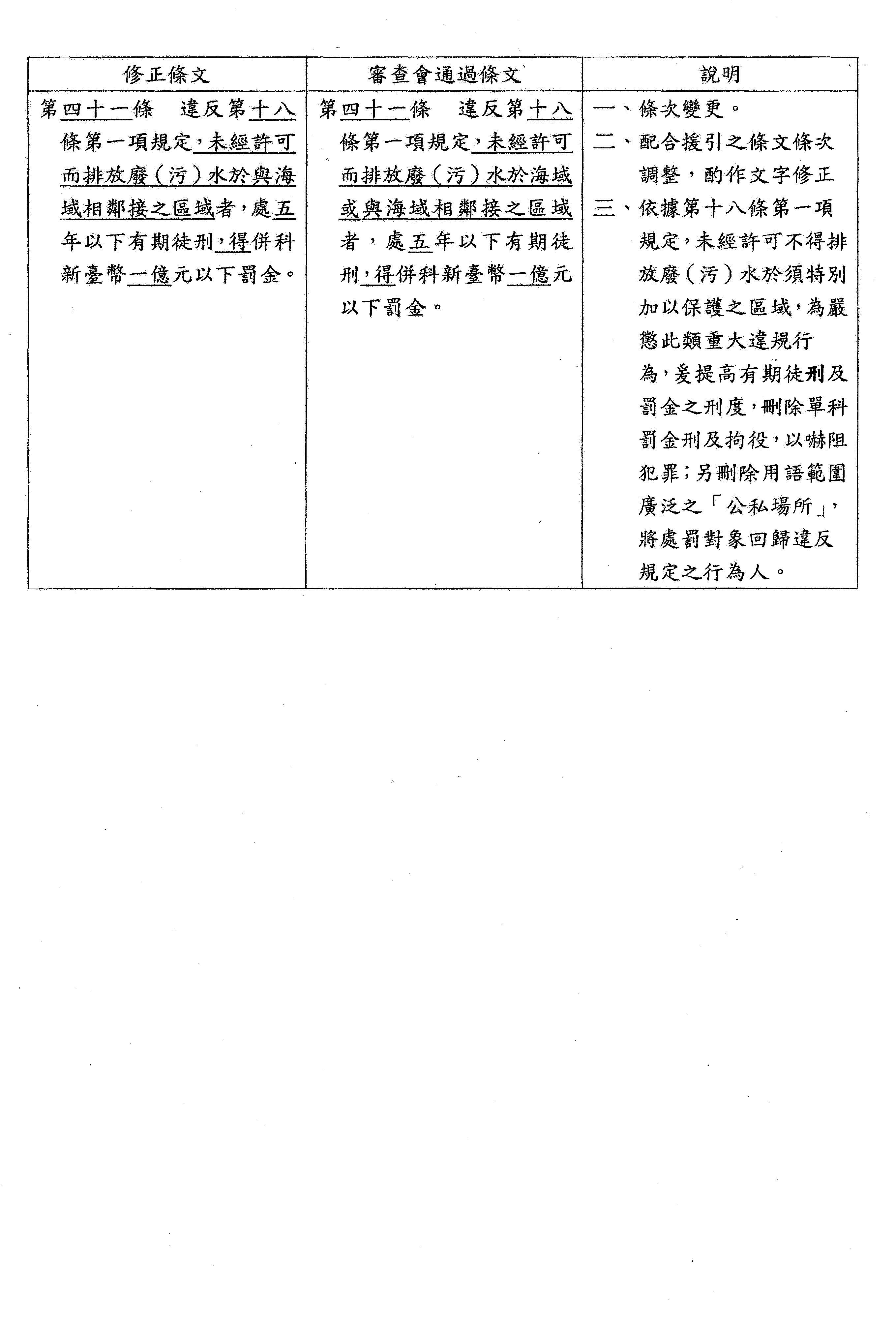 這次的修法,我其實也提出了兩個附帶決議。第一,要求讓違法行為人的裁罰資訊必須公開,嚇阻不良的從業者或行為人。第二,我也要求海委會建立水污法跟海污法,以整合治理的機制,納入相關政府單位,共同防治陸上污染對於海洋的破壞。很高興這兩個提議都順利通過。