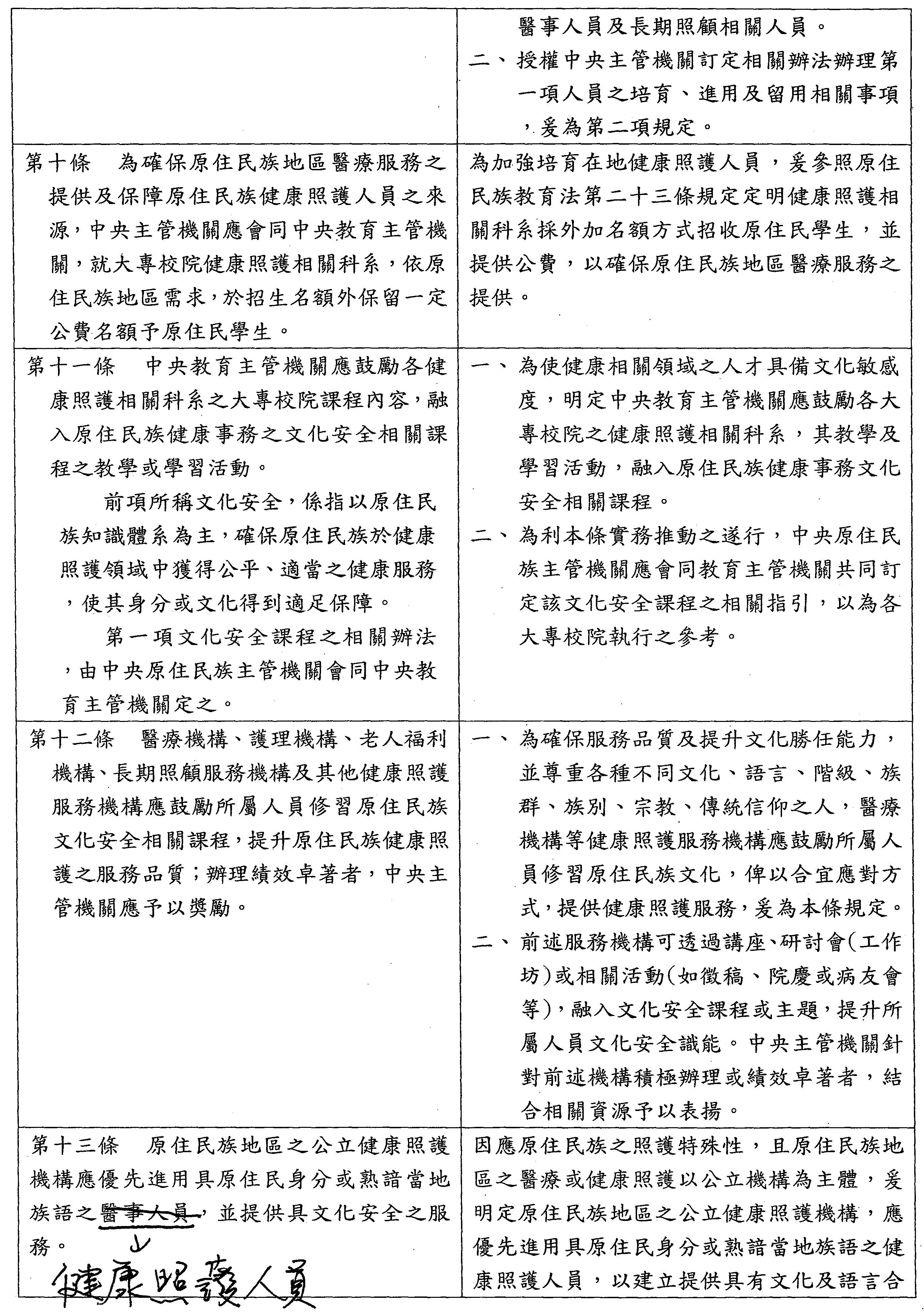 十一、明定健康執照護服務機構應鼓勵所屬人員修習原住民族文化,提升原住民族健康照護之服務品質,政府亦應給予鼓勵。(第十二條)