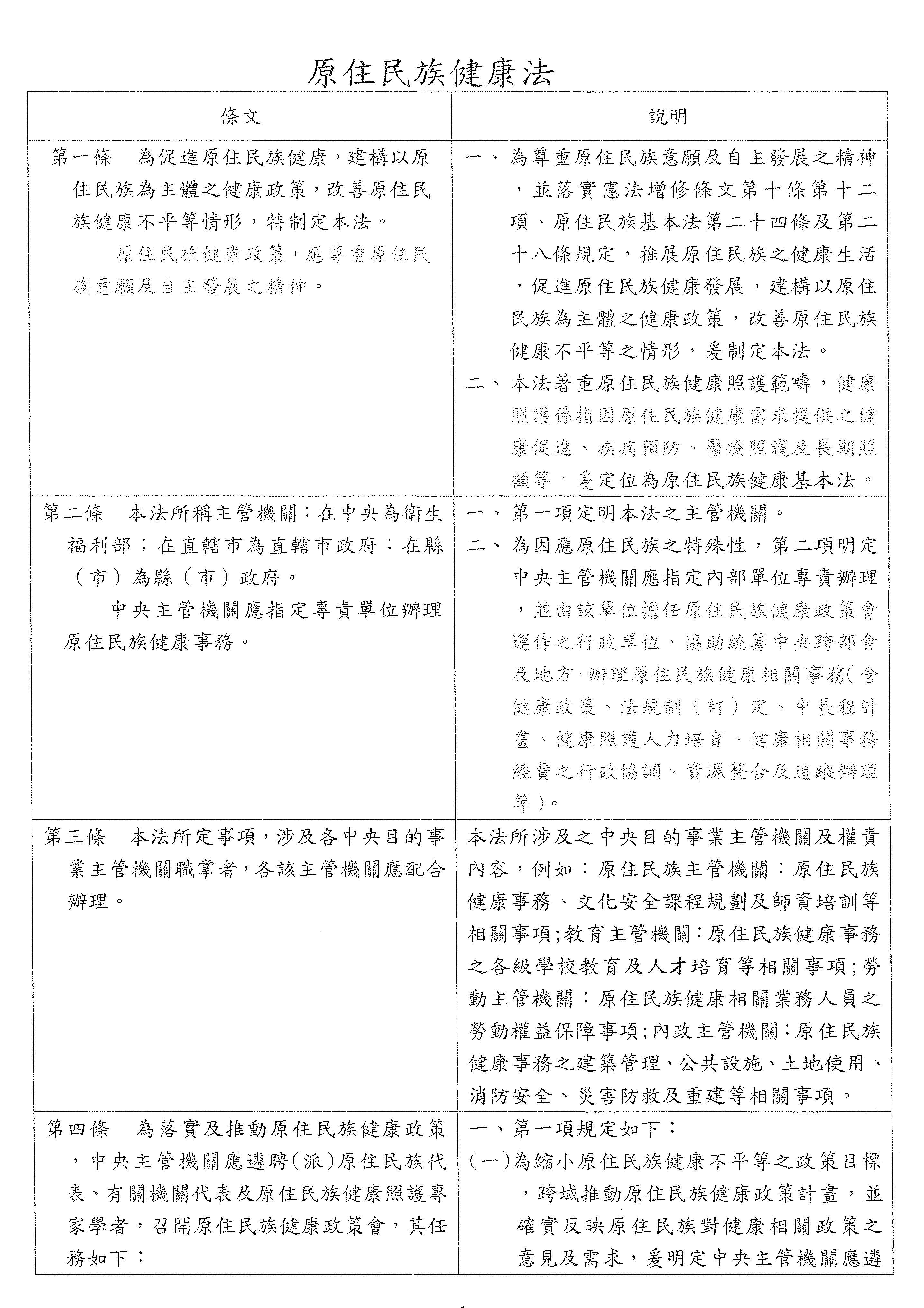 第一條 為尊重原住民族意願及自主發展之精神,建構以原住民族為主體之健康政策,促進原住民族之健康,改善原住民族健康不平等之情形,特制定本法。 |