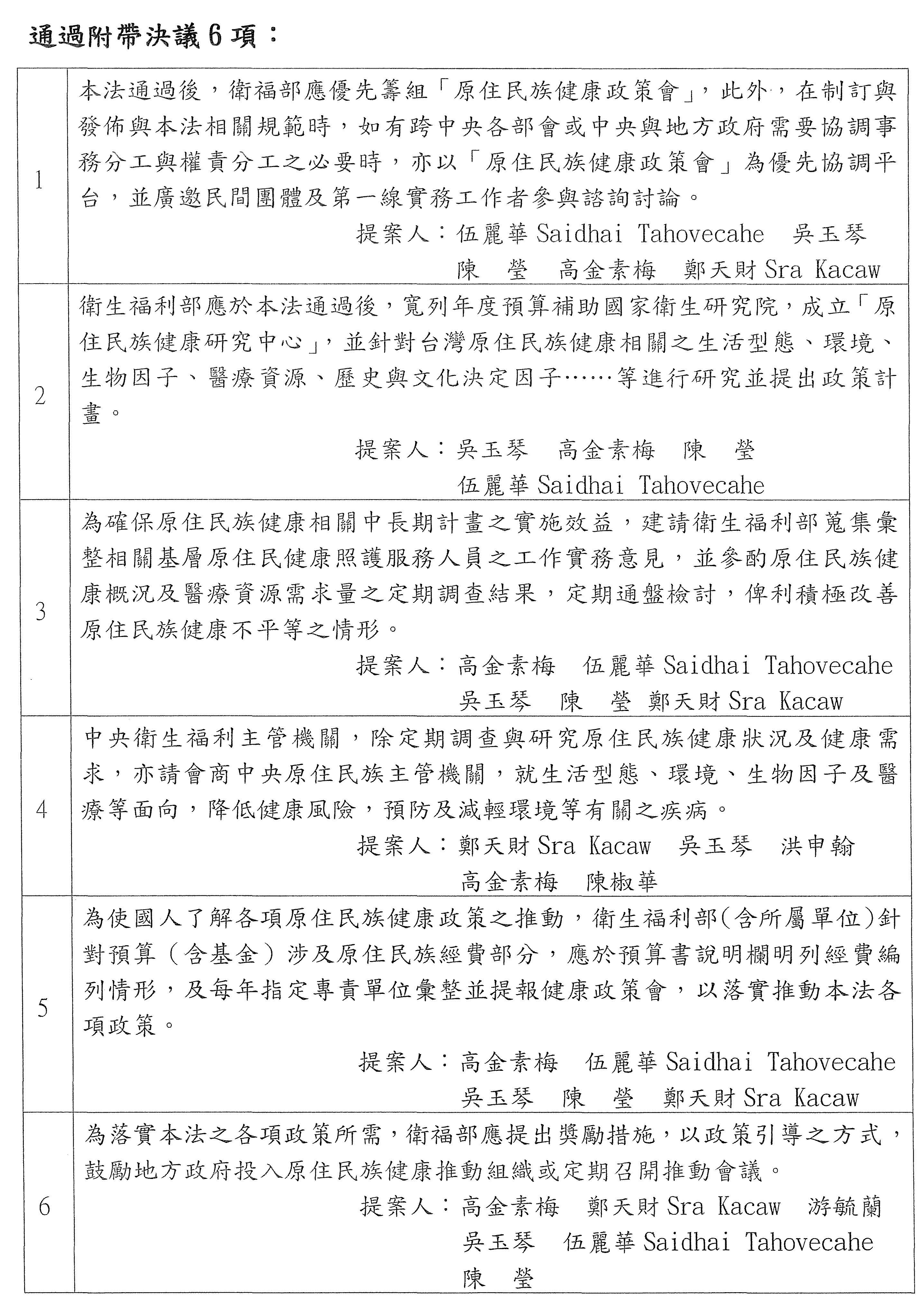 本院委員賴品妤、伍麗華Saidhai Tahovecahe、莊瑞雄等17人,為落實「原住民族基本法」第二十四條:「政府應依原住民族特性,策訂原住民族公共衛生及醫療政策,將原住民族地區納入全國醫療網,辦理原住民族健康照顧,建立完善之長期照護、緊急救護及後送體系,保障原住民族健康及生命安全」之精神,爰制定「原住民族健康法草案」。是否有當?敬請公決。