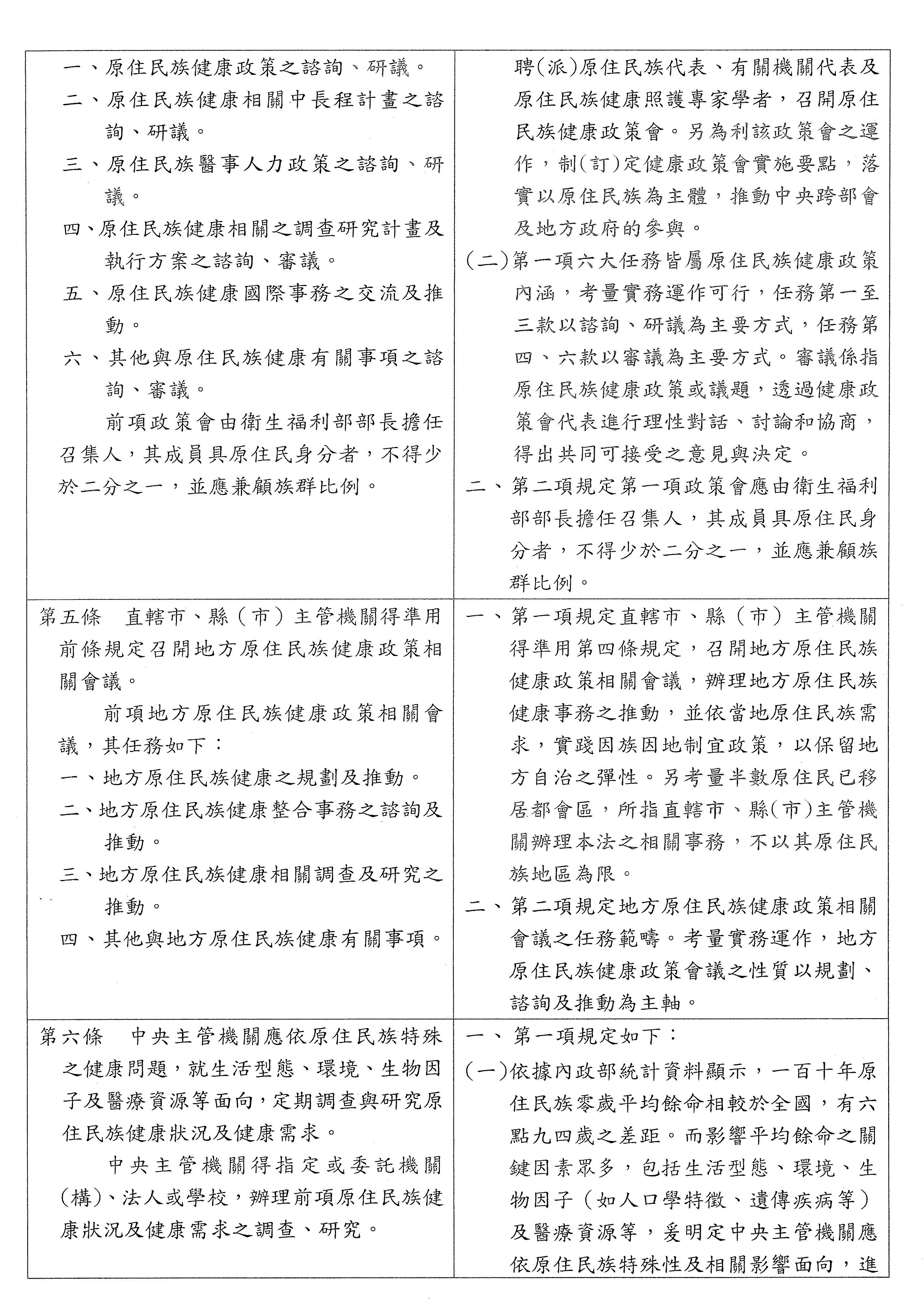 四、明定中央及地方應召開原住民族健康政策會。(第四條及第五條)