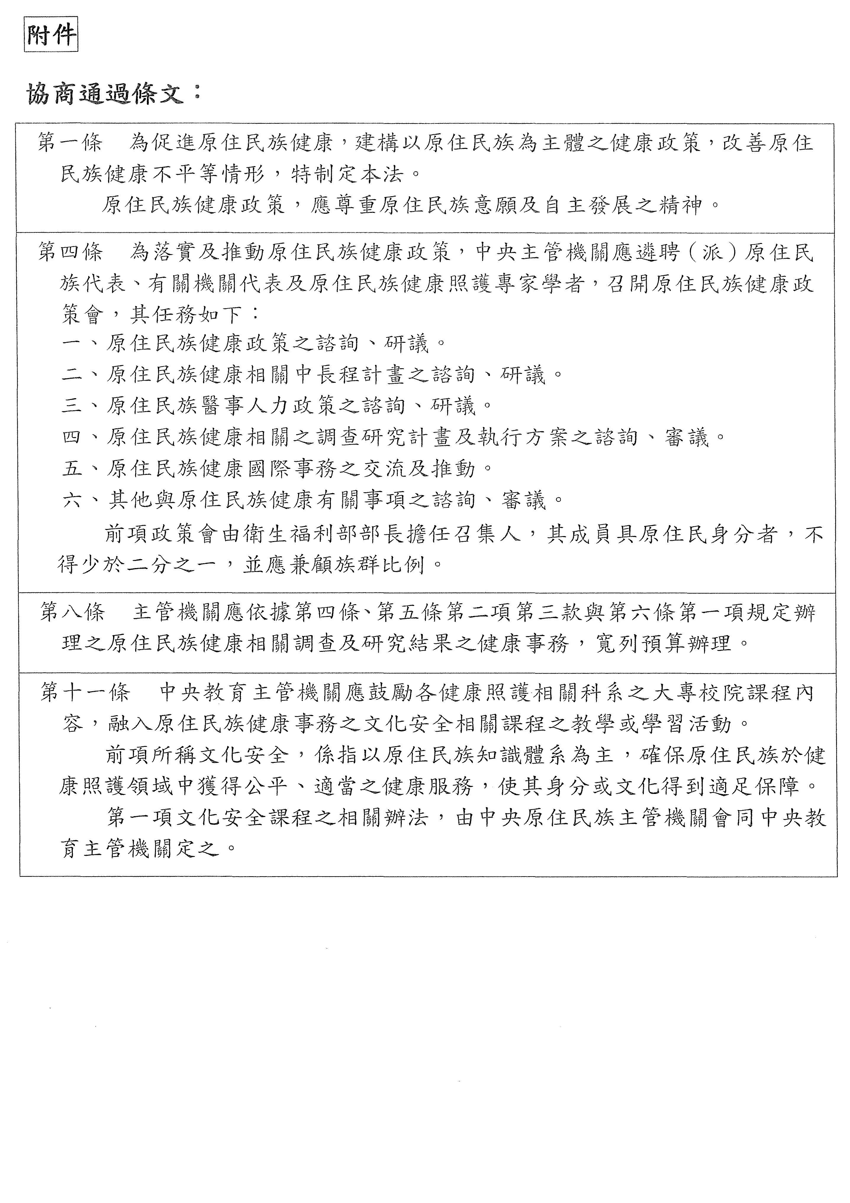 一、協商通過條文:第一條、第四條、第八條及第十一條,如附件。