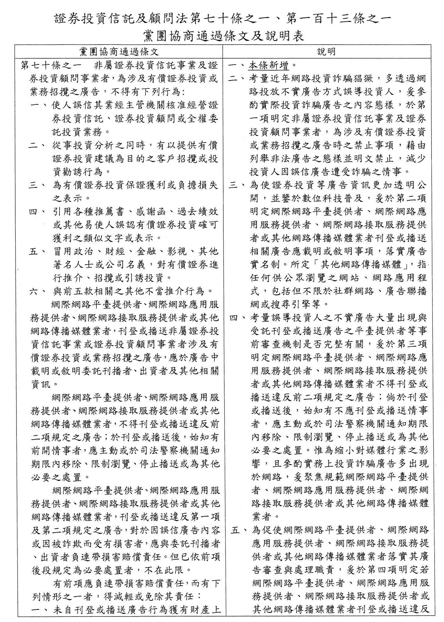 一、本條新增。 二、現行條文第七十條已明定證券投資信託事業及證券投資顧問事業從事廣告、公開說明會及其他營業活動之限制、禁止及其他應遵行事項之規則由主管機關定之,故該等事業進行前開業務應依本法及相關規定辦理。另依現行條文第六條規定,非依本法不得經營證券投資信託、證券投資顧問或全權委託投資業務,爰於第一項明定非屬證券投資信託事業及證券投資顧問事業者,不得從事涉及特許業務之相關廣告等行為。 三、考量近年網路投資詐騙猖獗,多透過網路投放不實廣告方式誤導投資人,爰參酌實際投資詐騙廣告之內容態樣,於第二項明定非屬證券投資信託事業及證券投資顧問事業者,為涉及有價證券投資或業務招攬之廣告時之禁止事項,藉由列舉非法廣告之態樣並明文禁止,減少投資人因誤信廣告遭受詐騙之情事。 四、為使證券投資等廣告資訊更加透明公開,並鑒於數位科技普及,爰於第三項明定網際網路平臺提供者、網際網路應用服務提供者、網際網路接取服務提供者或其他網路傳播媒體業者刊登或播送相關廣告應載明或敘明事項,落實廣告實名制。所定「其他網路傳播媒體」,指任何供公眾瀏覽之網站、網路應用程式,包括但不限於社群網路、廣告聯播網或搜尋引擎等。 五、考量誤導投資人之不實廣告大量出現與受託刊登或播送廣告之平臺提供者等事前審查機制是否完整有關,爰於第四項明定網際網路平臺提供者、網際網路應用服務提供者、網際網路接取服務提供者或其他網路傳播媒體業者不得刊登或播送違反第一項至第三項規定之廣告;倘於刊登或播送後,始知有不應刊登或播送情事者,應立即移除、限制瀏覽、停止播送或為其他必要之處置。惟為縮小對媒體行業之影響,且參酌實務上投資詐騙廣告多出現於網路,爰聚焦規範網際網路平臺提供者、網際網路應用服務提供者、網際網路接取服務提供者或其他網路傳播媒體業者。 六、為促使網際網路平臺提供者、網際網路應用服務提供者、網際網路接取服務提供者或其他網路傳播媒體業者落實其廣告審查與處理職責,爰於第五項明定若網際網路平臺提供者、網際網路應用服務提供者、網際網路接取服務提供者或其他網路傳播媒體業者刊登或播送違反第一項至第三項規定之廣告,使他人誤信或被詐欺而受有損害,應與委託刊播者、出資者負連帶損害賠償責任,並於但書定明得減輕或免除其連帶損害賠償責任之情形。