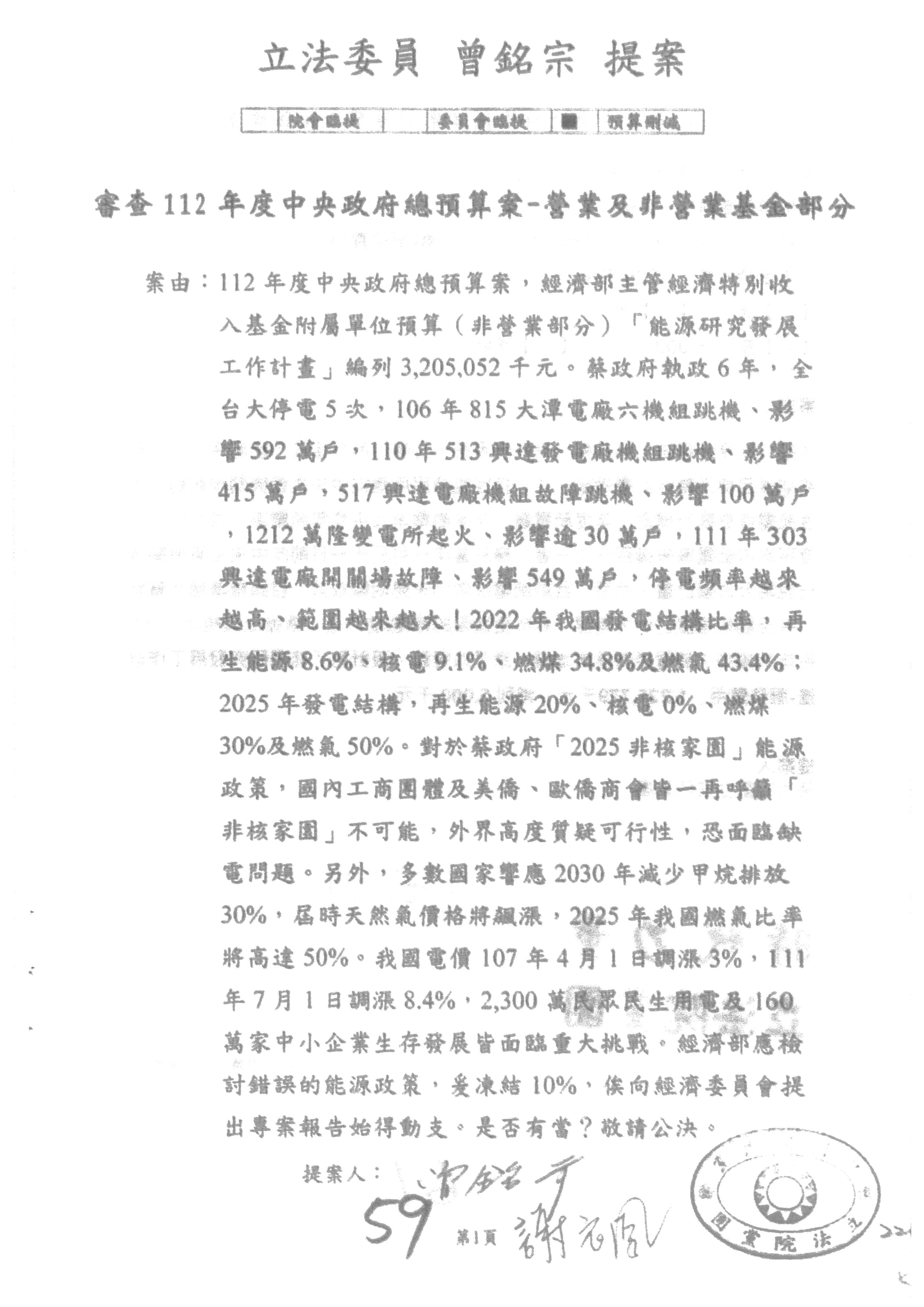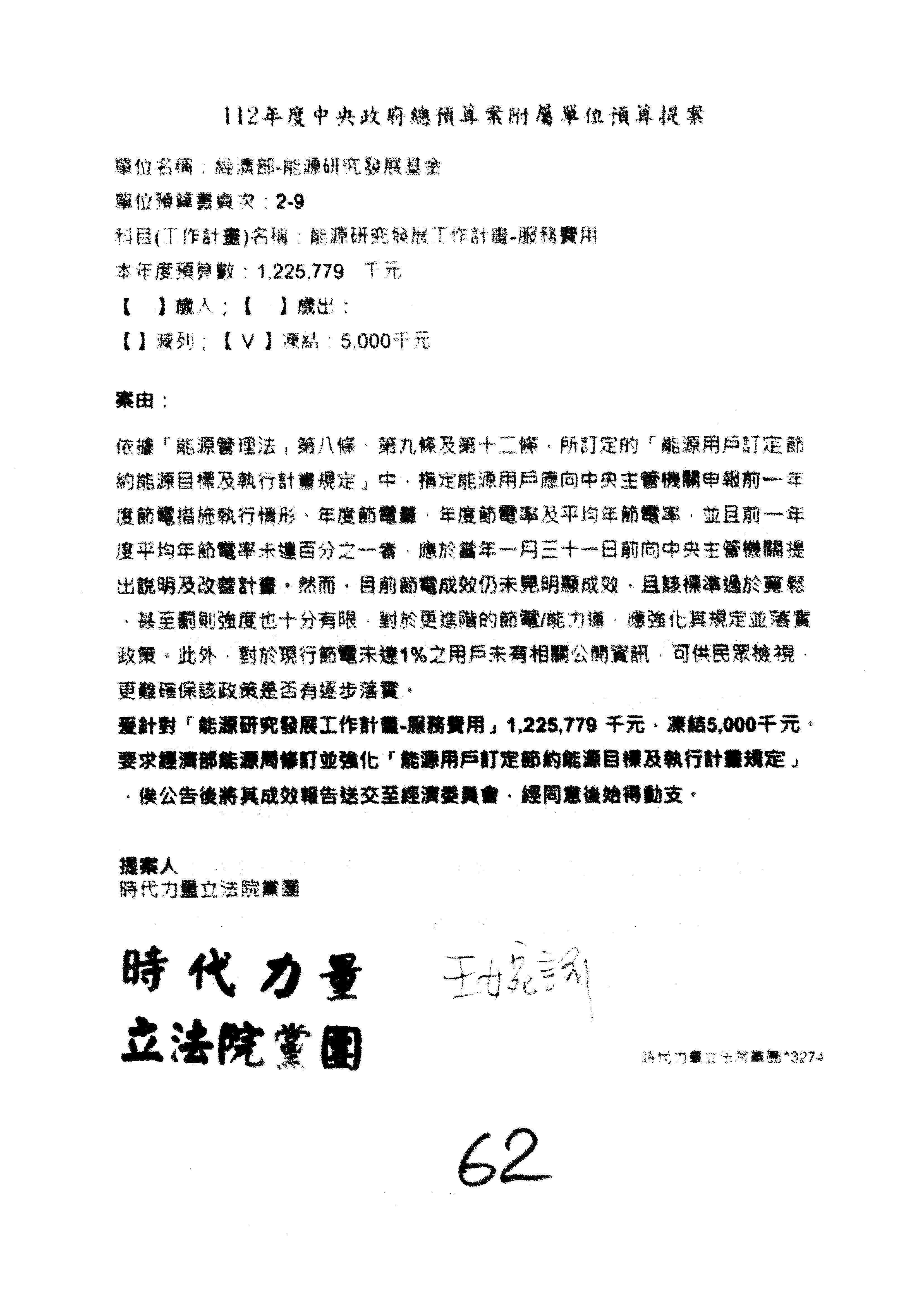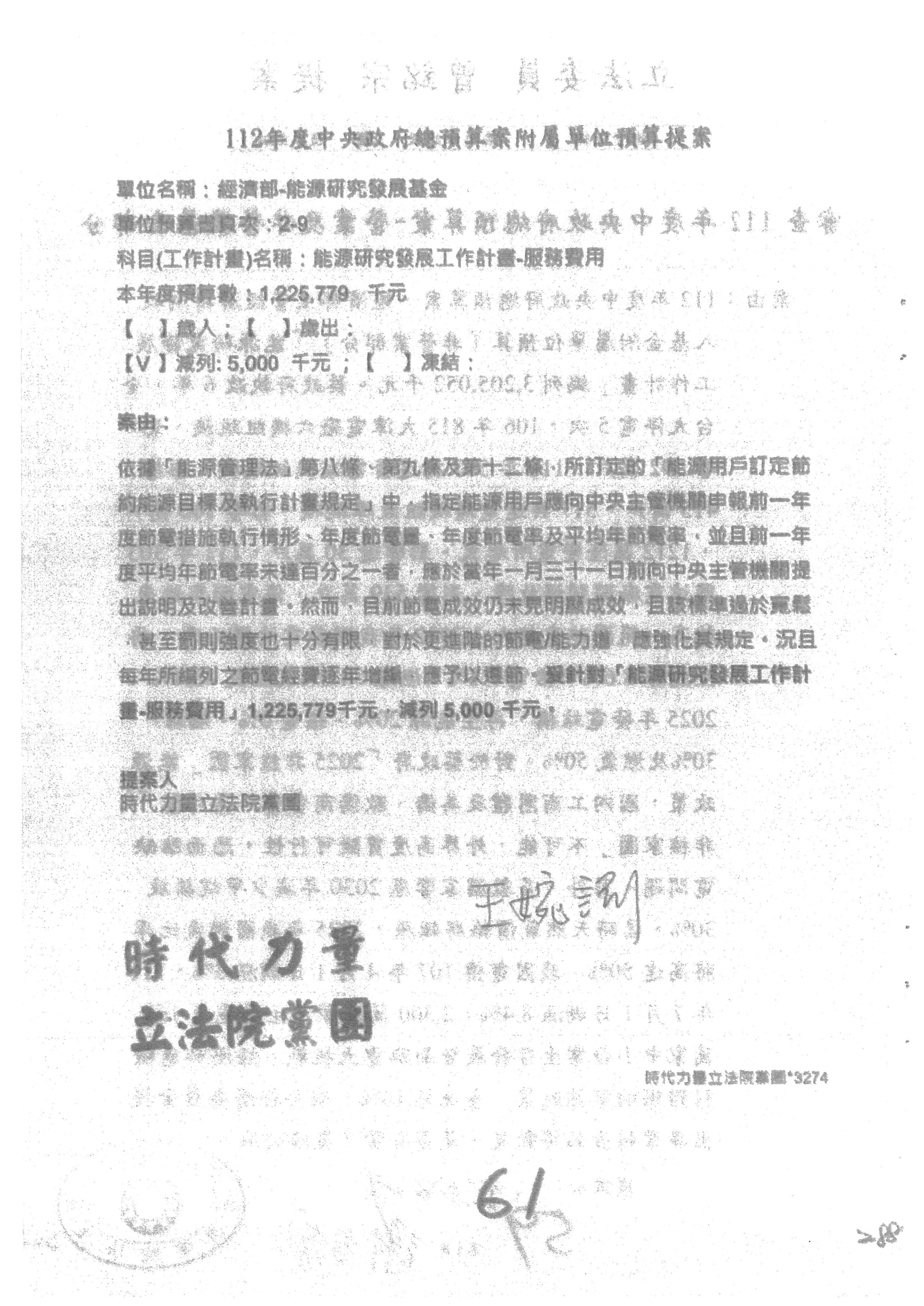 本次附屬單位預算,感謝支持時力黨團多個提案通過,其中有非常多好的提案,希望公部門能夠執行;其次,很遺憾沒有通過包括台電協和電廠四接案有地方反彈及選址爭議的凍結案;另外,針對台電10%購煤預算173億元的提案,時力黨團提出刪減,很遺憾也沒有通過;關於減煤減碳降空污的預算,包括讓中火提前於2035年除役之主決議也遭否決,時力黨團表達非常地遺憾。