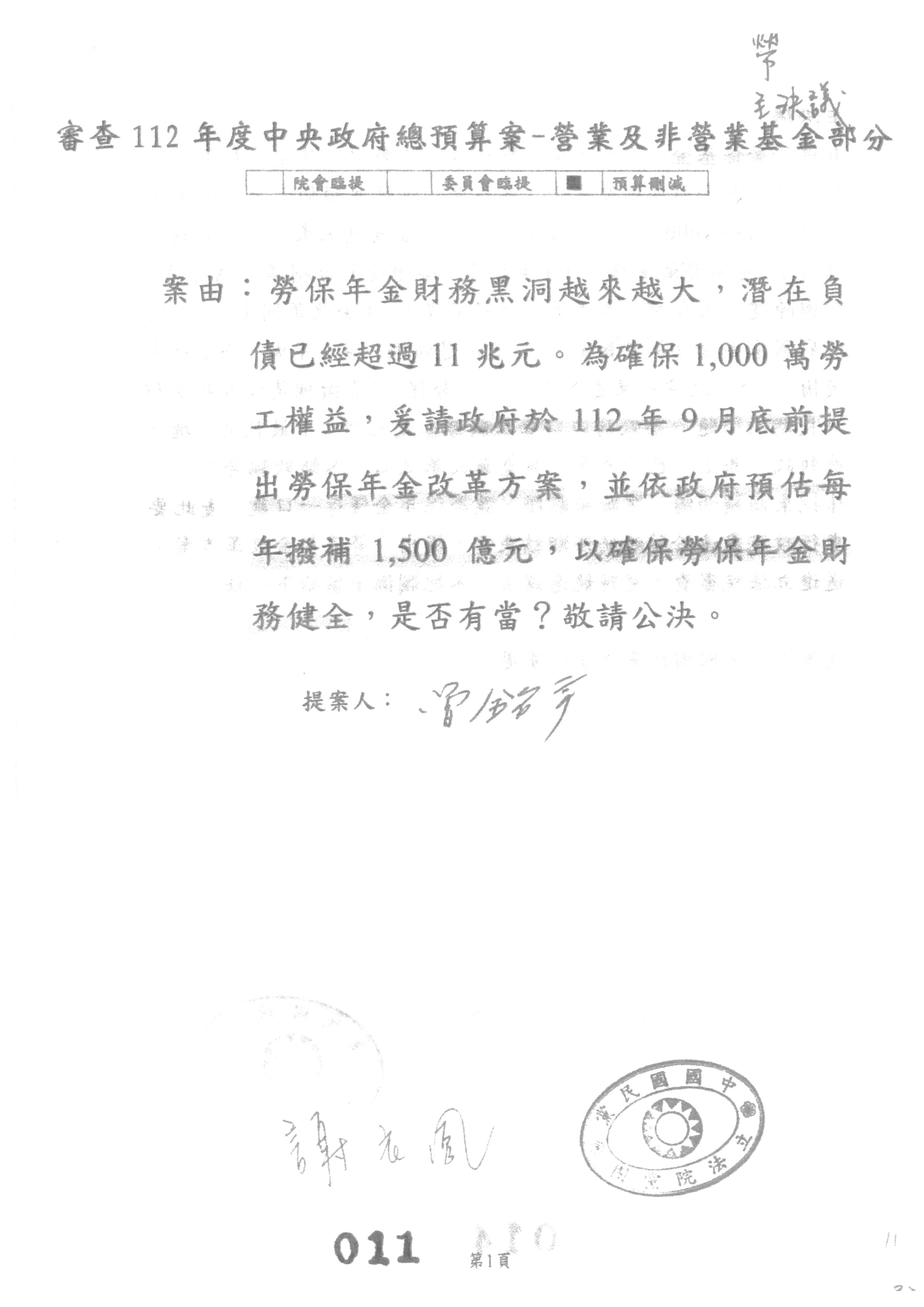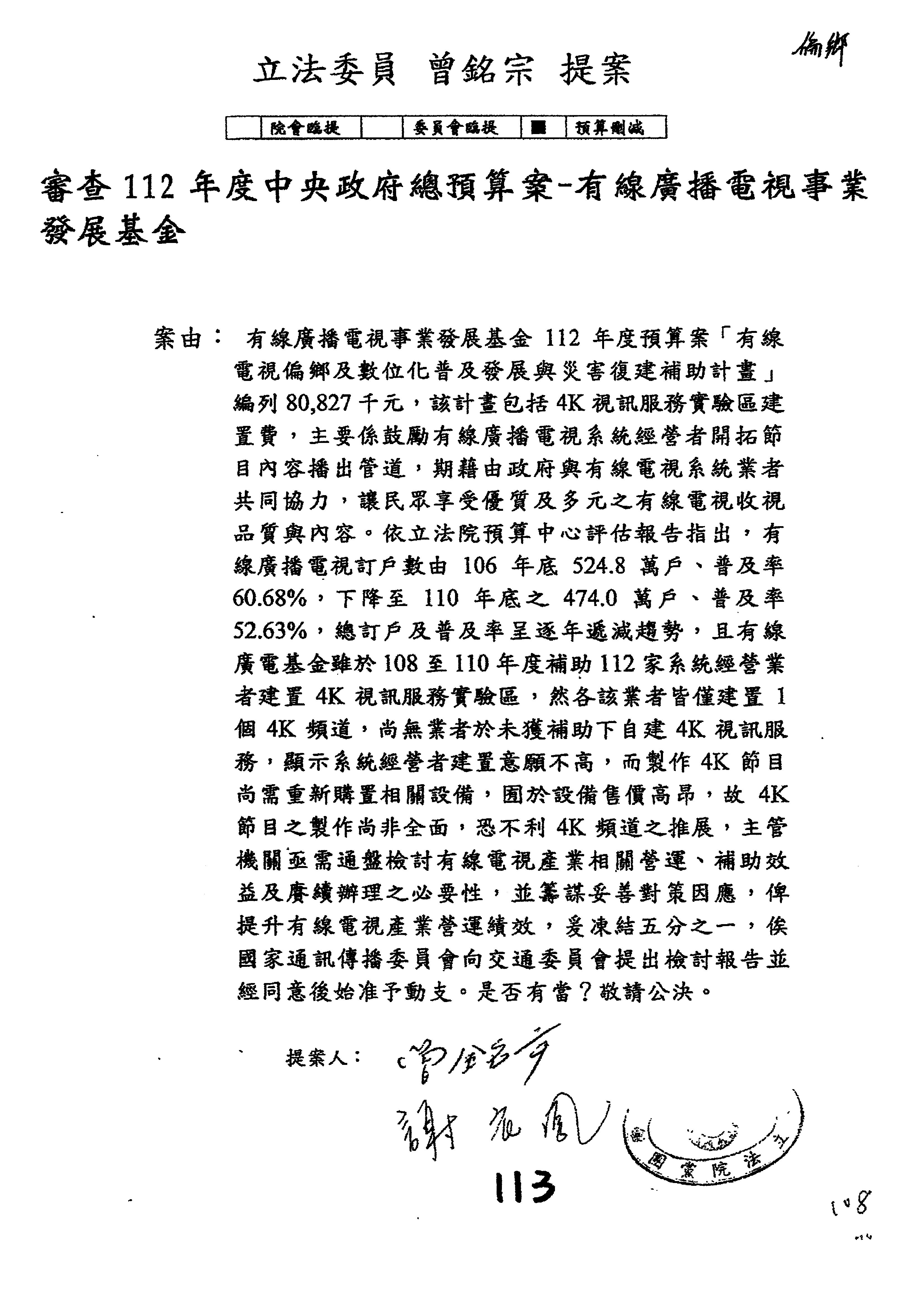 曾委員銘宗:(15時59分)謝謝院長。各位同仁,大家好。剛剛通過112年度基金預算,包括營業、非營業,總收入6兆4,646億元,總支出6兆5,096億元,虧損450億元,固定資產總投資4,442億元,希望相關機構及單位儘快推動,能對今年經濟成長率到底能不能保2注入強心針,希望能夠趕快推動,以加速經濟發展,也創造更好的就業機會,這是第一點。
