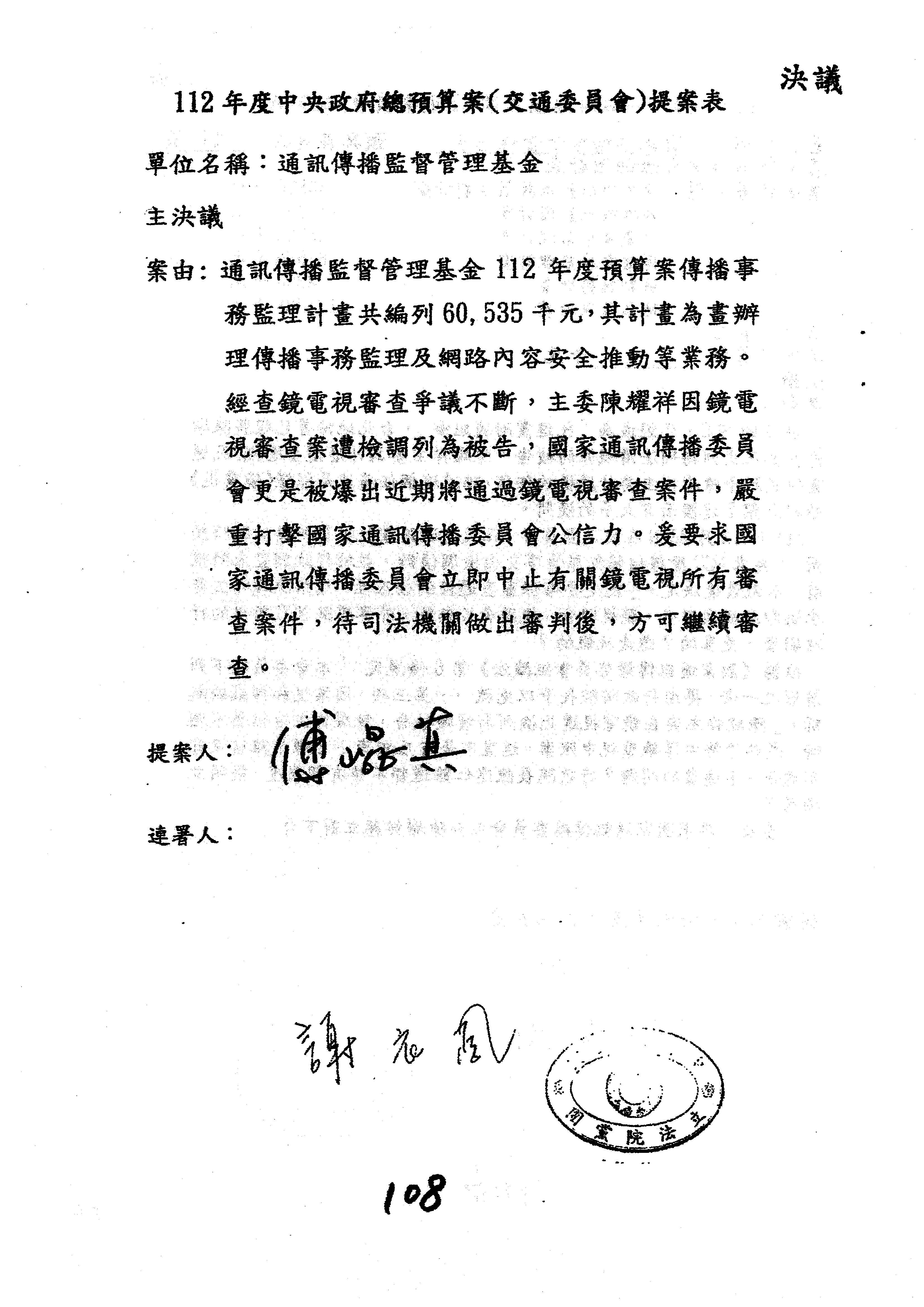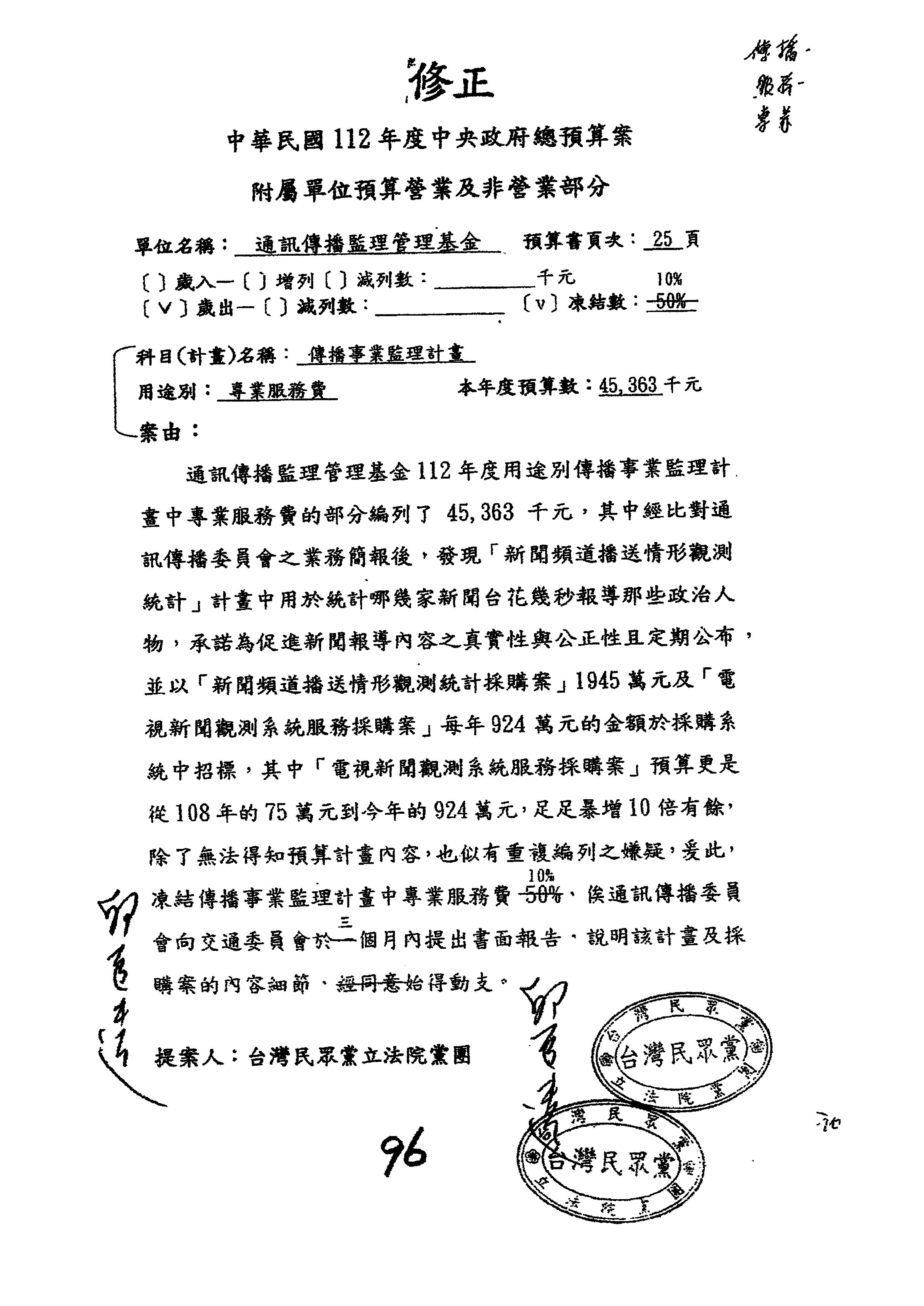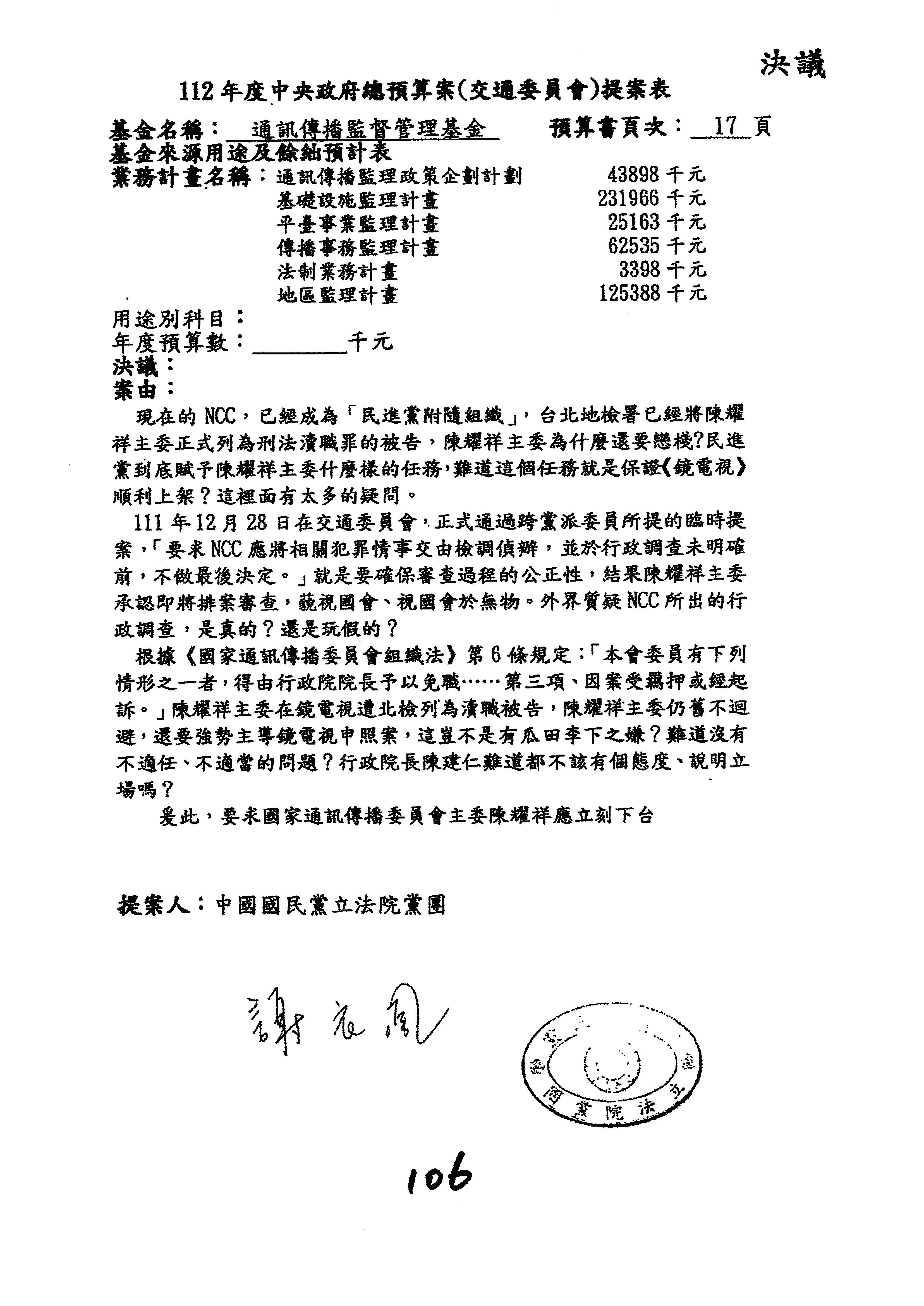 主席:現在進行表決。現有民進黨黨團要求記名表決,記名表決,時間1分鐘,現在開始。