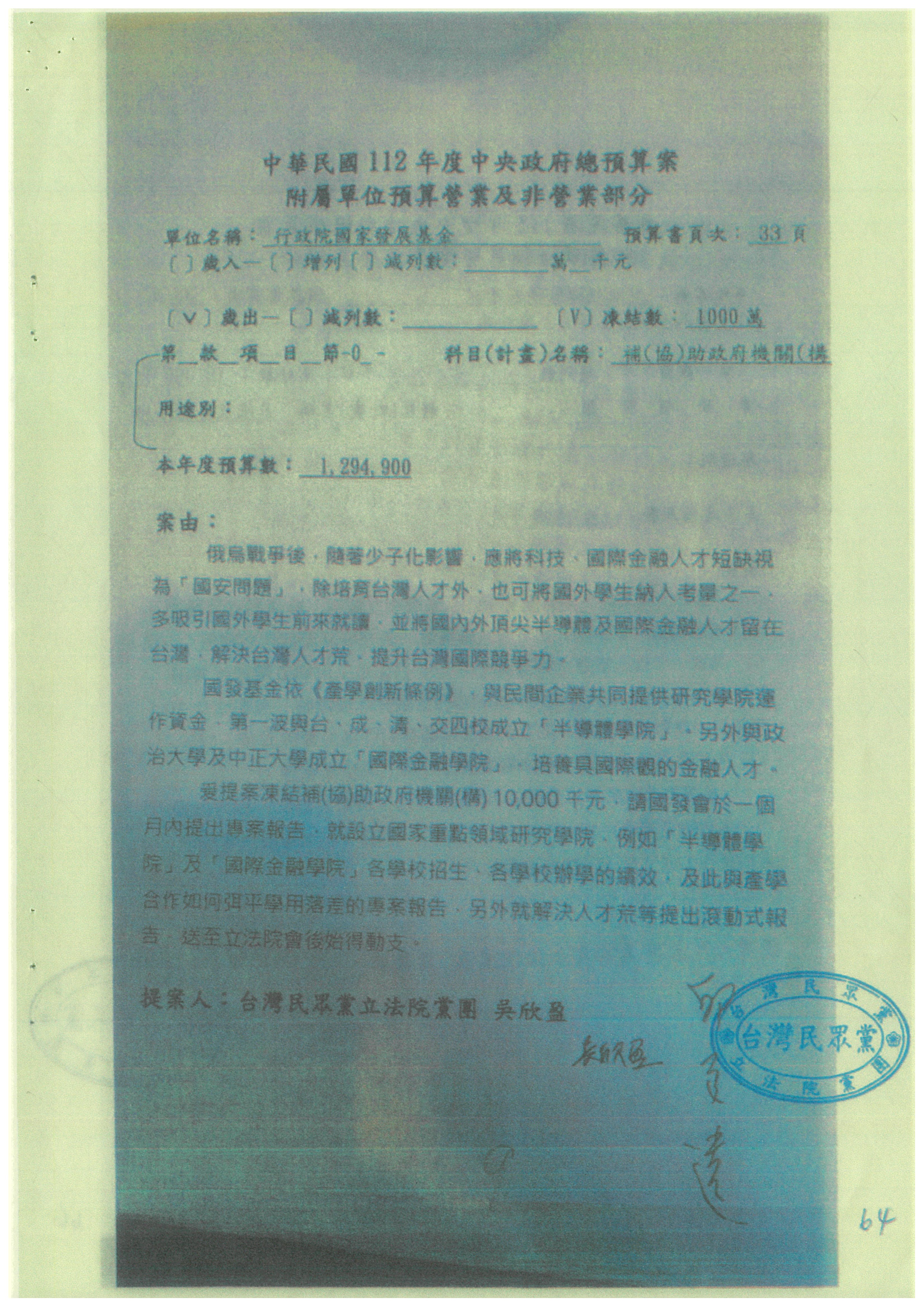除了刪減與凍結案之外,時力黨團也針對已經通過的預算提出主決議,希望行政單位執行預算時應特別重視。為了推動國家永續發展,我國的預算應符合永續發展指標,時力黨團為國人監督預算,希望預算執行的時候,也可以依照預算案的主決議來執行,讓國家預算更有效地運用。以上,謝謝。