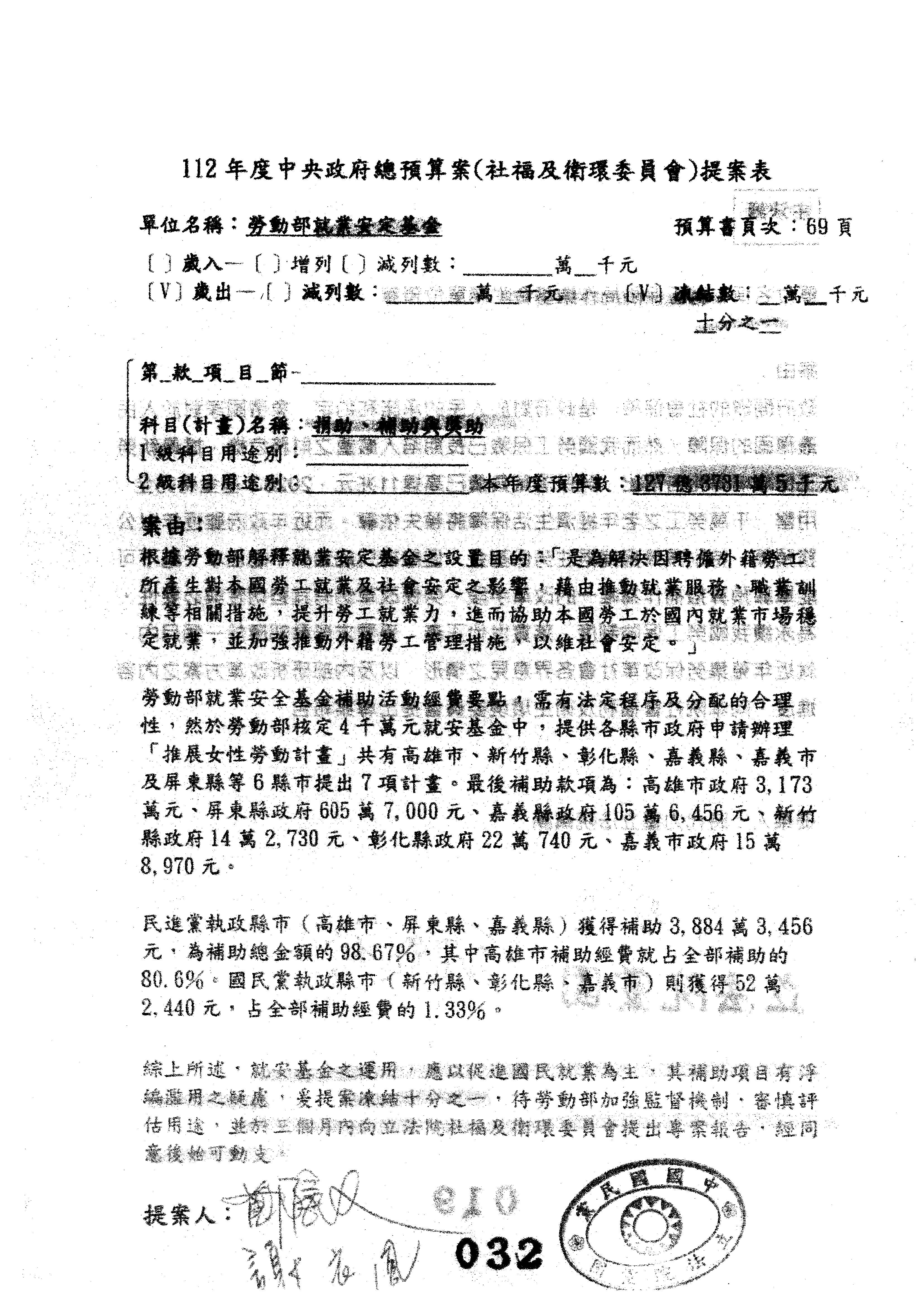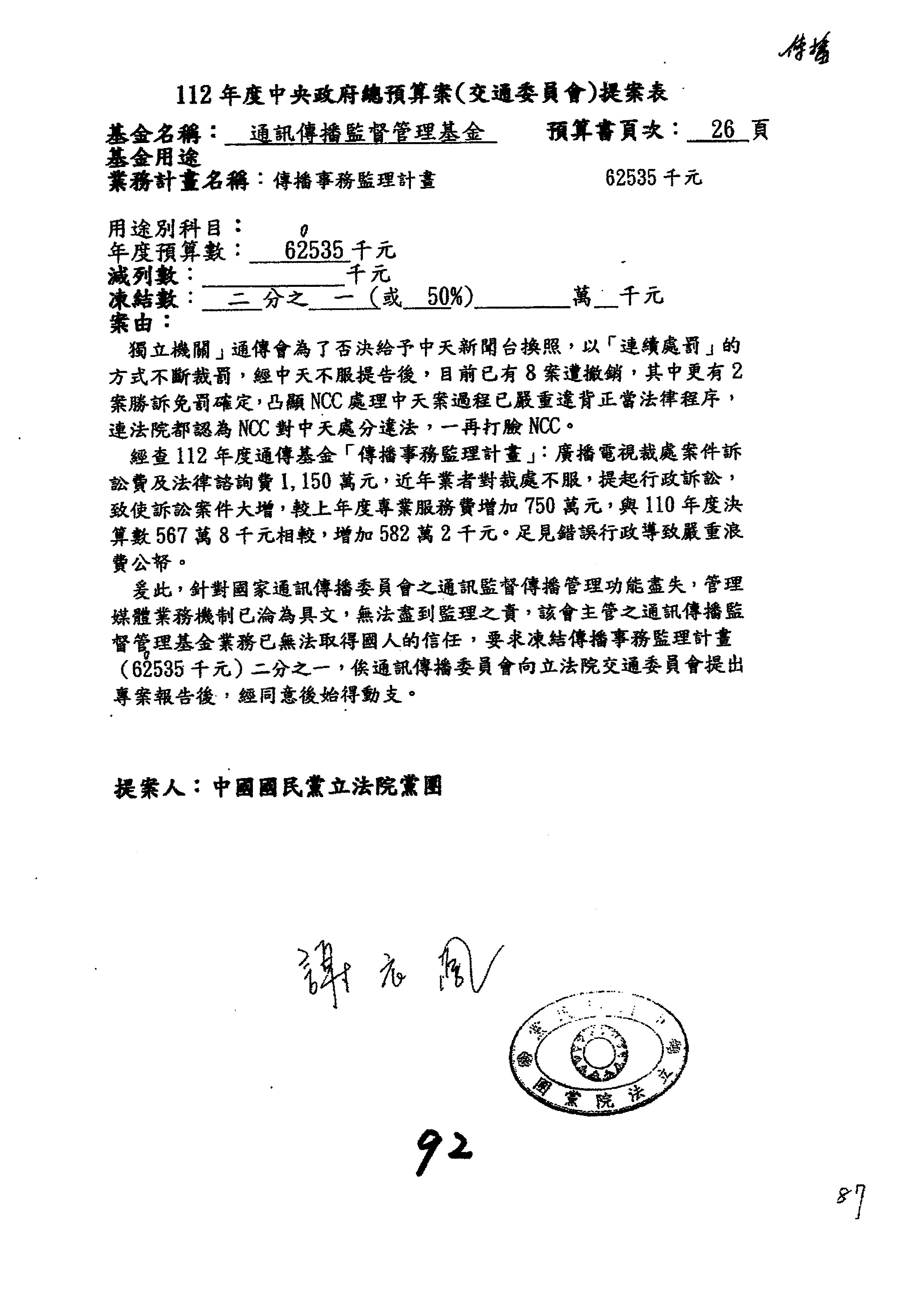 主席:報告表決結果:出席委員92人,贊成者1人,反對者57人,棄權者34人,贊成者少數,本案不通過。