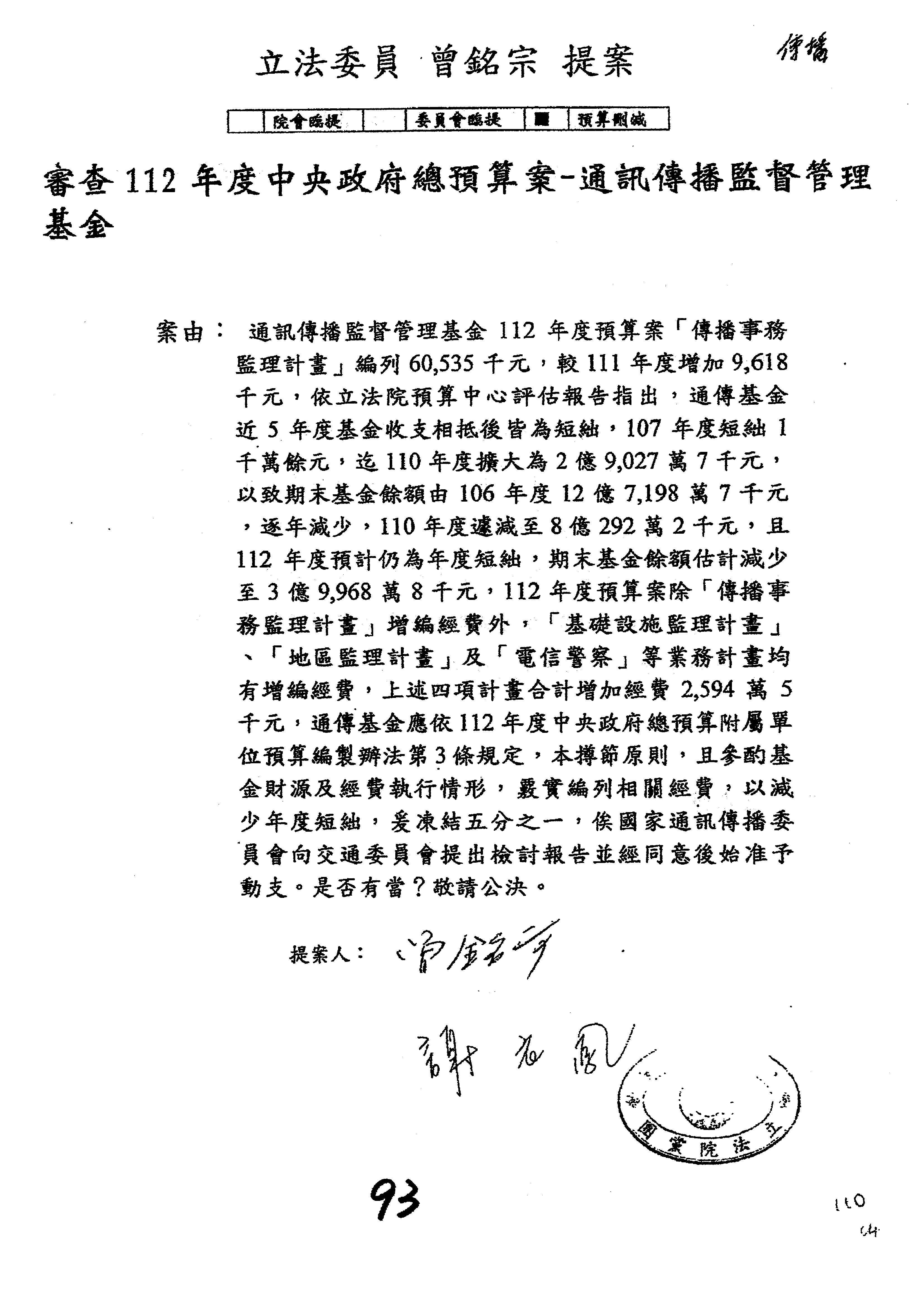 主席:報告表決結果:出席委員92人,贊成者6人,反對者57人,棄權者29人,贊成者少數,本案不通過。