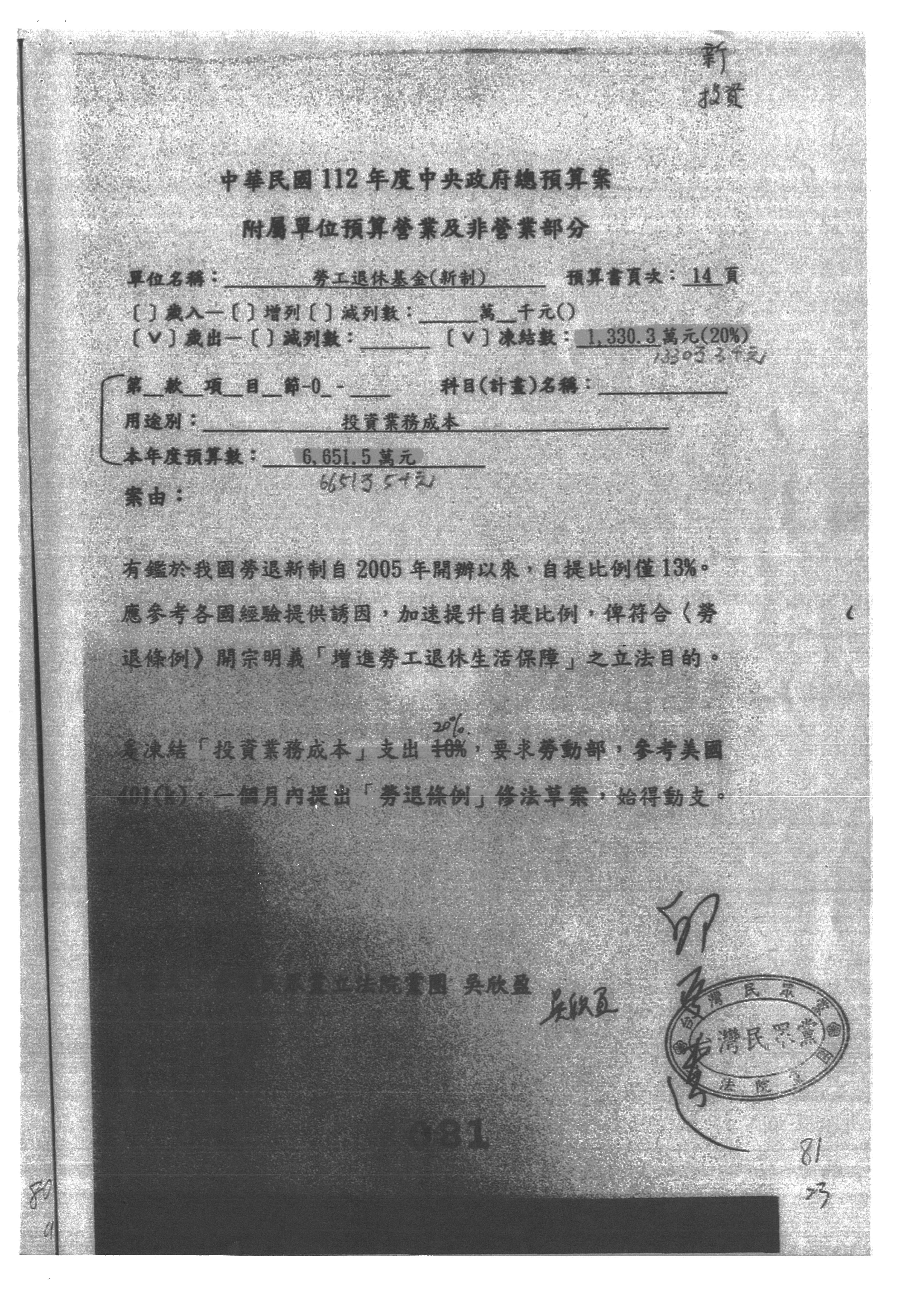 中華民國112年度中央政府總預算案附屬單位預算及綜計表非營業部分─信託基金項下,計有勞工退休基金(舊制)、勞工退休基金(新制)、積欠工資墊償基金、資源回收管理基金─信託基金部分、保險業務發展基金及公務人員退休撫卹基金等18個基金,總收入2,123億1,398萬4千元,總支出129億5,627萬9千元,本期賸餘1,993億5,770萬5千元。審議結果,增列總收入10億0,230萬元,減列總支出340萬元,增列本期賸餘10億0,570萬元,改列為2,003億6,340萬5千元。