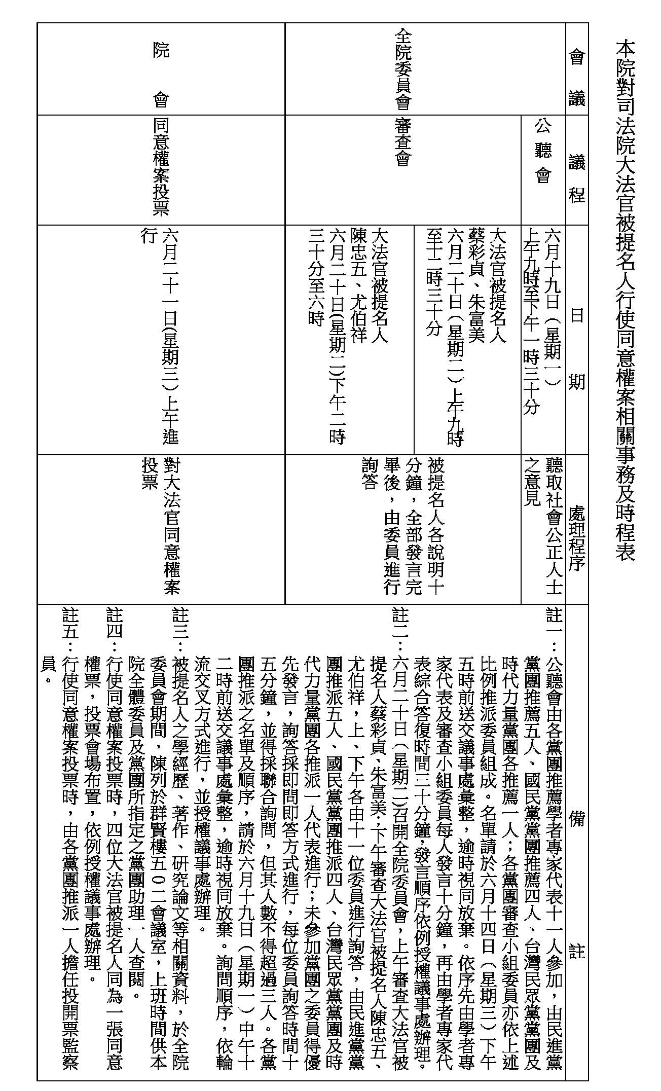 (二)6月20日(星期二)召開全院委員會,上午審查司法院大法官被提名人蔡彩貞、朱富美;下午審查司法院大法官被提名人陳忠五、尤伯祥,上、下午各由11位委員進行詢答,由民進黨黨團推派5人、國民黨黨團推派4人、台灣民眾黨黨團及時代力量黨團各推派1人代表進行;未參加黨團之委員得優先發言。詢答採即問即答方式進行,每位委員詢答時間15分鐘,並得採聯合詢問,但其人數不得超過3人,各黨團推派之名單及順序,請於6月19日(星期一)中午12時前送交議事處彙整,逾時視同放棄。審查完畢後,於6月21日(星期三)院會進行同意權案投票表決。(同意權相關事務及時程如附表)