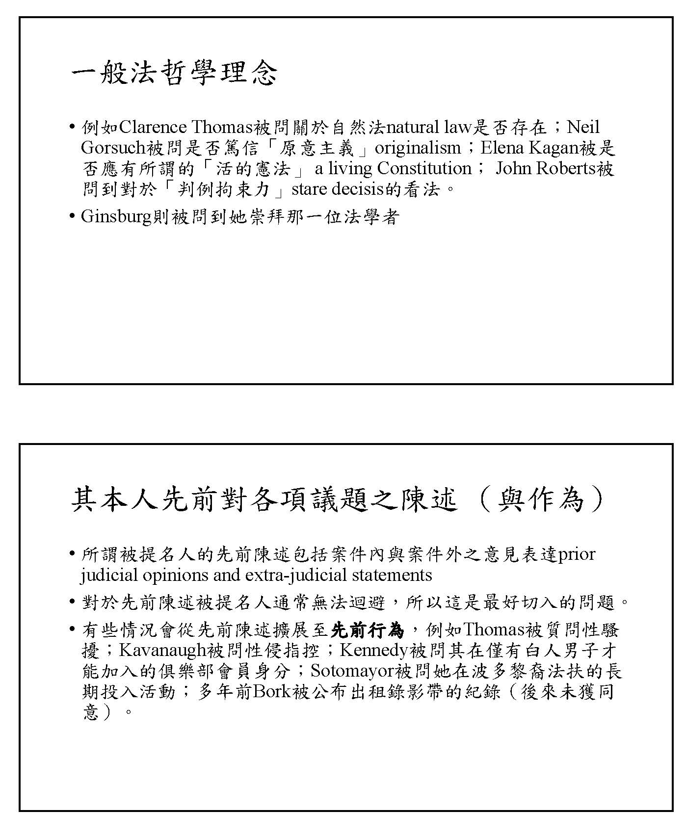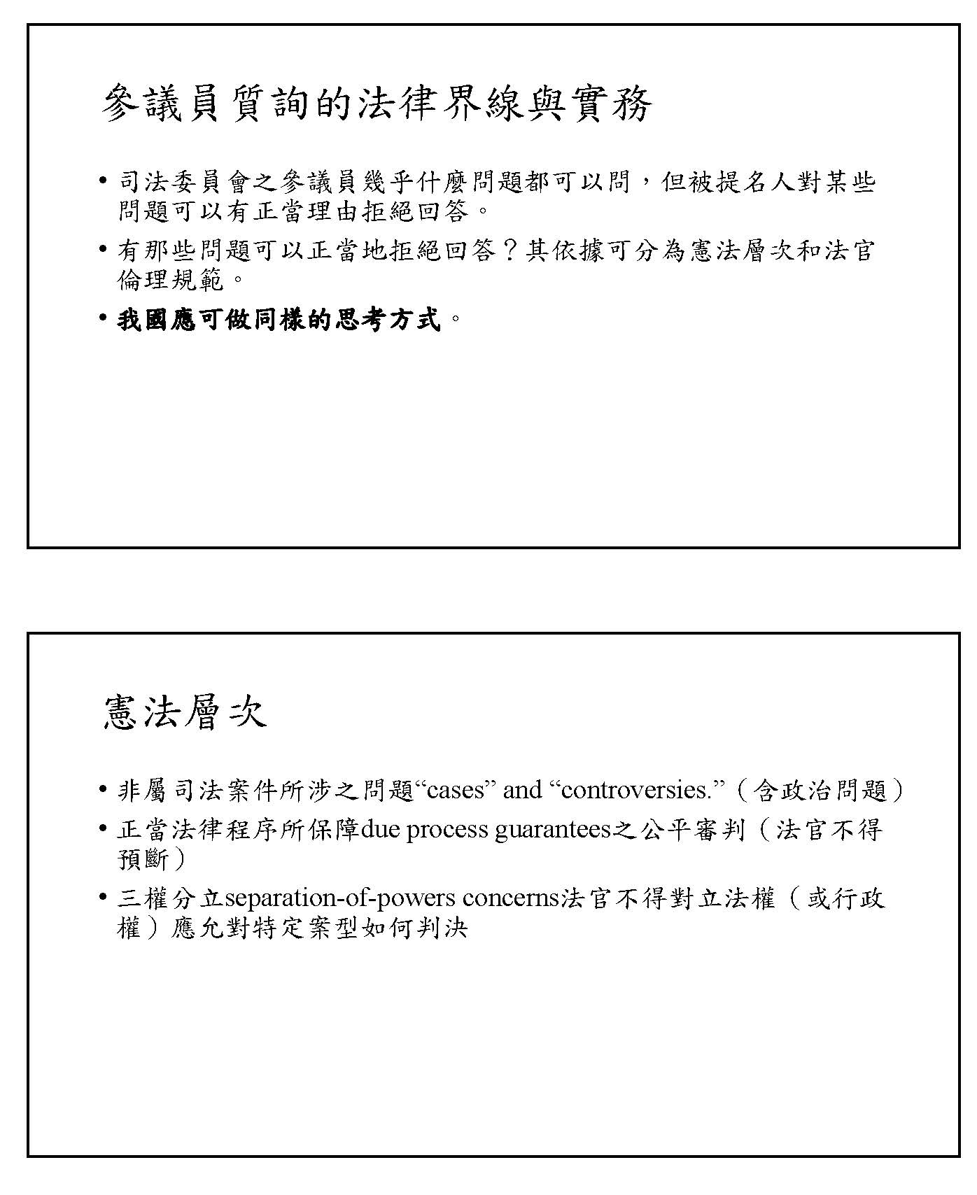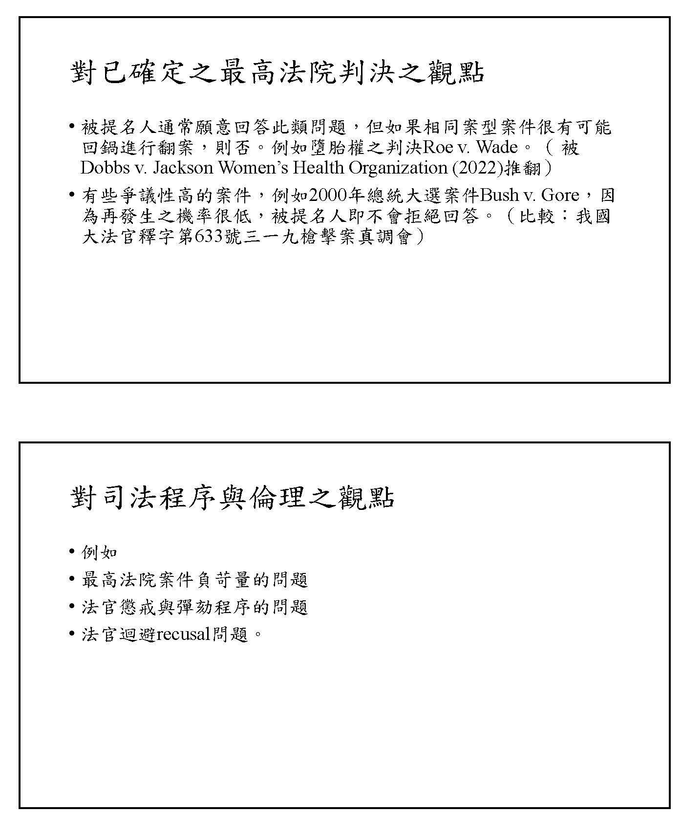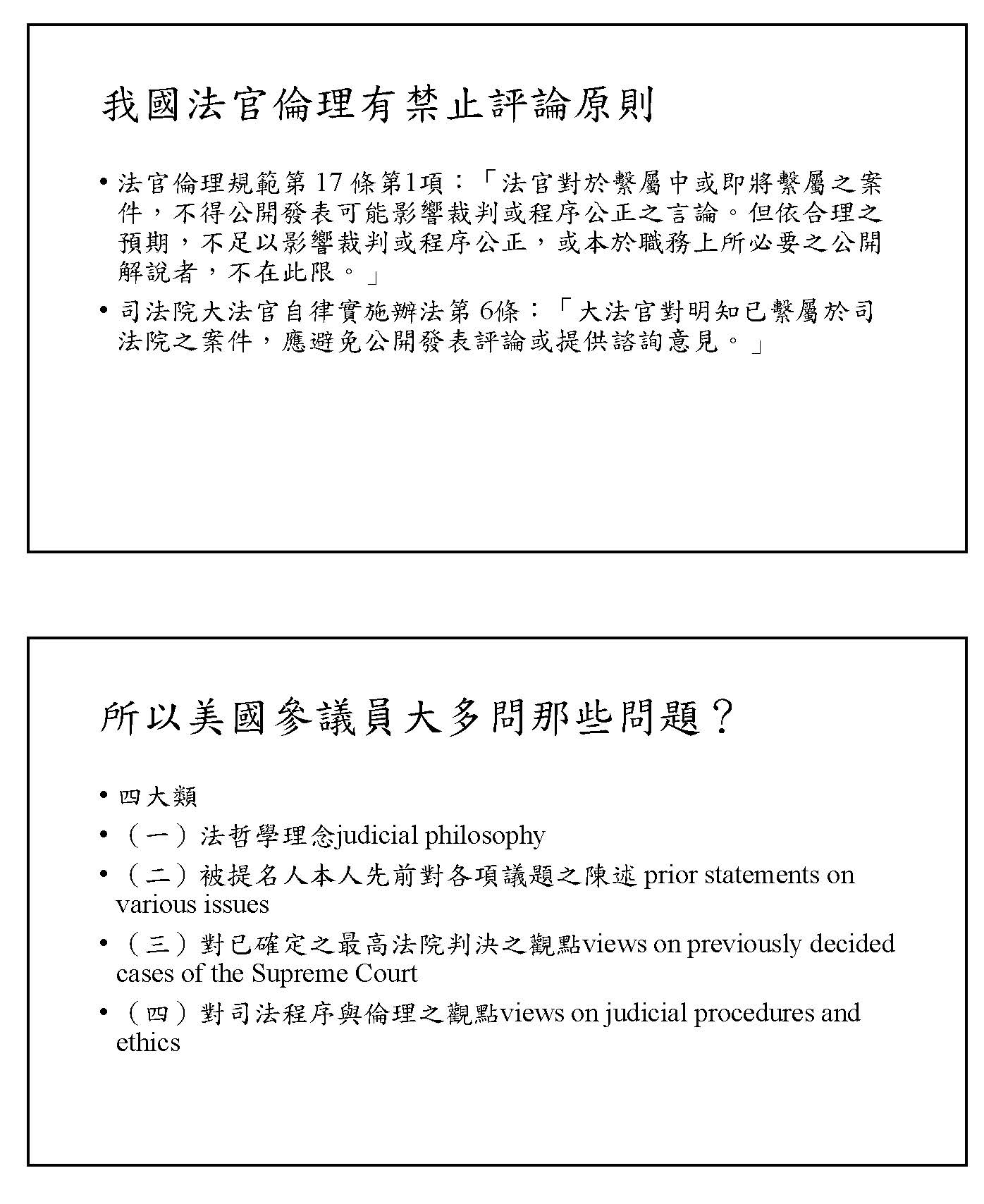 當然這次我們因為時間的關係,可能沒有辦法讓那麼多的人來針對四位被提名人一一做這樣複雜的論述,但是我想我們還是有一些時間可以往這樣的方向處理。所以這次我在來之前,也有收到立法院辦公室詢問,如果要對被提名人提出問題的話,應該要問什麼比較好,如果各位看到我剛剛講到的司法委員會的網站,當時Kagan聽證會的過程包含所有的問題,到現在都還可以在網路上下載,有些參議員問得非常細,甚至要求他提出從他開始工作以來所有在網路上和法學雜誌上發表的論文,然後一一檢視他過去所提出來的一些想法,以及他可能持有的價值觀。我認為如果依照目前總統府提出來的資料,確實很多被提名人都有提出相關著作,但顯然不是所有的著作,因為現在可能還包含網路上的著作,或者是他在一些研討會的發言等等,這可能是更加重要的。