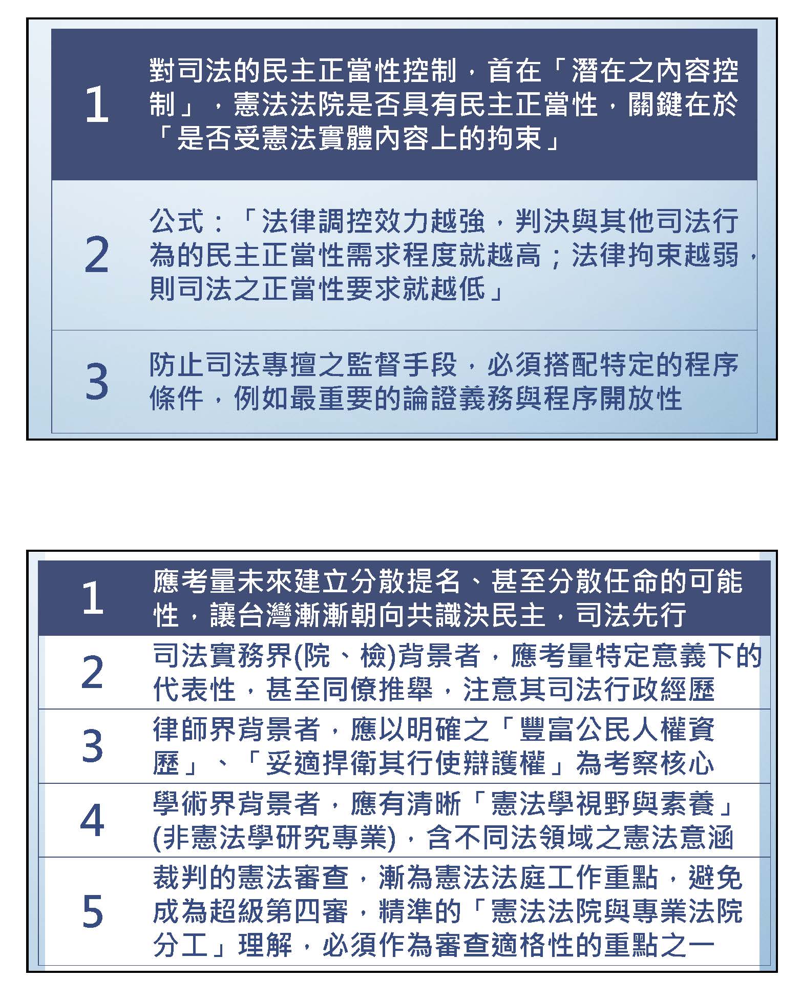另外,有一個特別的地方是,剛才其實也有學者提到,這是憲法訴訟法施行後第一次的大法官提名和審查,針對憲法訴訟化、憲法裁判化之後,各個大法官對於審判實務的運作,特別是個案裁判違憲審查的部分,或是對於現行審理相關程序的意見,應該也可以納為本次審查的內涵之一。因為大法官對於憲法法庭相關運作的形成空間,事實上是大的,這幾位新的被提名人進入之後,有沒有可能進一步形塑大法官的憲法法庭程序及組成,這個是值得觀察的。至於大院審查程序的標準,或是接下來程序的部分,我想一個大前提是真金不怕火煉,我相信四位被提名的大法官其實也很期待能夠有好的機會,為自己好好的平反、說理,而不是一再地受外界的單方指責。所以從這個角度來看,其實在程序上更為完備,給他們更多的時間,是值得考慮和肯定的,但是我也有幾點要提醒,第一個,關於大法官,司法院組織法本來的六款規定,其中有一款是所謂的富有政治經驗、研究法學等等,從這個角度來看,大法官就像剛才陳檢察官所提到的,在提名的時候本來就不可能避免有所謂的政治考量,如果單純地從這個立場或是過去對於政治案件的參與就直接否定,這一點恐怕在說理上是不足的。