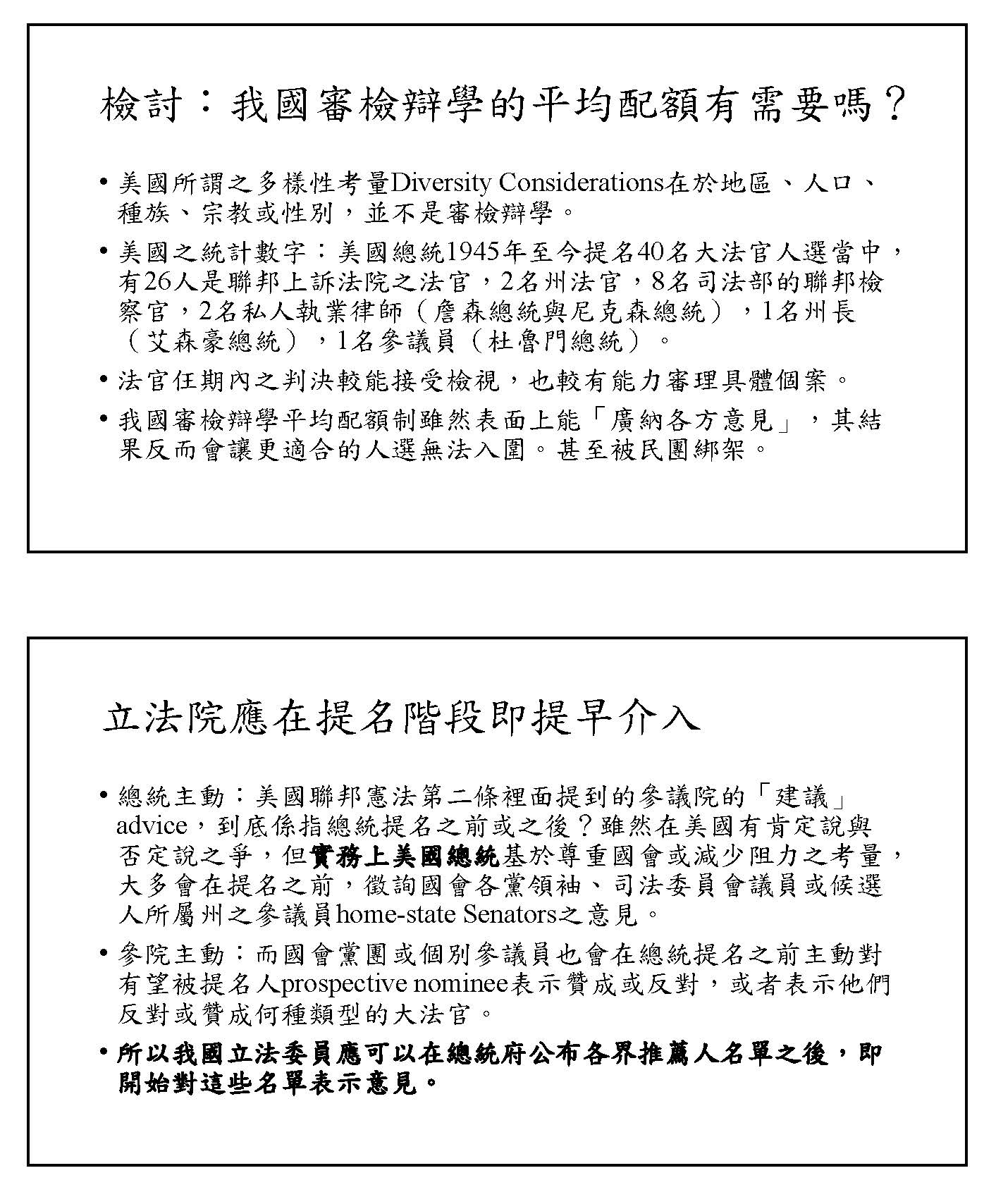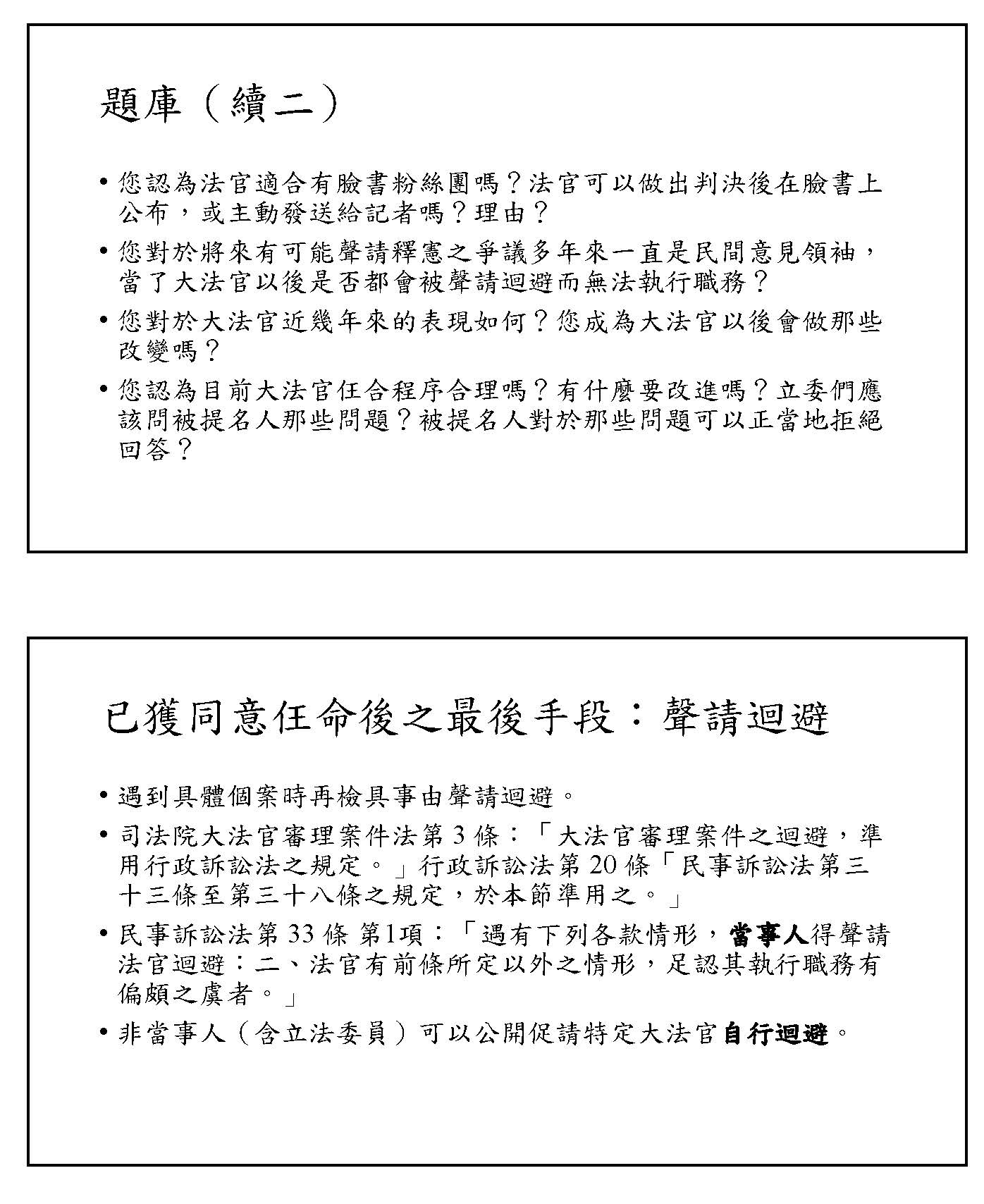 第三個,在採取審查標準的時候,我也要請大院注意到各個不同的被提名人,他們的背景不同,所以拿同一套題目來審查恐怕不是太適當。簡單講就是說,審檢出身的法官跟檢察官在他們的職務過程中,不可能有積極的NGO、政黨或是社會的參與,他們本身就受有限制;或者他們因為業務繁忙,要能有豐富的學術著作,自然而然比起學者或律師來講相對地難度較高。而辯方也就是律師或是學者,因為在執業過程中的自由度比較大,自然而然會有相當多的NGO參與或社會參與,所以在審查標準上或是在提供問題的過程當中,拿一套問題來一體適用恐怕並不是非常適當。