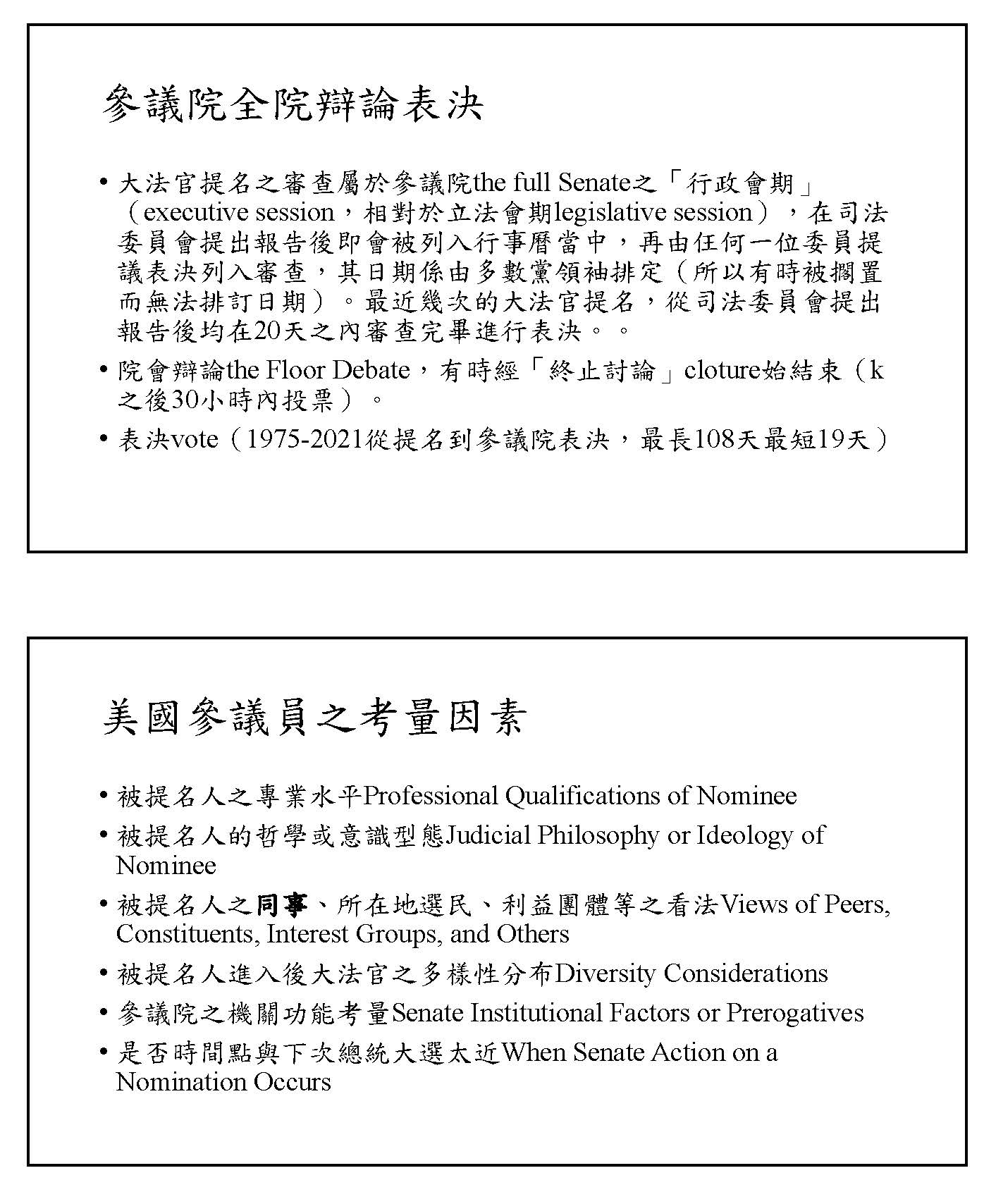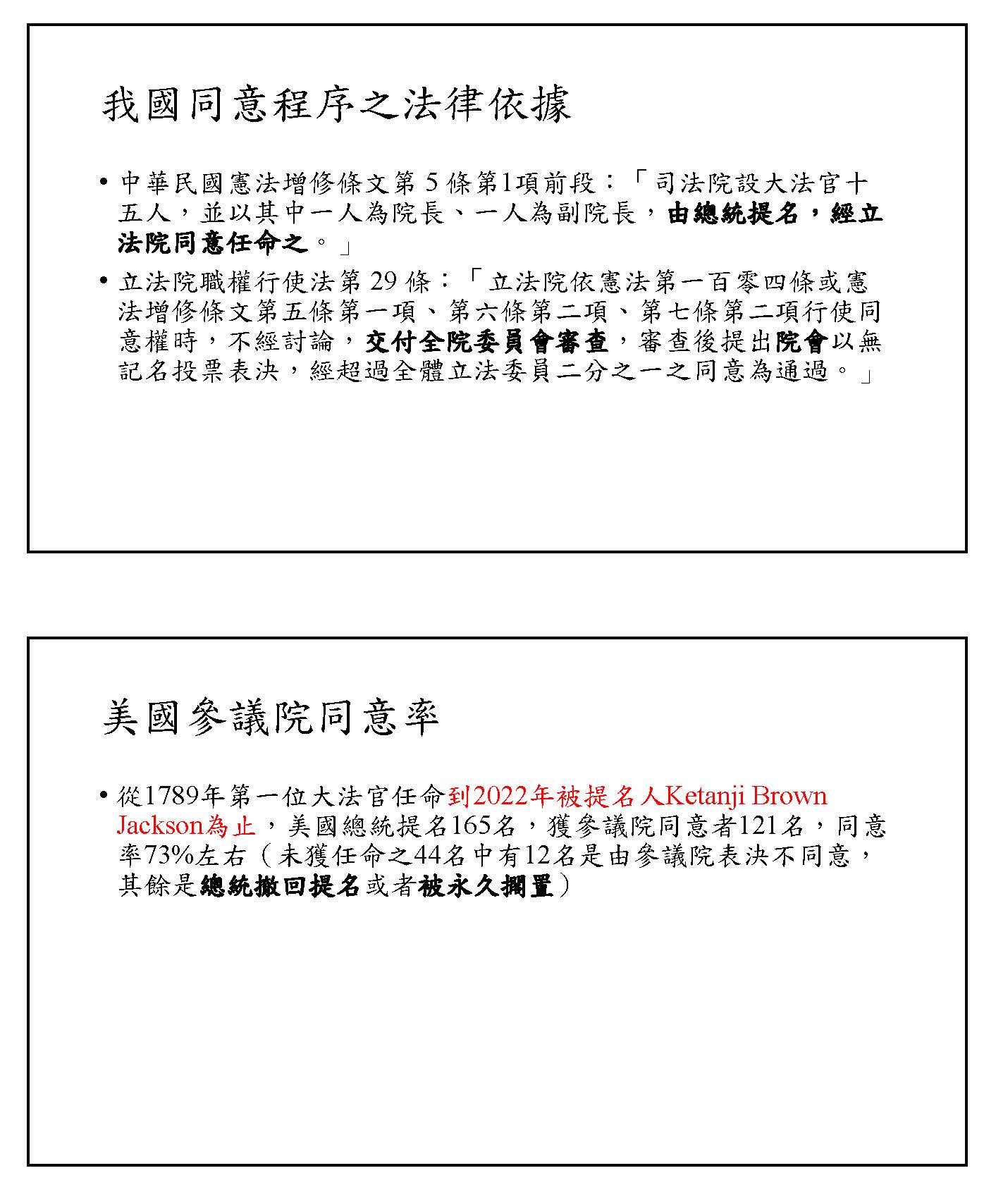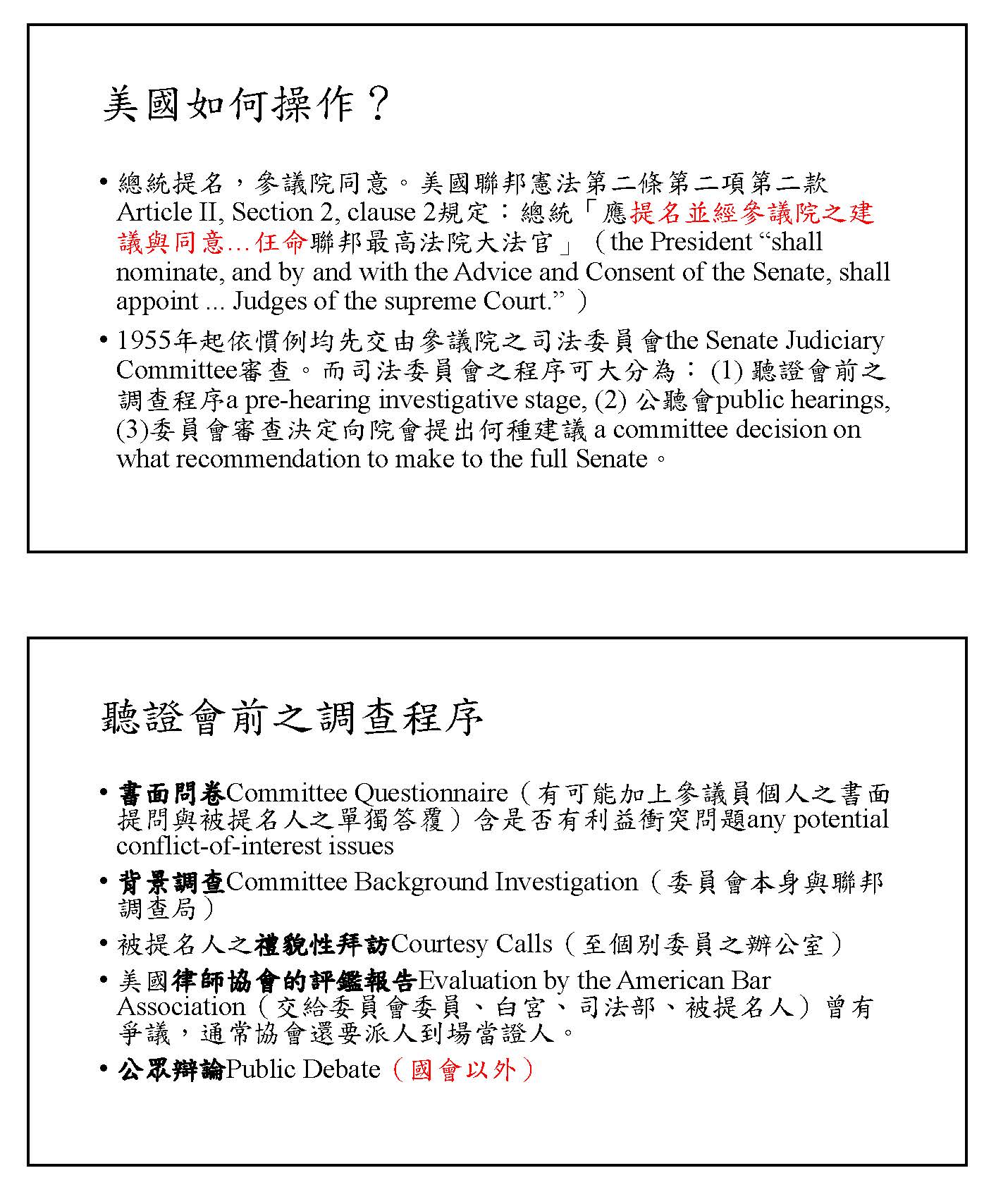我印象中還有委員提到,美國總統在提名大法官的時候,什麼總統不會介入太深之類的,我其實覺得他這個說法可能必須還要再斟酌一下,因為我在美國念書的時候,我其實有認識,也有老師私下說他其實是某人的final three(最後三個),美國總統介入非常深,絕對沒有介入不深的問題。那至於提名人是不是有什麼政治立場,這個當然就更不用說了,就是大家看過去幾次的表決都非常清楚,我敢說大概很少研究美國憲法的學者會說,美國總統介入大法官的選舉不深這件事情,這個我覺得是有點殊難想像,可能有什麼誤會,或是搞不好是我自己聽錯了也不一定。