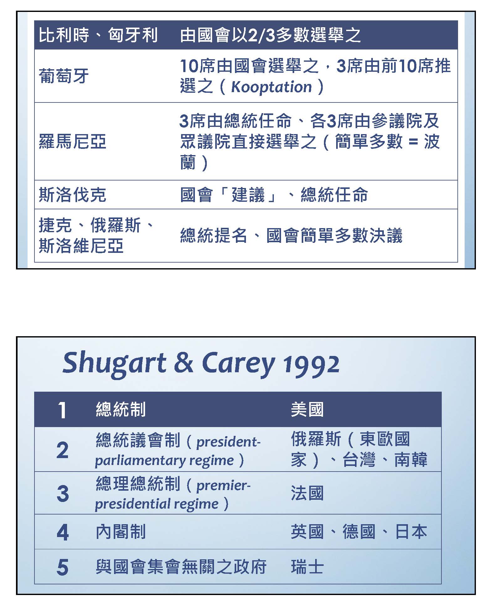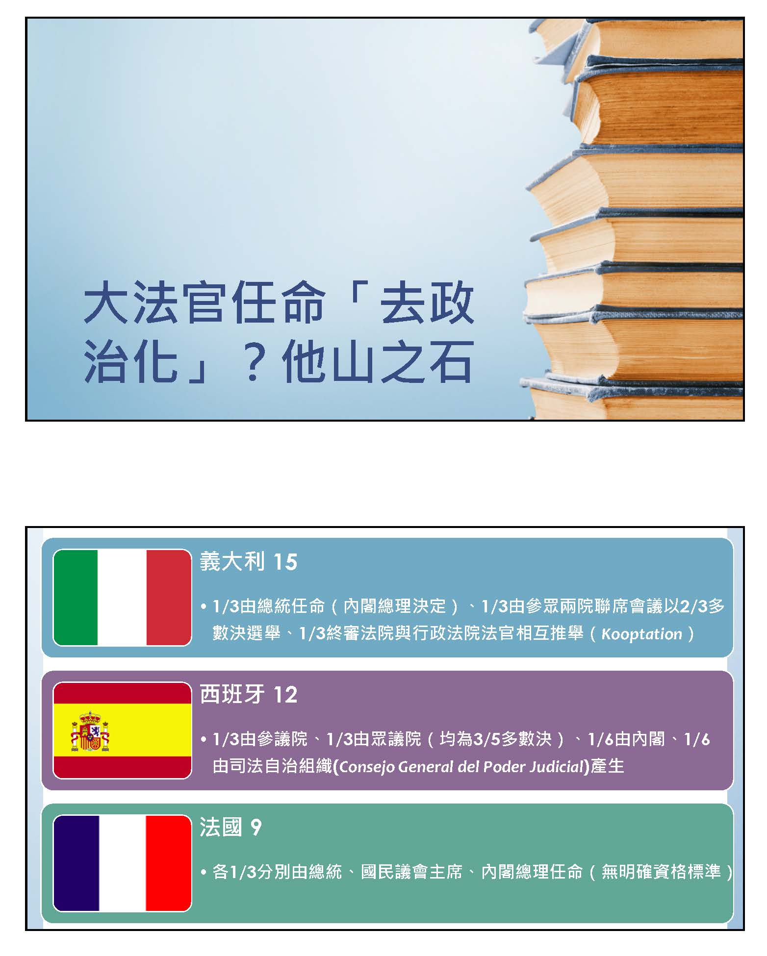 第二個,立法院職權行使法明文講應該將審查重點放在委員會,但委員會的審查真的有發揮功能嗎?其實我個人是打一個非常大的問號。我在此提供一個法國在2008年修憲後的新制度,即縱然共和國總統可以提名三人,但這三人也要到國民議會報告,需要國會審查委員會五分之三的委員不表示反對,才能夠由總統提名;換句話說,縱然總統要提名,在法國這麼尊重總統的國家,也不是讓總統想提名誰就提名誰。這才是我們應該學習的精神,而不是在吵說8年就選了15人,它是不是跟我們比較接近等等,我們應該要用制度的方法解決。