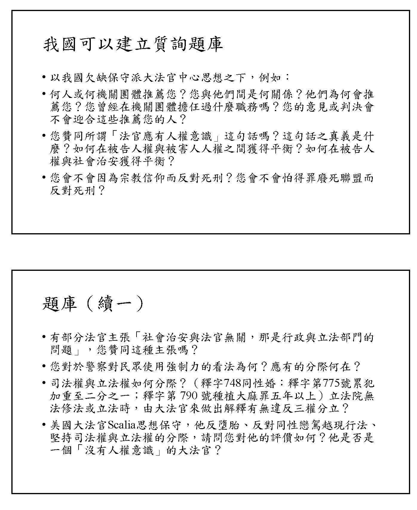 我國可以建立一些質詢的題庫,我發現其實這幾天有很多團體已經提出一些題庫。我稍微演練了一下,如果我們認為目前我國欠缺的是保守派法官的話,我會問哪些問題。第一個,我們一定要問被提名人:為什麼在這麼多人當中,總統會看上你?誰推薦你?你跟推薦人有哪些關係?將來你在大法官裡面,會不會被這些團體所左右?這是我們關心的。再來,所謂法官要有人權意識,到底是在講被害人,還是講被告?你如何獲得一個平衡?你對於死刑的看法怎樣?你是因為宗教,還是因為廢死聯盟?你會不會被怕得罪廢死聯盟?有些法官認為社會治安與法官無關,那是行政部門的問題,對於這些講法,你的看法是怎樣?還有警察使用強制力的分際為何,民眾的權利與社會治安之間要如何平衡?大法官過去有一些解釋幾乎已經取代了立法院,他可以講目前這個法律是不對的,不一定還要幫立法院定出條文,但是我們有些大法官其實已經做到這樣子,對於這一點,你是贊成或不贊成?這些都是將來他們當大法官的時候的一些問題。此外,目前很多法官自己有臉書,動不動就請記者介紹他的判決,這樣到底對不對?因為在這種風氣之下,法官的獨立性會喪失掉,他會隨著社會變成衝浪者,他本來是一個造浪者才對,結果變成衝浪者,這樣好不好?像類似這種問題,我們覺得可以好好地去發揮。