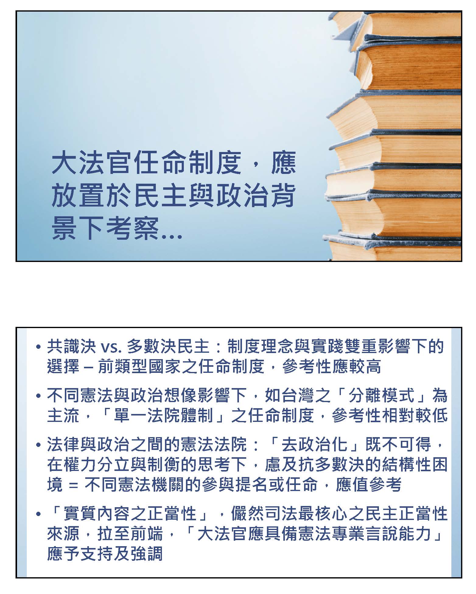 最後針對所謂政治問題不審查為原則,剛才其實有很多先進已經提到了,政治部門自己不能解決的問題,我是認為不要期待,坦白說在民主正當性某種程度是需要靠多數的大法官來做回答,這其實是一個很大的危險,當然大法官的提名或許遺珠難免,但是就像我提到的,明年其實也還會有一次提名的機會,我想關鍵還是針對這四位大法官是否適任、能不能夠維持自由民主憲政秩序的價值來做審查會比較適當,以上。