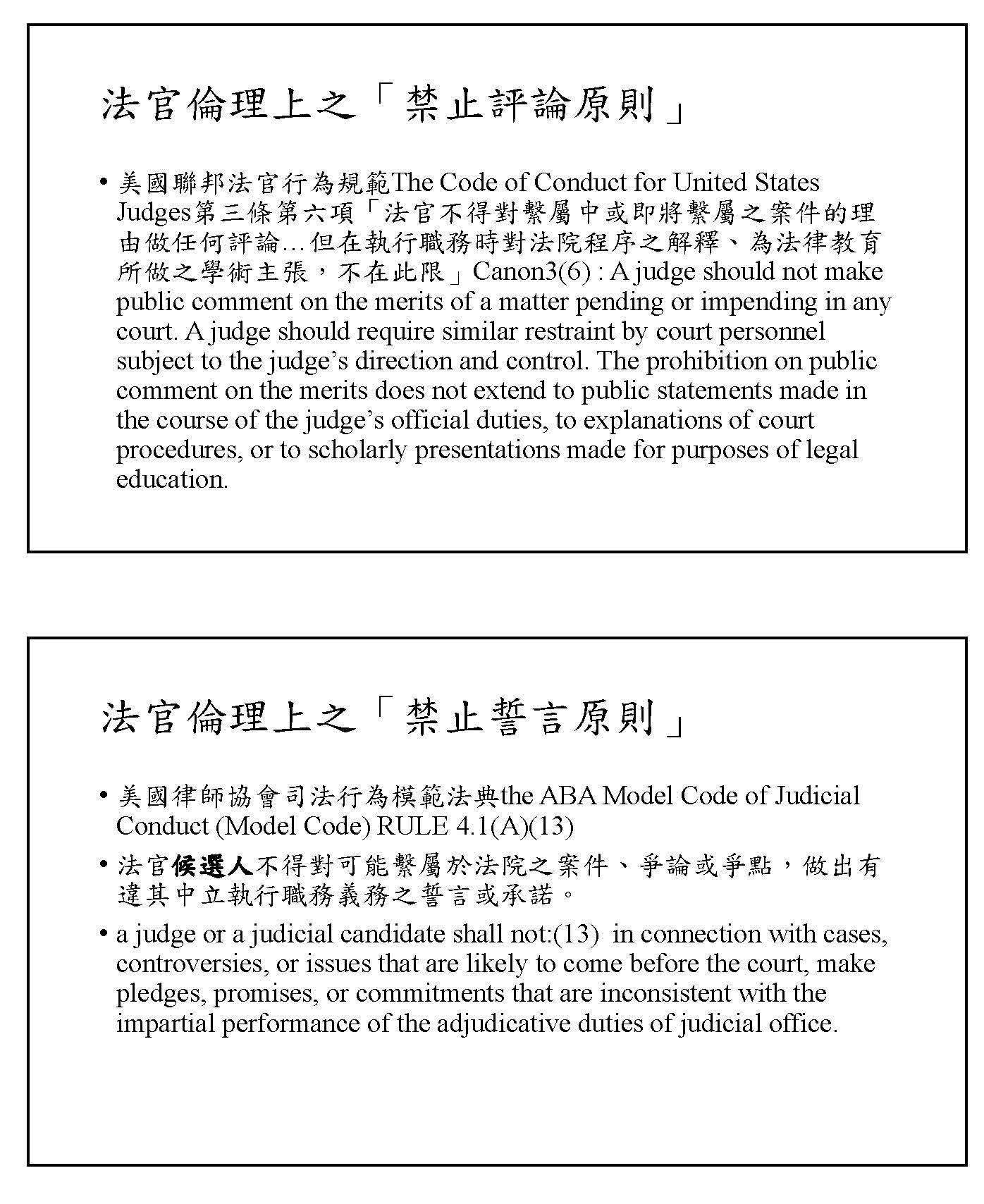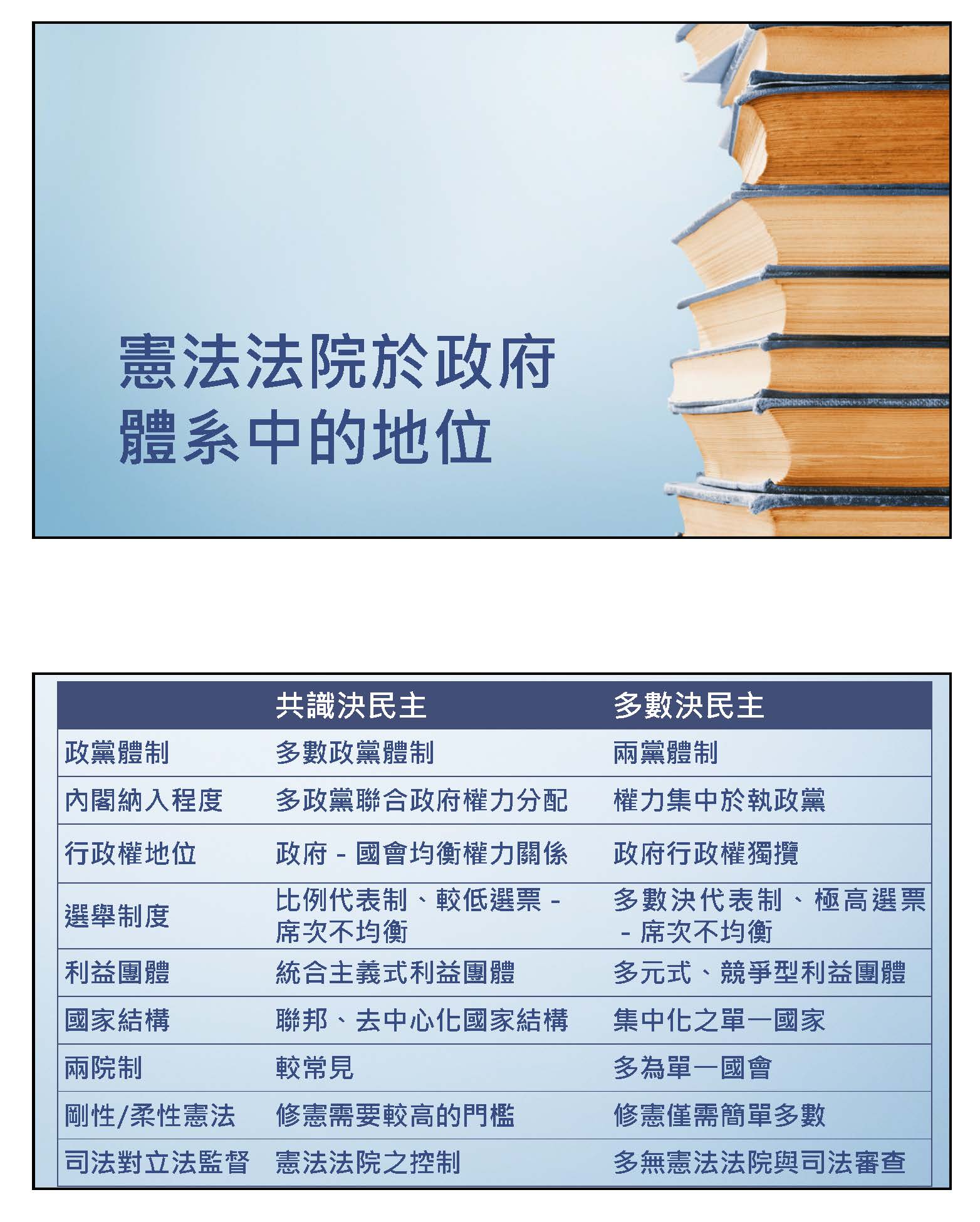 第二個、關於我國司法院大法官釋憲制度的沿革,歷經了三次主要訴訟法上的修改,從早期民國37年制定的司法院會議規則,它不是經過立法,到之後的司法院大法官會議法,再到1993年開始行使非常久的大審法,即大法官審理案件法,一直過渡到最近的憲法訴訟法,總共經過四次訴訟法上的過渡。從過去程序上的不完備一直過渡到現在,包含像過去第371號解釋,就是宣告大審法第五條第二項違憲,由一般普通法院的法官也可以進行司法審查;還有第599號解釋作成暫時處分等等,這些程序都已經完備,未來大法官在形式上,有關過去程序上的不備可能就已經比較完整。但是相較於我國跟立憲主義主要各國比起來,以下幾點可以提供立法院委員參考。