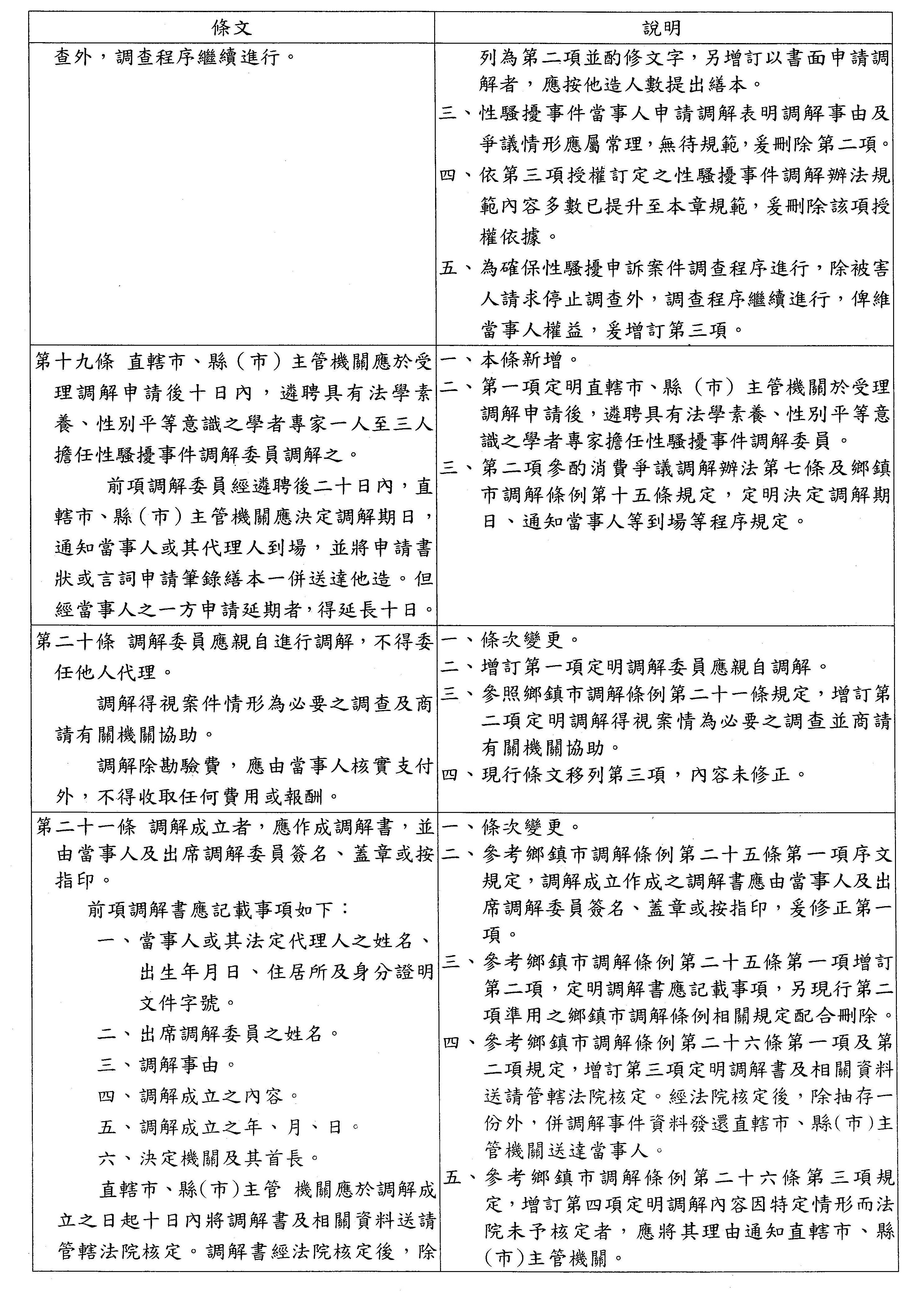 第十八條 權勢性騷擾以外之性騷擾事件,任一方當事人得以書面或言詞向直轄市、縣(市)主管機關申請調解。政府機關(構)、部隊、學校及警察機關於性騷擾事件調查程序中,獲知任一方當事人有調解意願時,應協助其向直轄市、縣(市)主管機關申請調解。