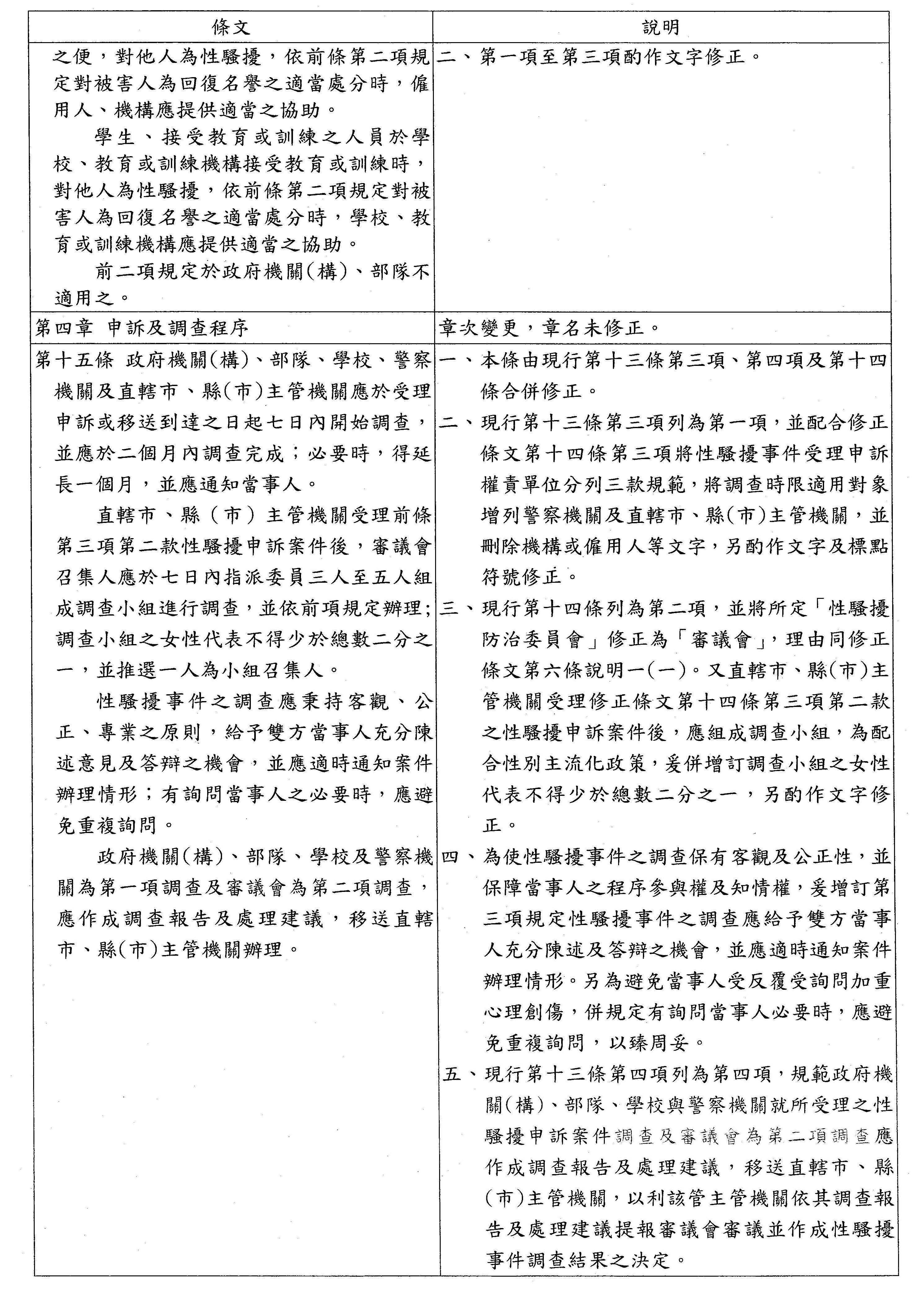 第 九 條 政府機關(構)、部隊、學校、機構、僱用人對於在性騷擾事件申訴、調查、偵查或審理程序中,為申訴、告訴、告發、提起訴訟、作證、提供協助或其他參與行為之人,不得為不當之差別待遇。